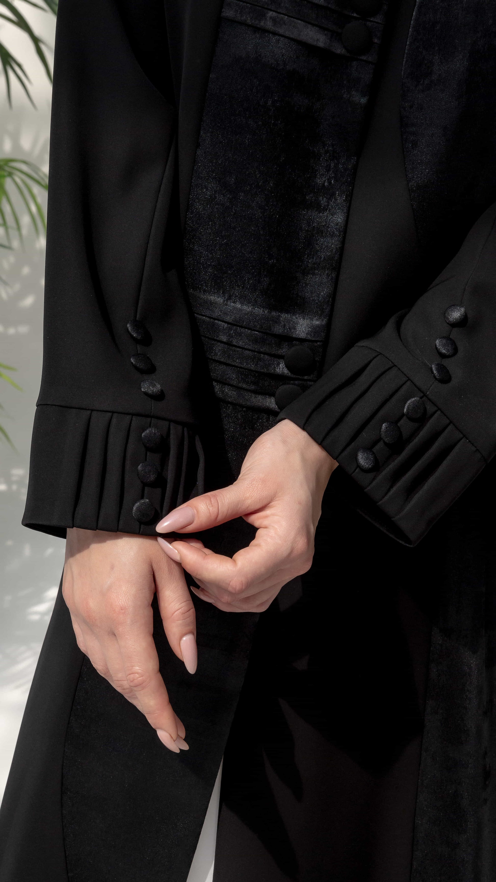 Bold interplay of curves and layers, blending classic black with contemporary artistry with the luxurious velvet accents across the front