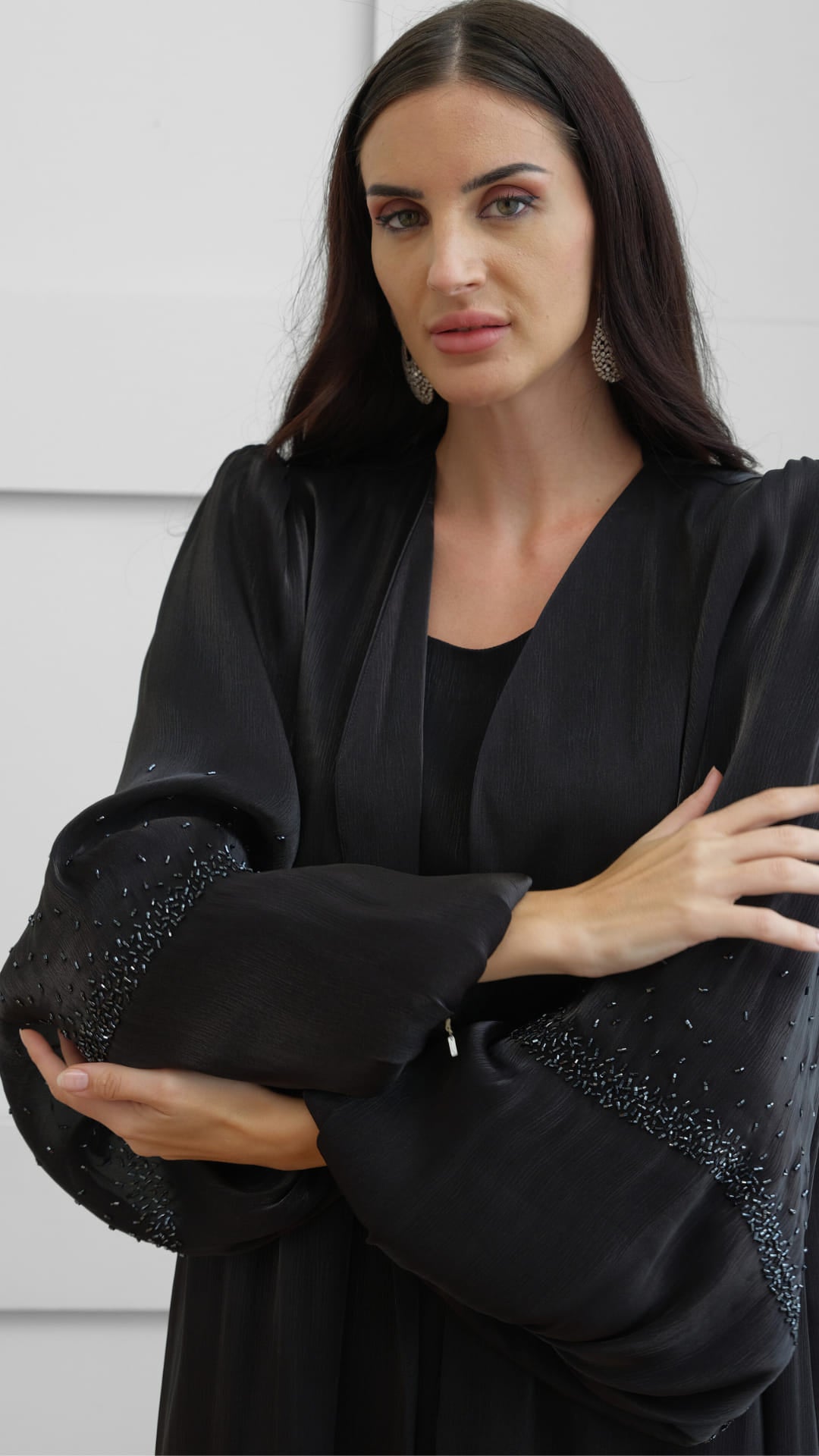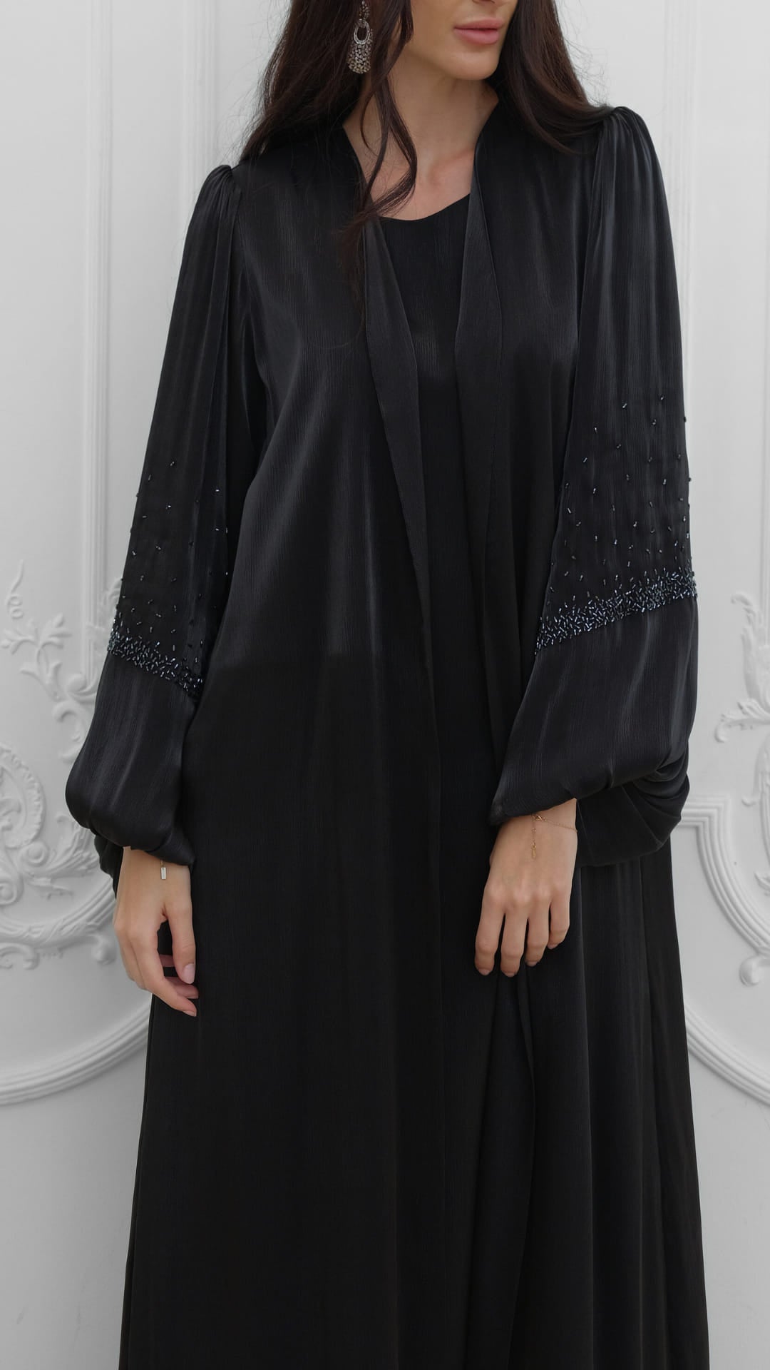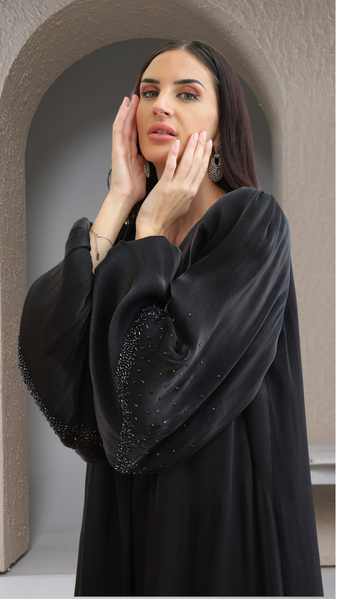 تُظهر هذه العباءة الأثيرية بستائرها الحالمة، وتموجاتها الناعمة، ولمسة جريئة من الخرز والترتر، أناقة خيالية منتفخة.