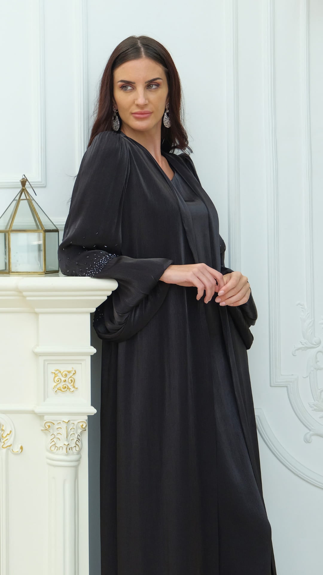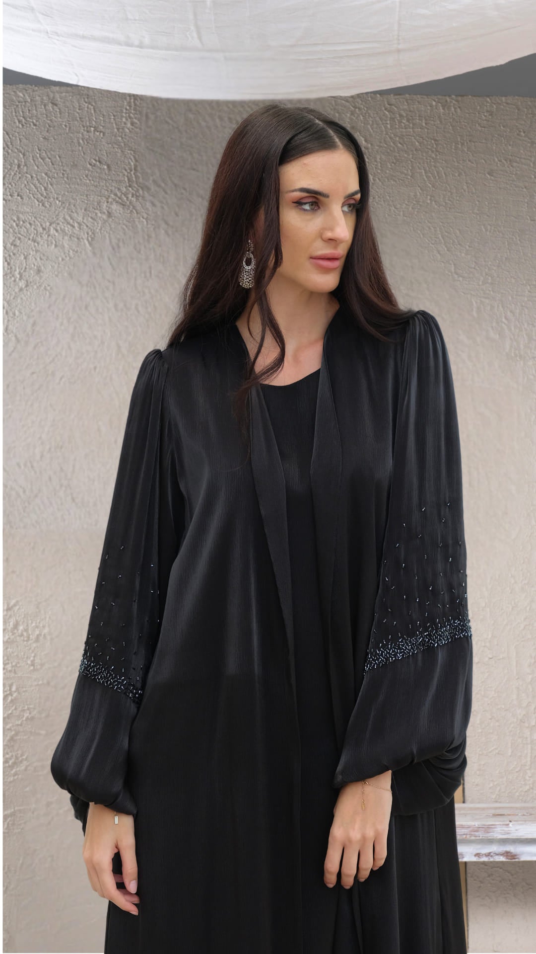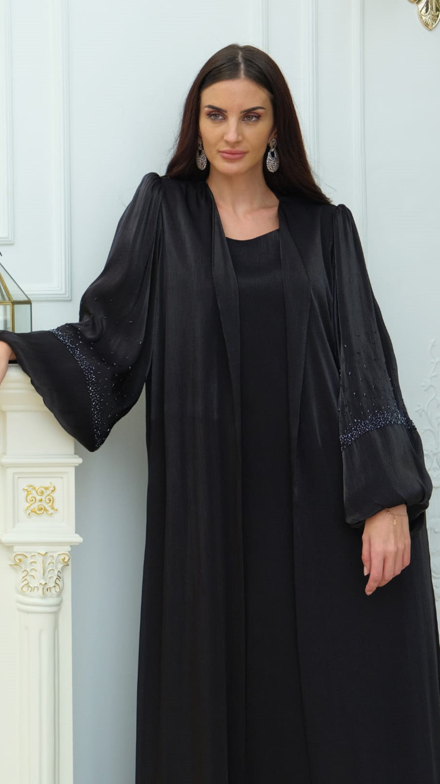 تُظهر هذه العباءة الأثيرية بستائرها الحالمة، وتموجاتها الناعمة، ولمسة جريئة من الخرز والترتر، أناقة خيالية منتفخة.