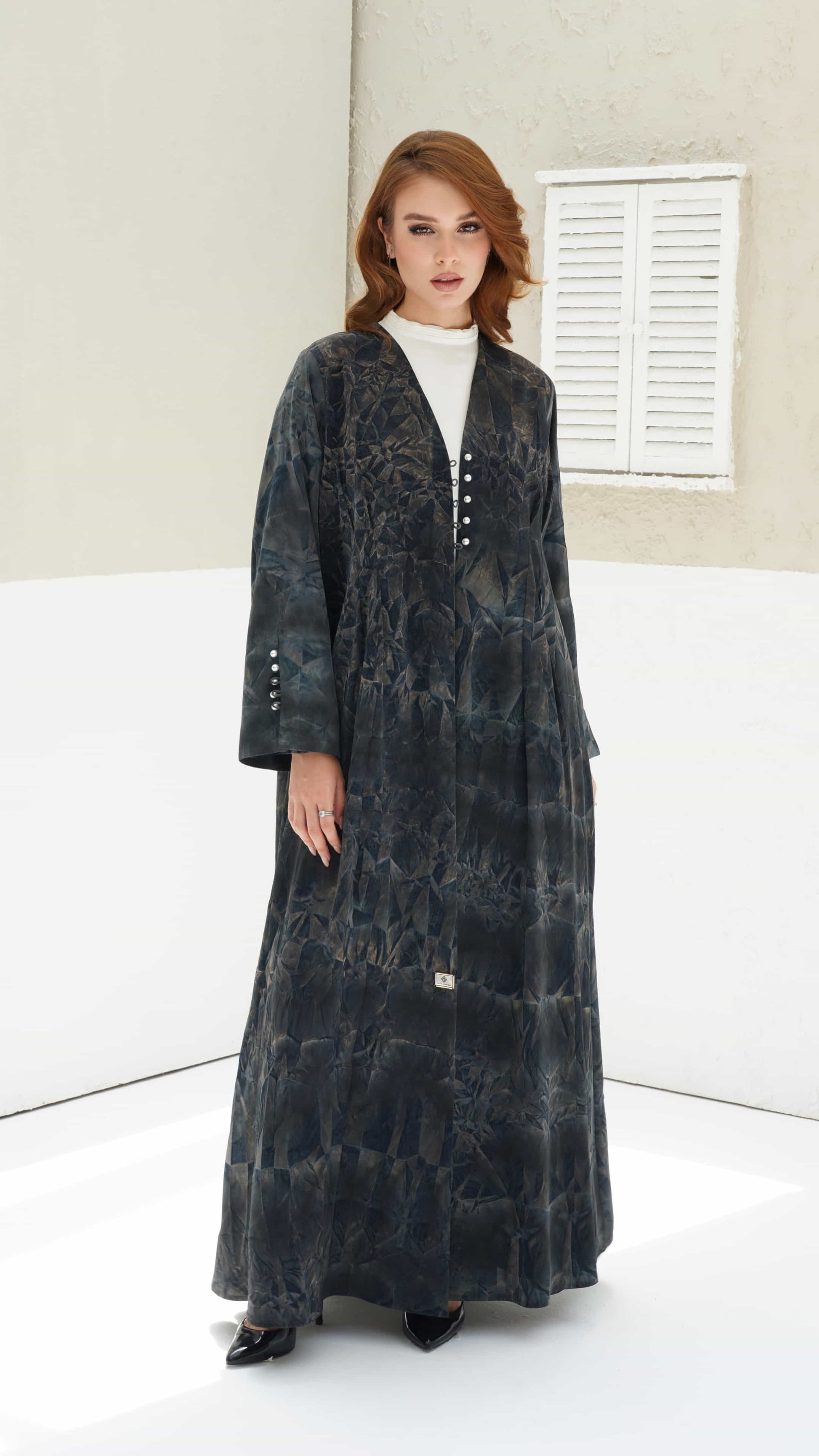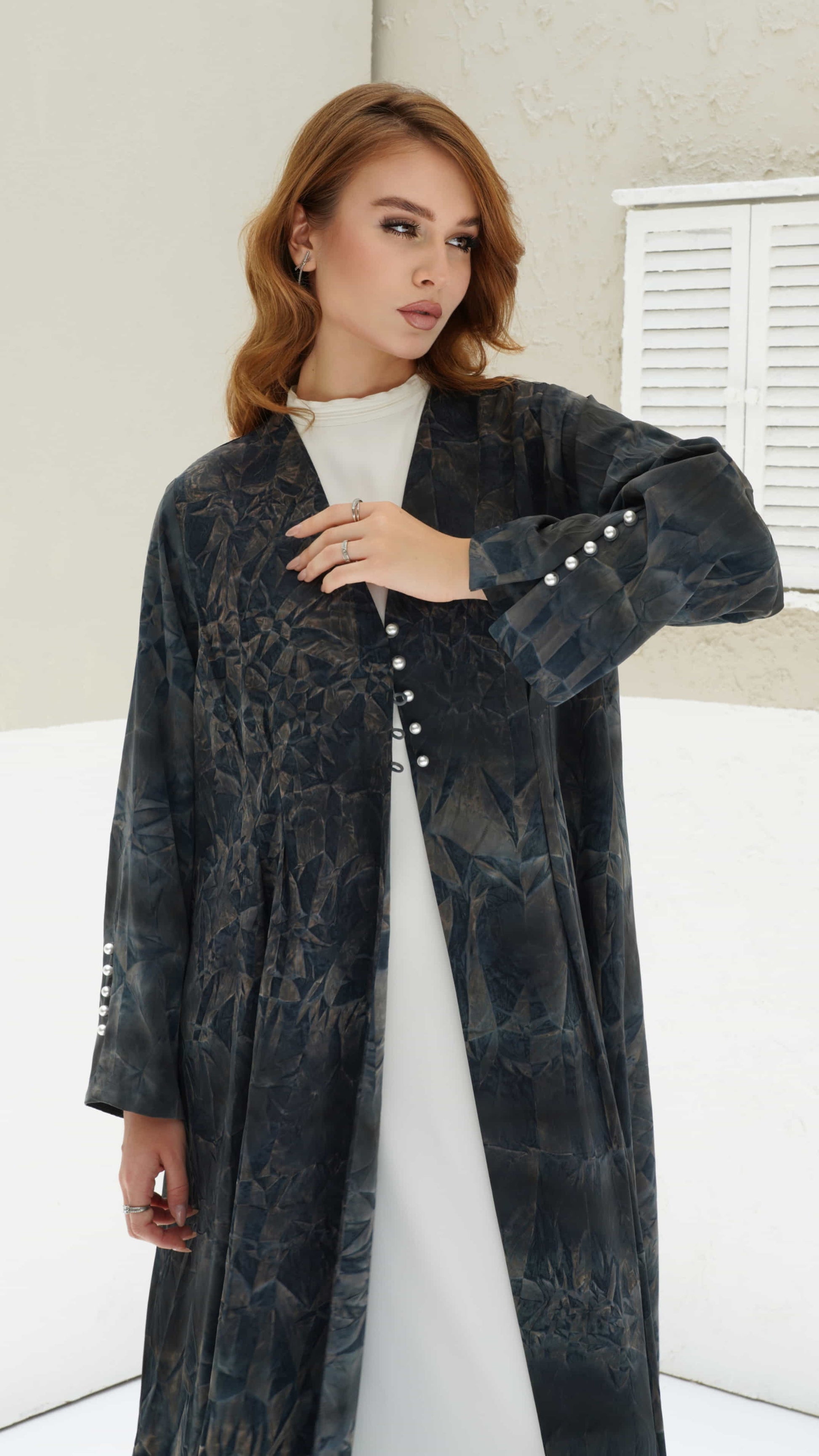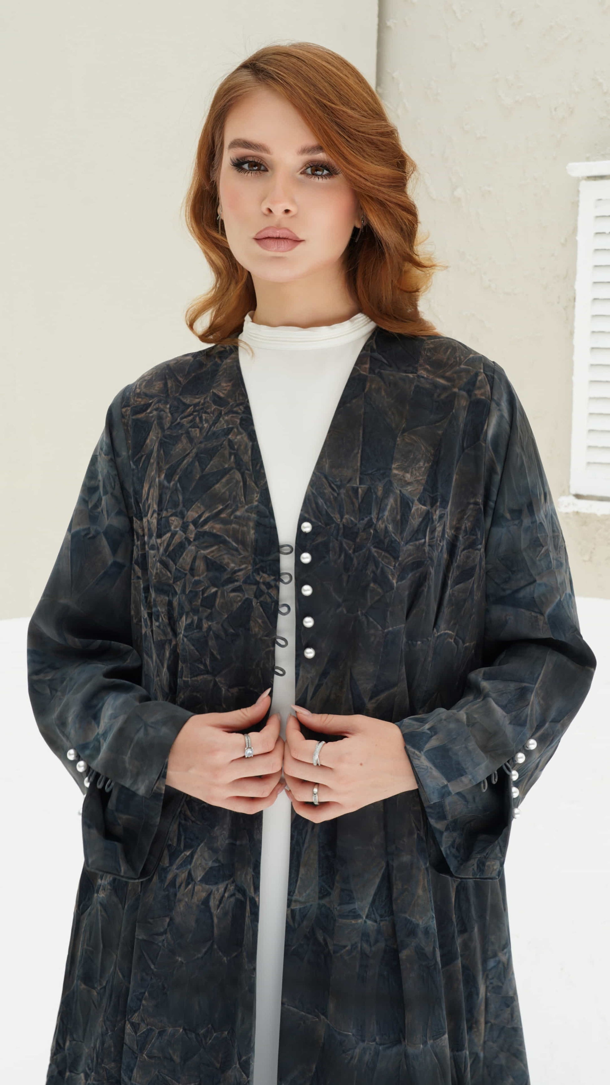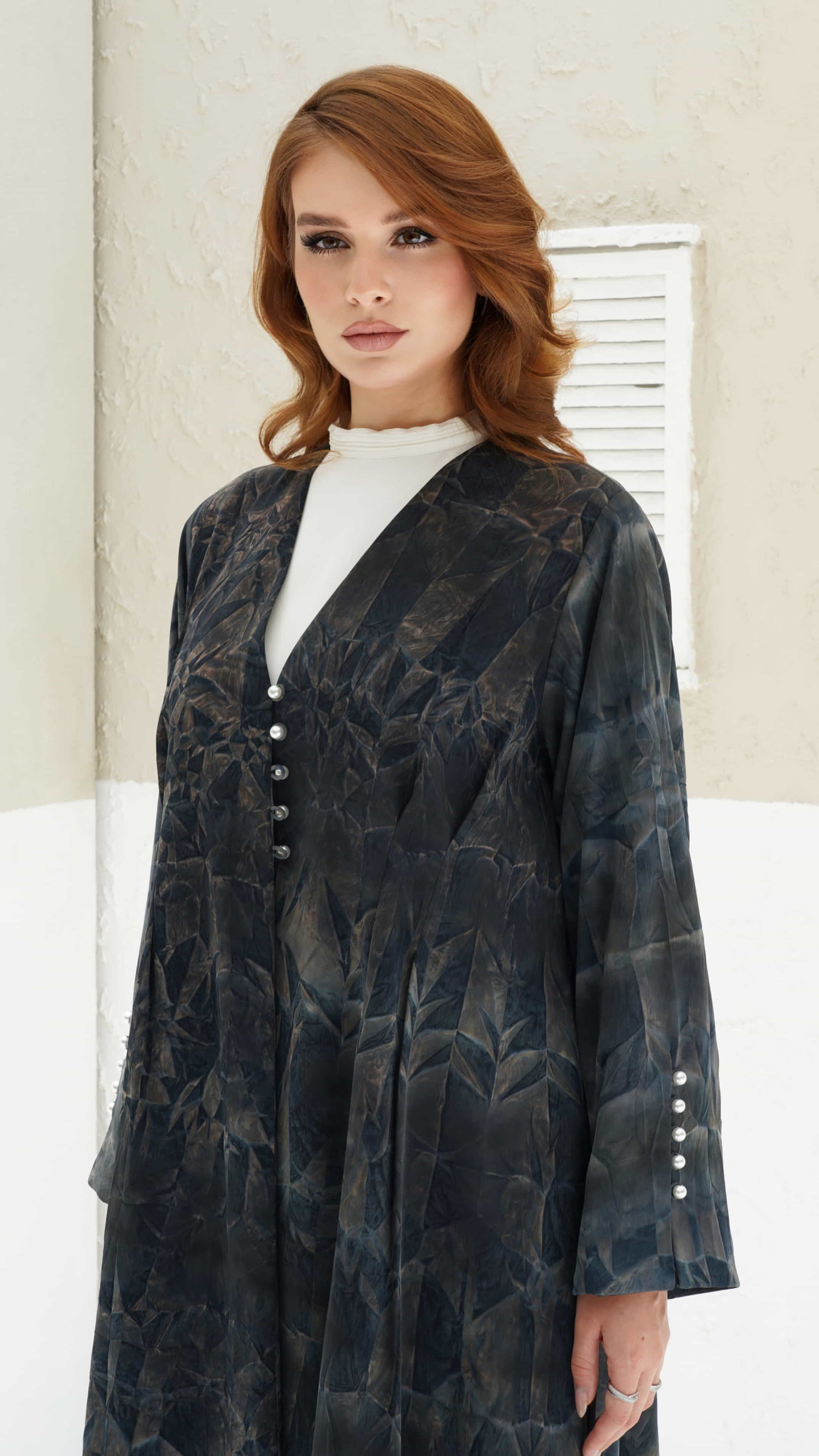 قماش غني بطبعات تجريدية بألوان داكنة 🌌 عباية فايزة مزينة بأزرار لؤلؤية ⚪ على أزرار الأكمام الأمامية، مع طيات انسيابية عصرية 💫