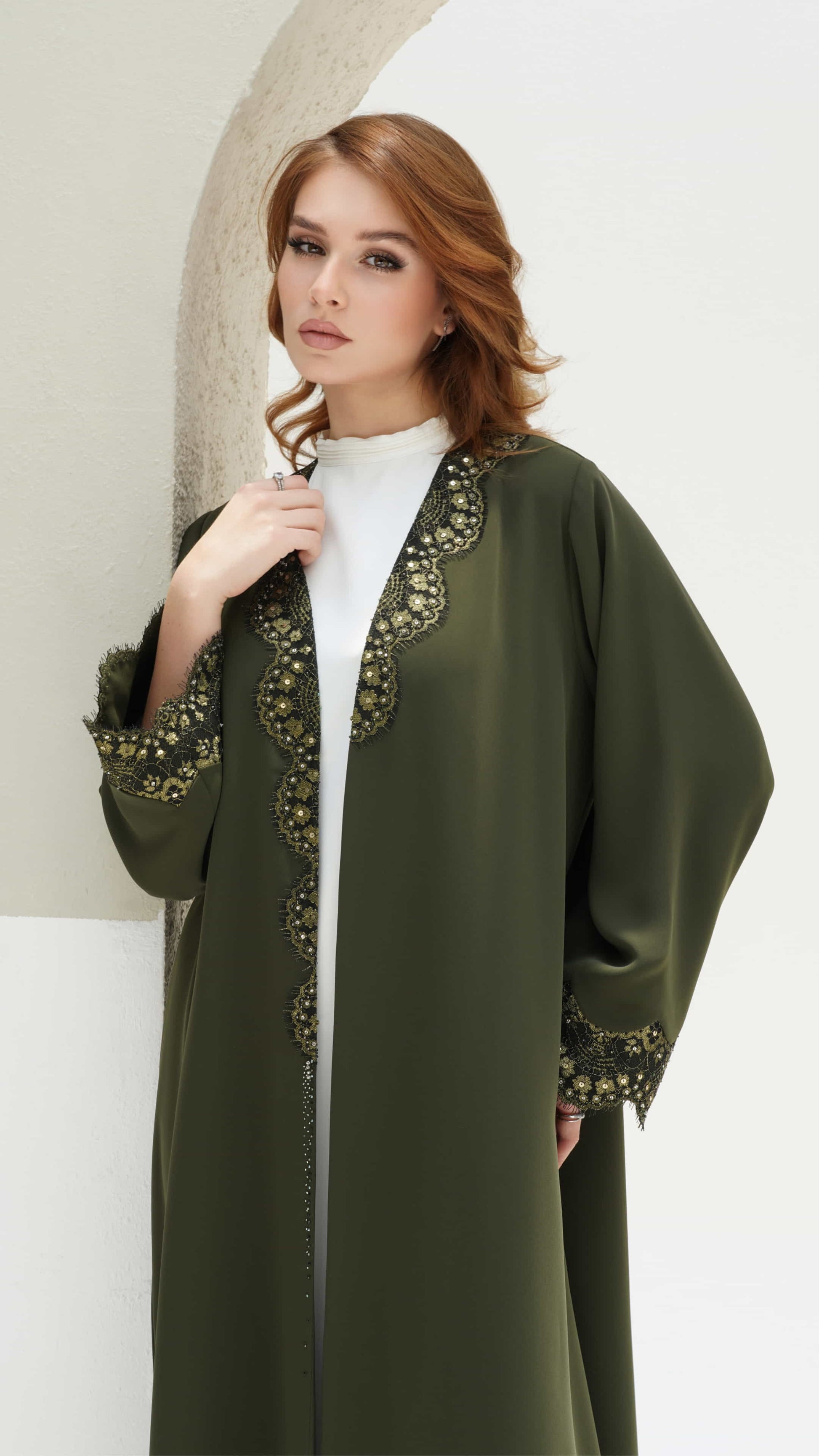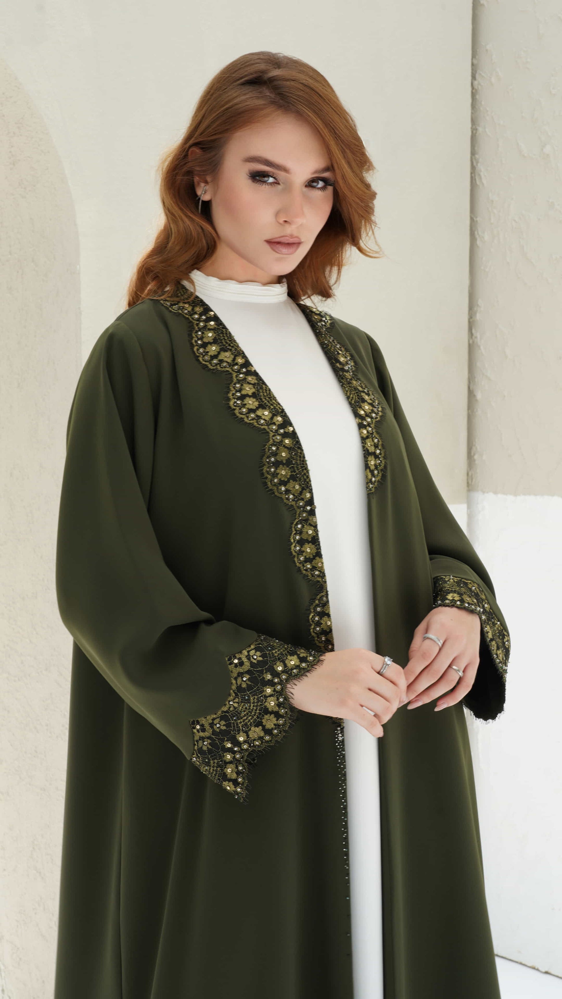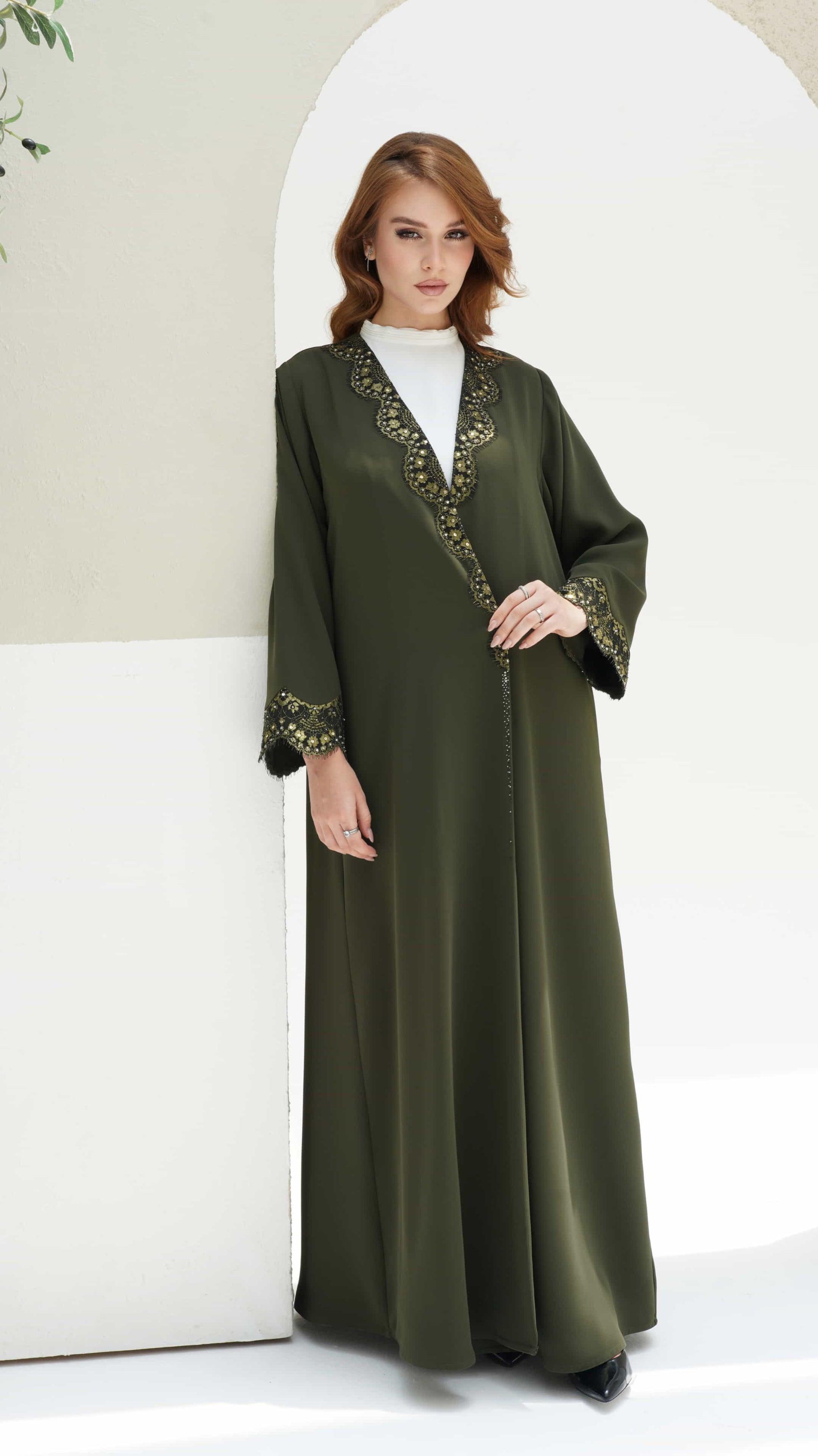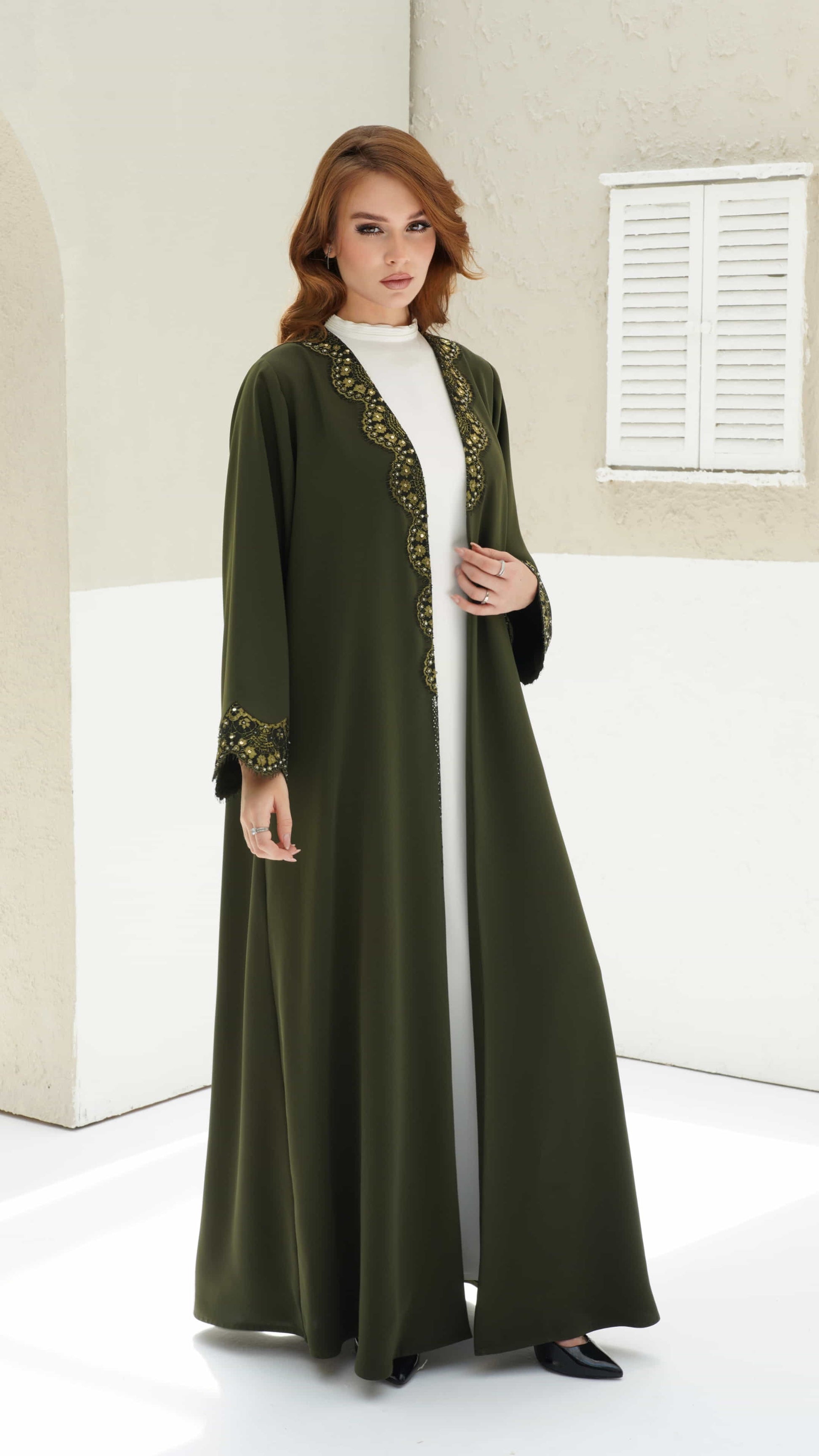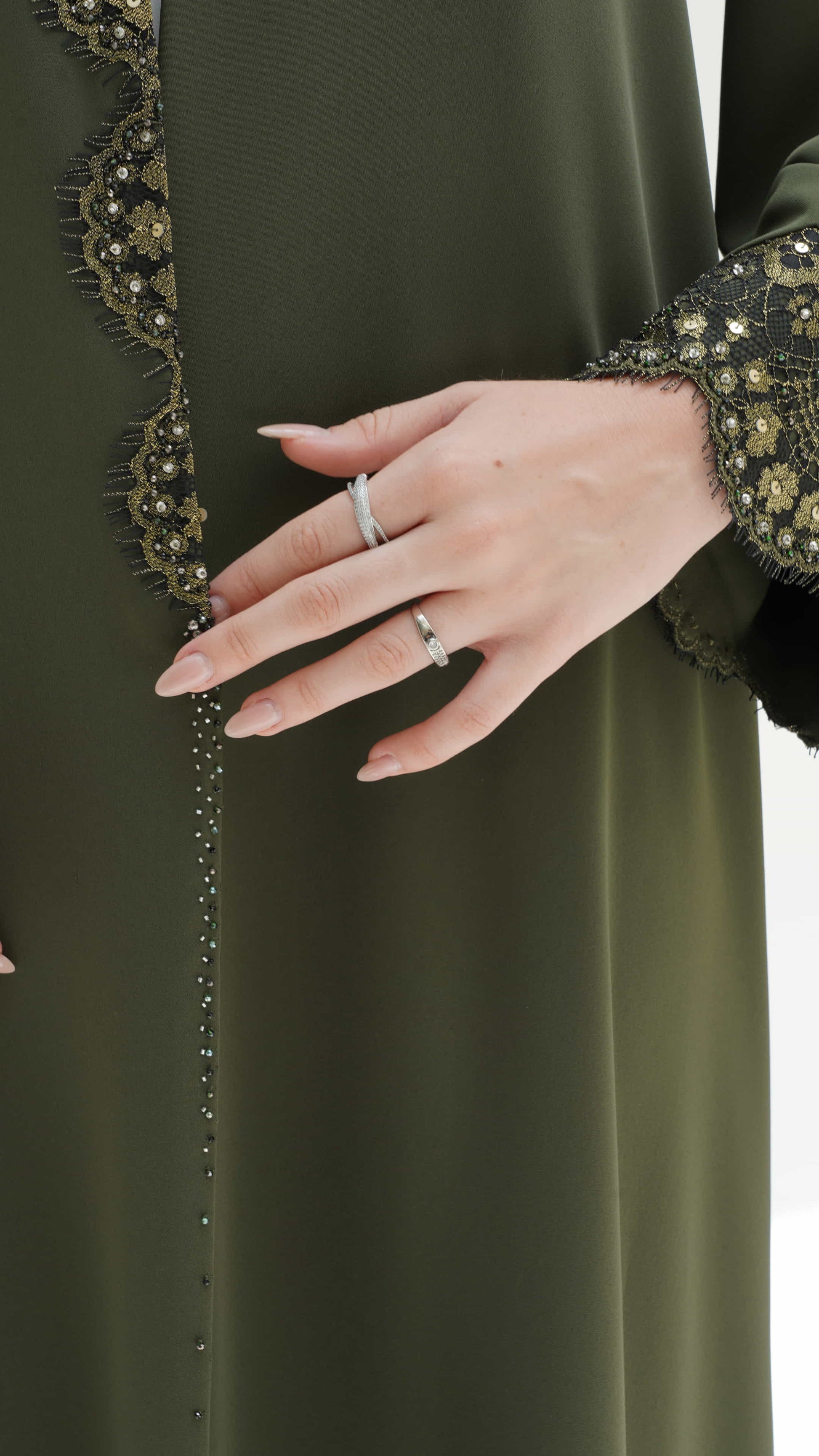 Farida is an olive-green abaya 💚 adorned with intricate golden floral embroidery and delicate black lacework 🖤 embellished with shimmering sequins that shimmers 💎, commanding grace as it drapes flawlessly, a true statement of sophistication and allure ✨