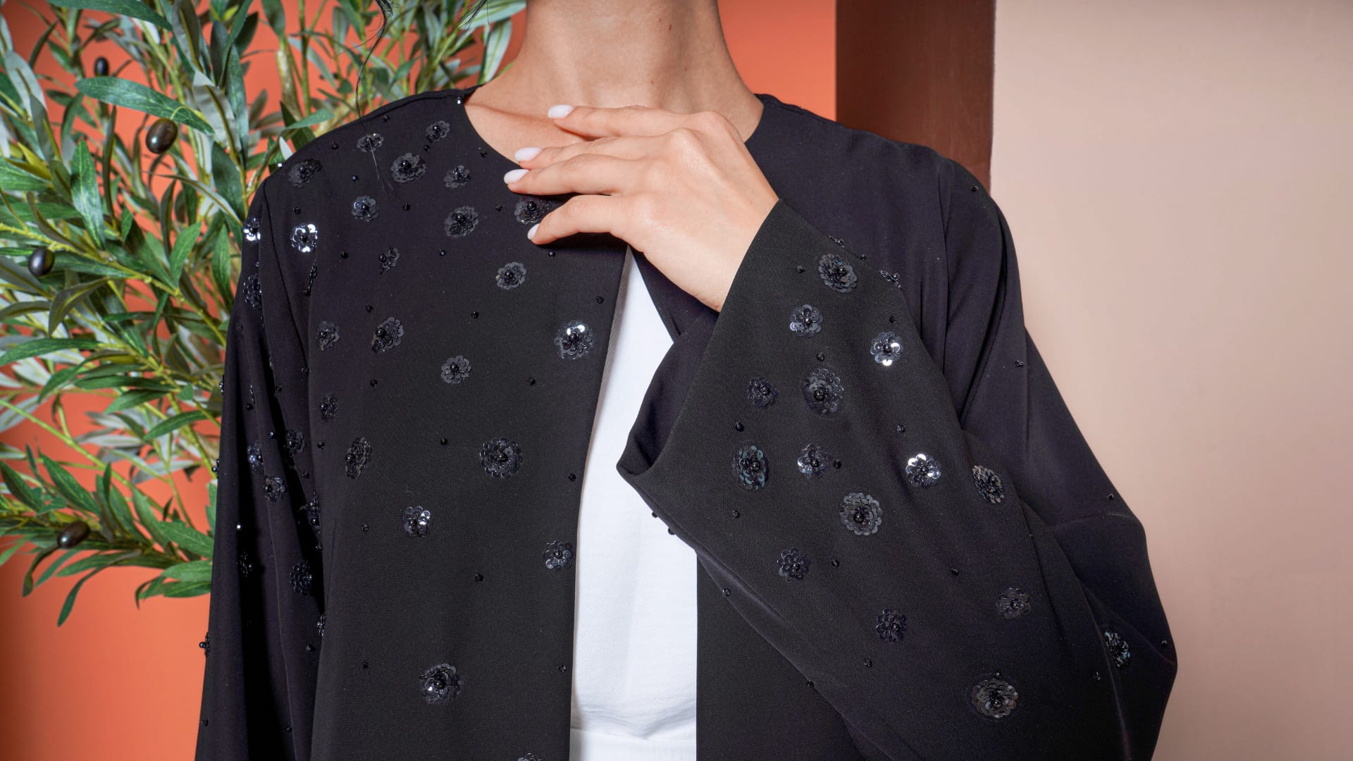 براعة لا تشوبها شائبة في اللمسات الدقيقة للزخارف الزهرية المزينة باللؤلؤ اللامع، تضفي على هذه العباءة لمسة من الرقي الخالد