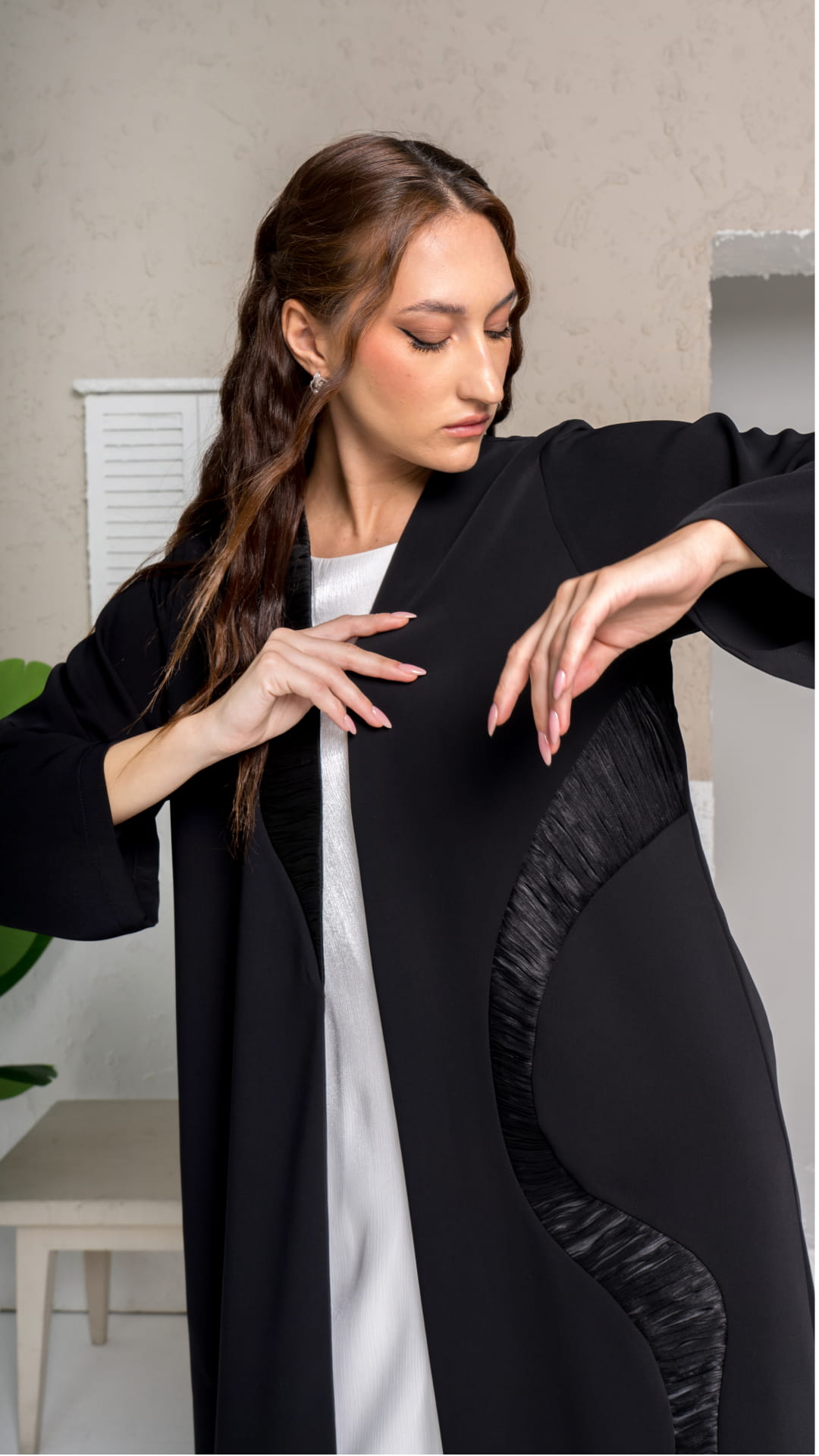 Elevate your elegance with Inaya, with a touch of minimalism in the ultra-modern luxe black abaya, a perfect blend of innovation and timeless style, designed for the modern woman who values class and versatility.