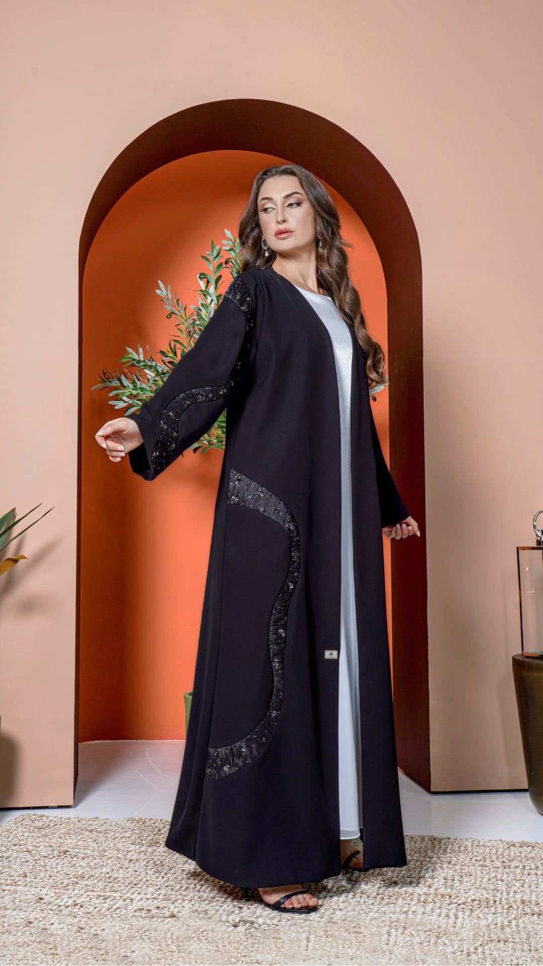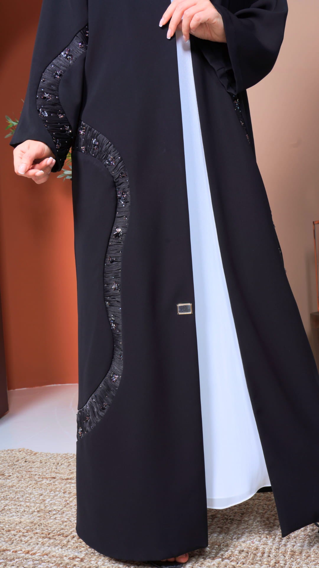 Captivate the attention you deserve with the perfect craftsmanship in the waves of luxury embellishments on this stylish black abaya