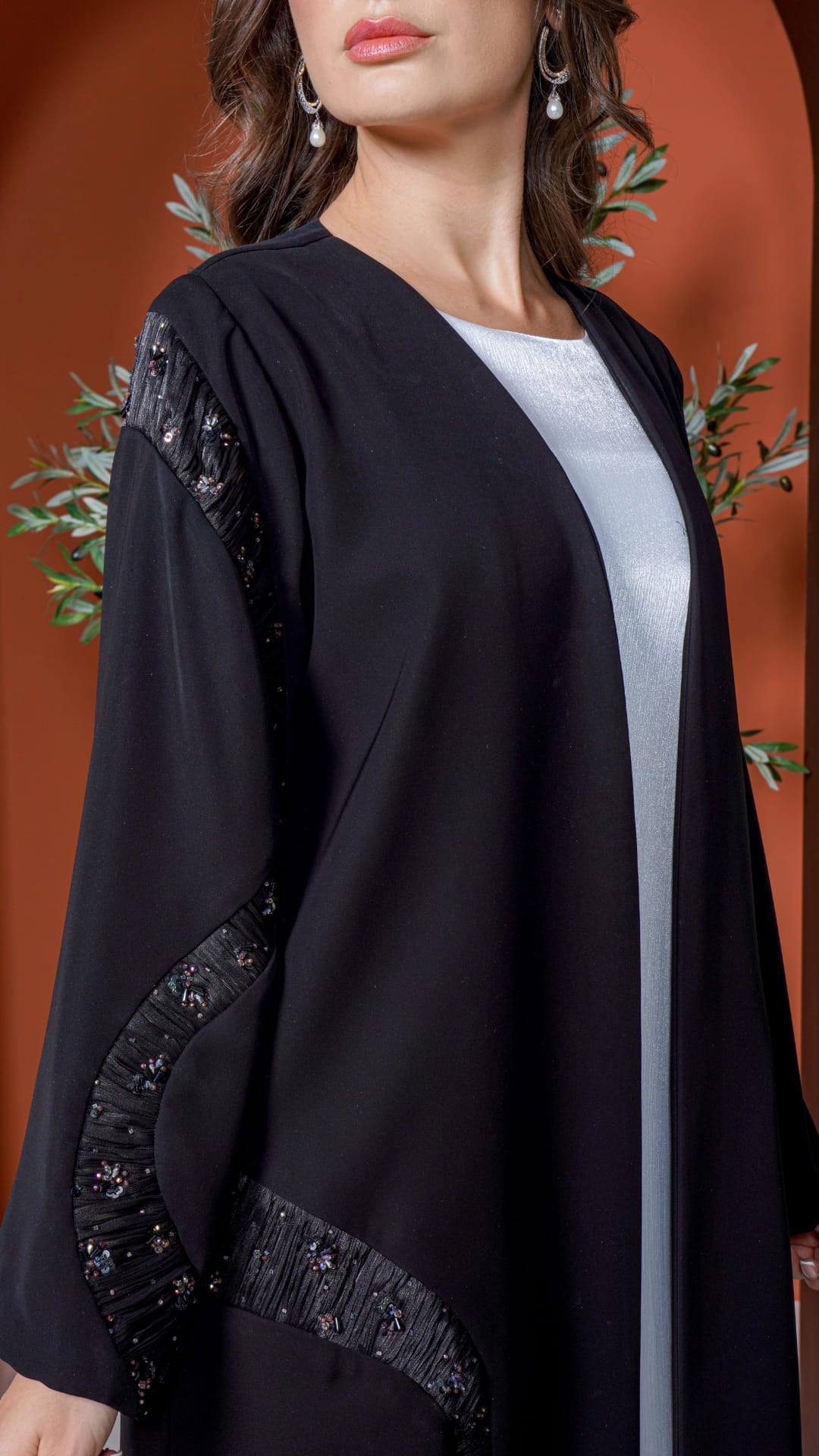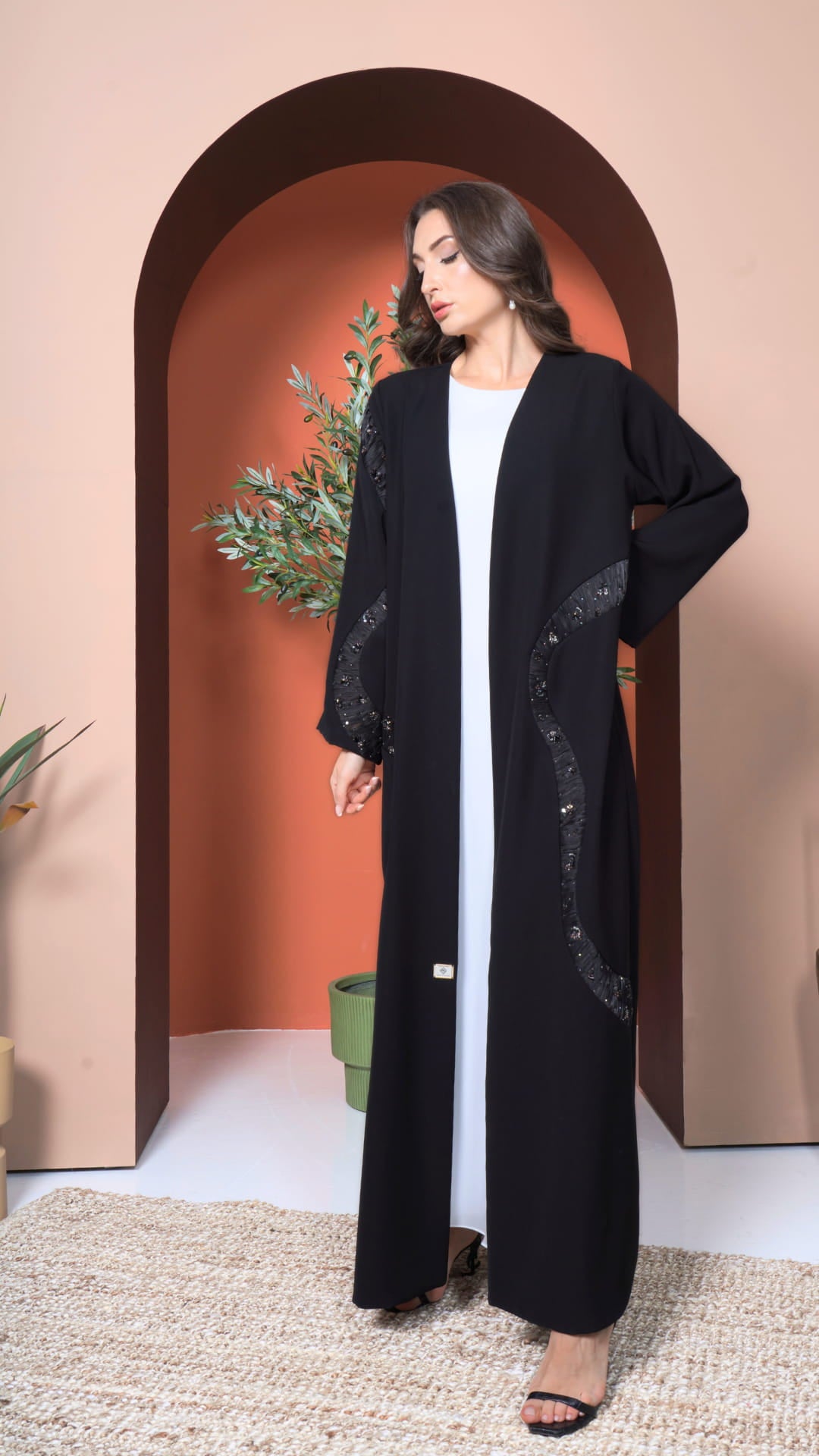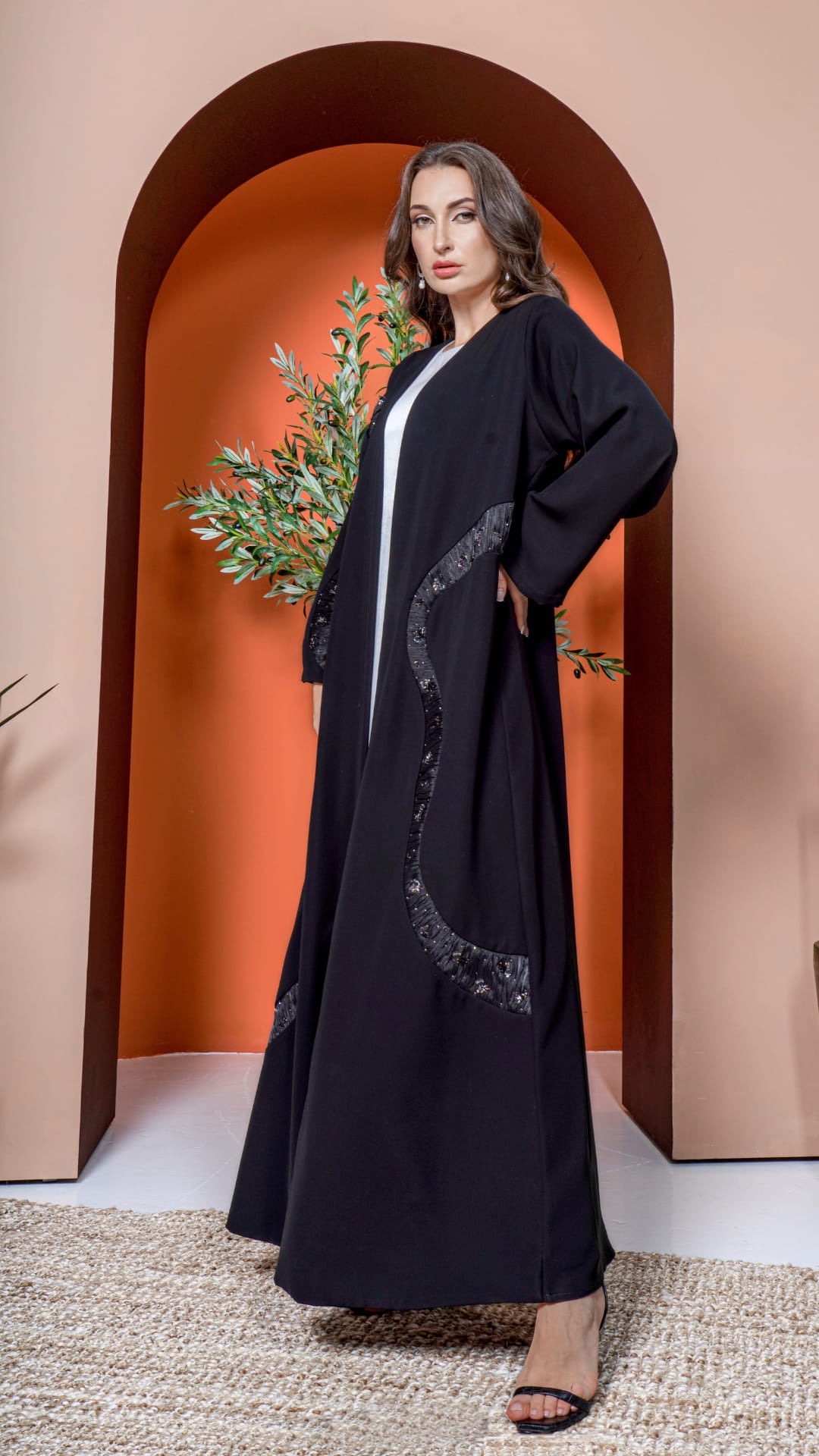 اجذبي الاهتمام الذي تستحقينه مع الحرفية المثالية في أمواج الزخارف الفاخرة على هذه العباءة السوداء الأنيقة