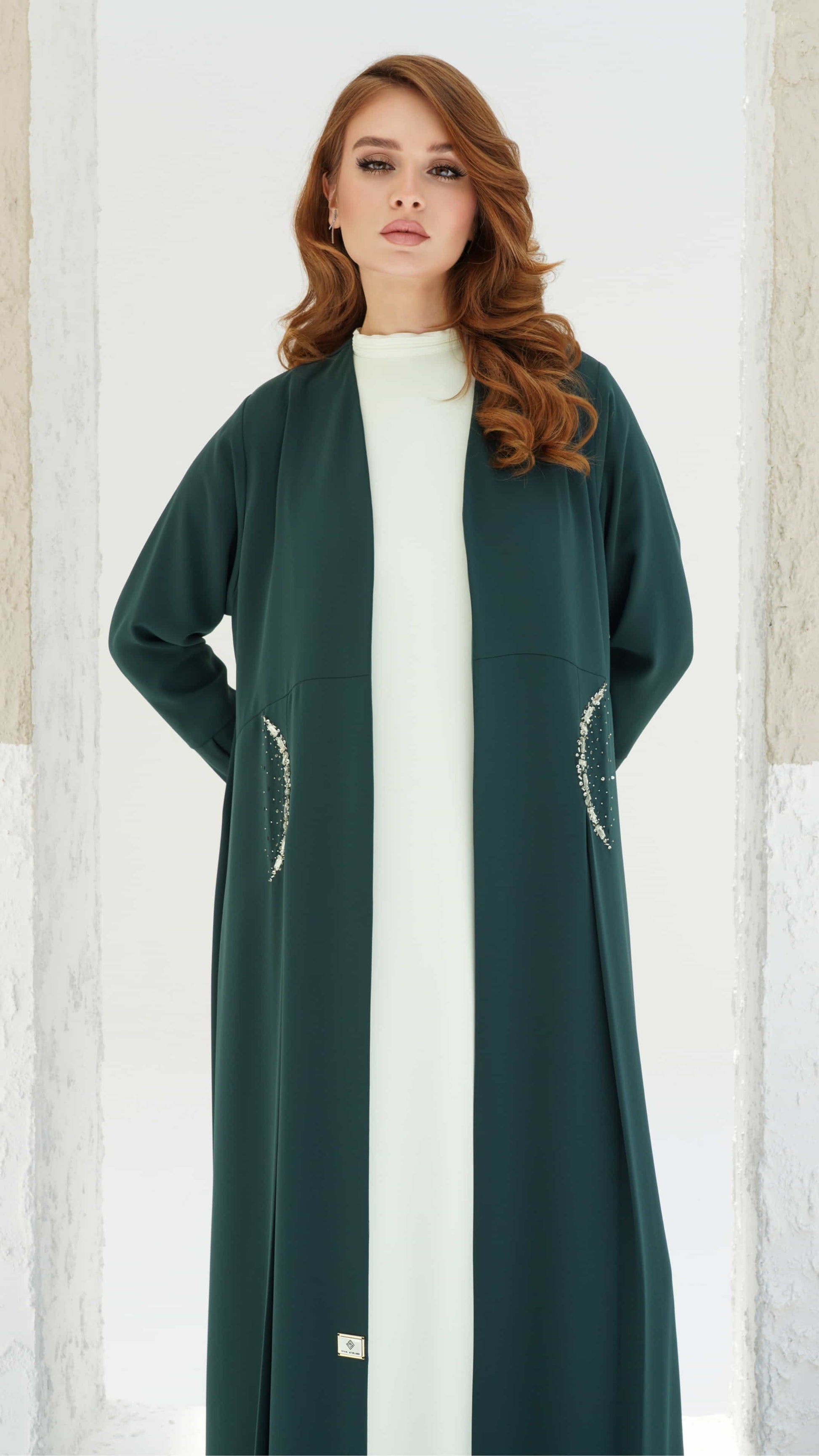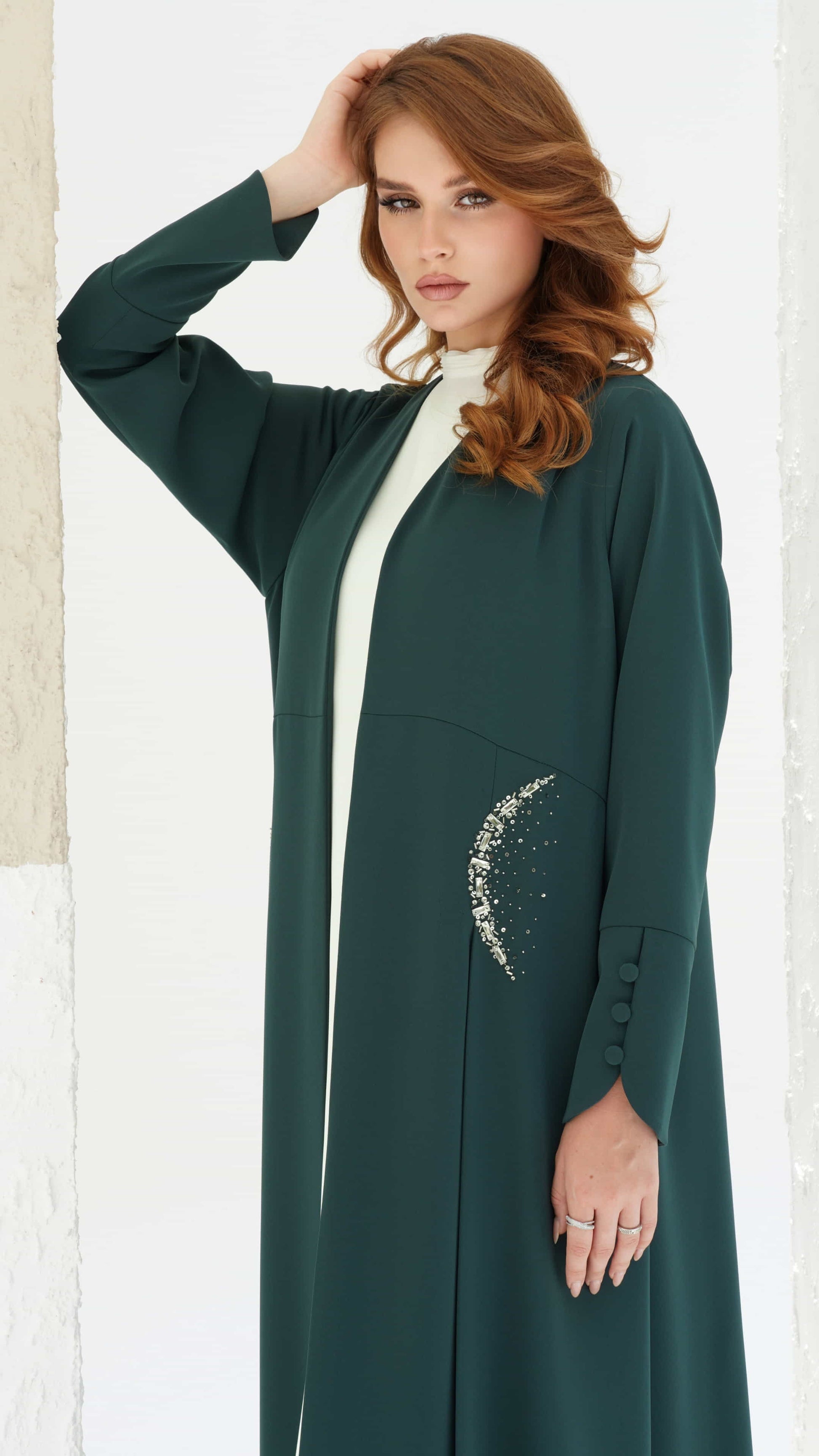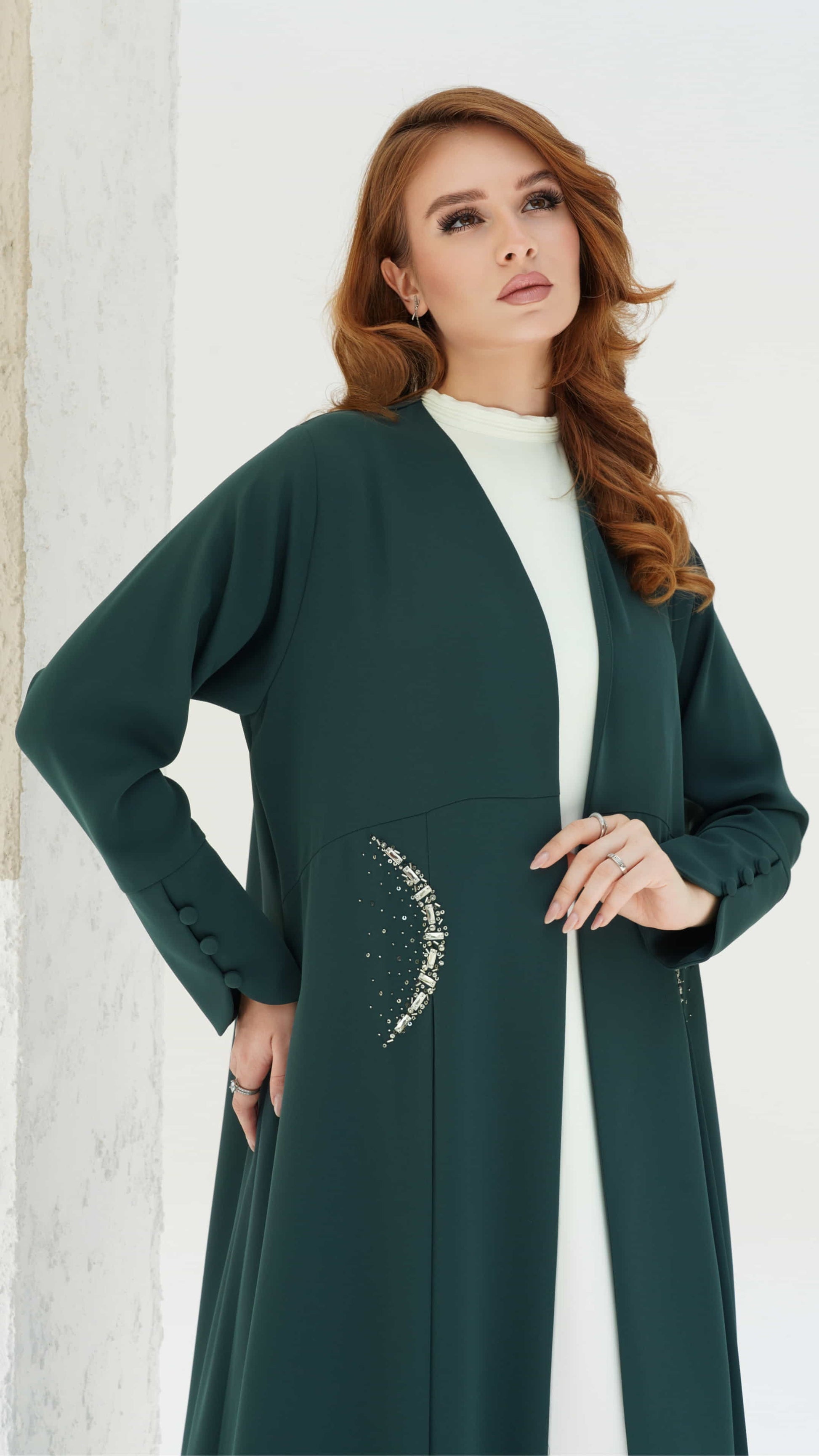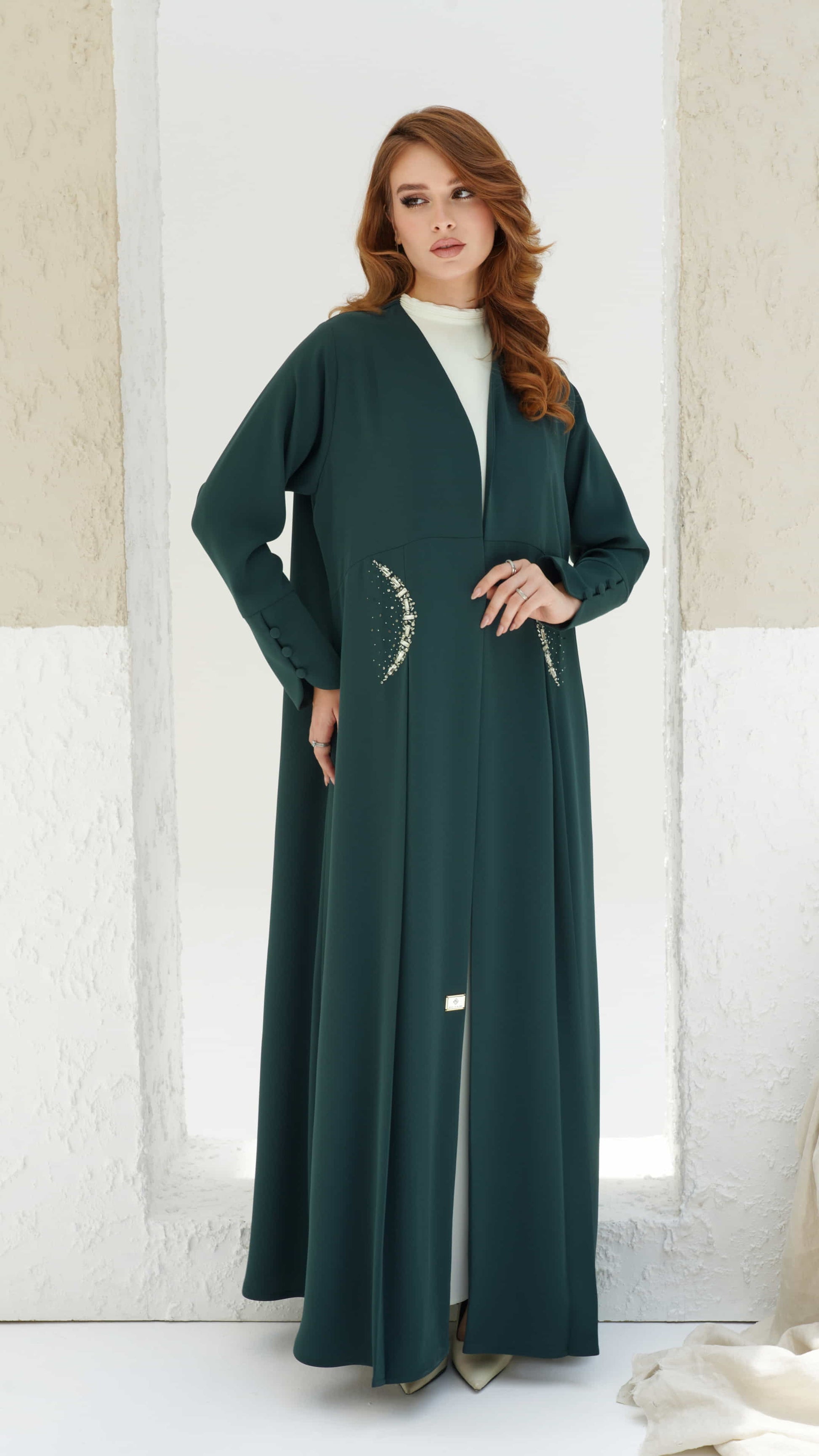Embody the regal aura โšœ๏ธ of Kaina abaya crafted in luxurious forest green ๐Ÿ€ adorned with delicate crescent-shaped ๐ŸŒ™ crystal beading and embellishments.