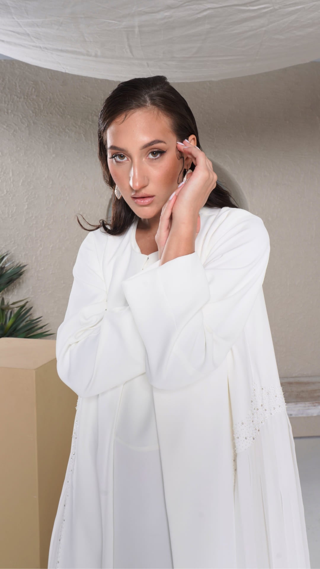 تمتعي بالجمال الأثيري مع عباية بيضاء مزخرفة، مع تفاصيل معقدة تضيف لمسة من الرقي، وتخلق صورة ظلية رشيقة وخالدة