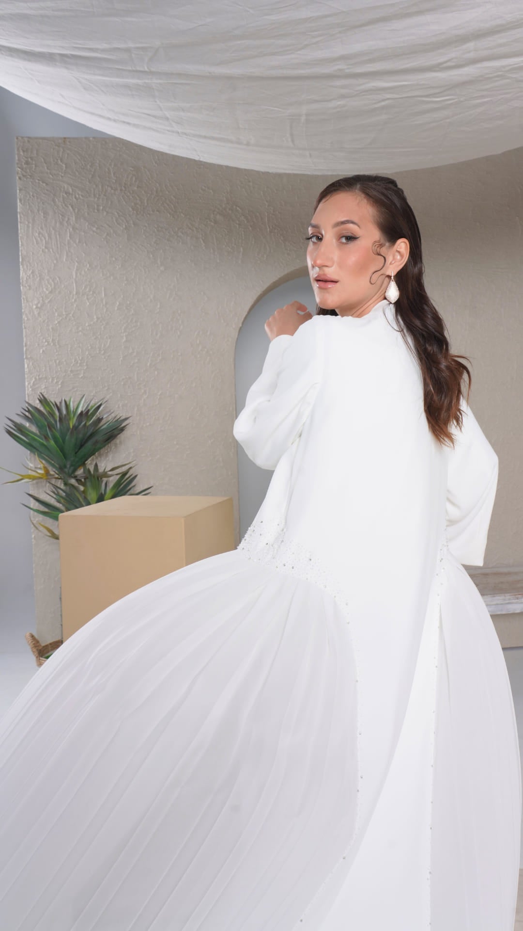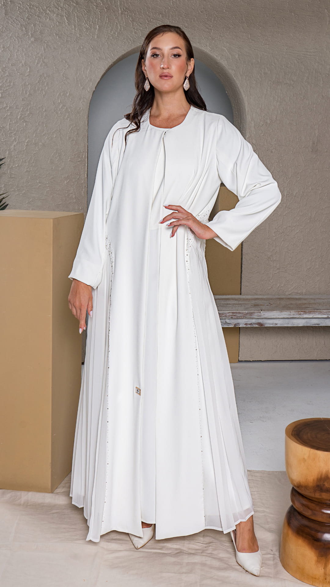 Embrace ethereal beauty in a white embellished abaya, with intricate detailing that adds a touch of sophistication, creating a timeless and graceful silhouette. Abaya pleated on side with beads