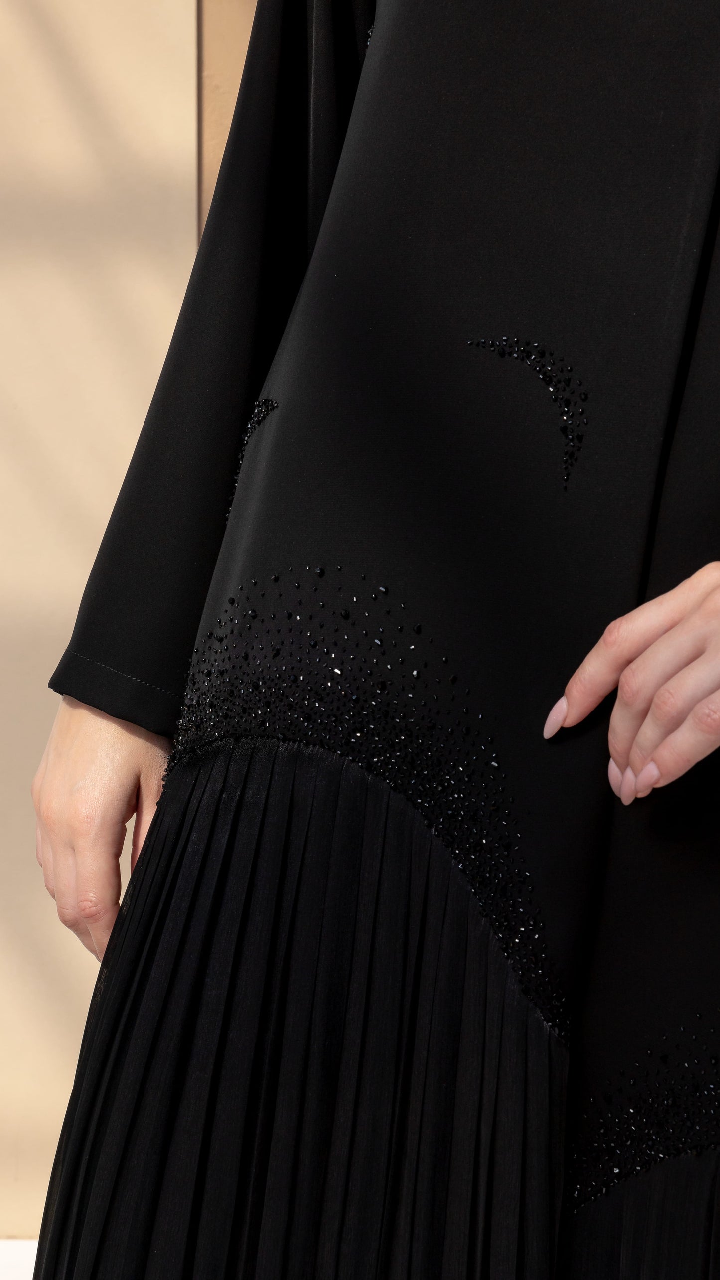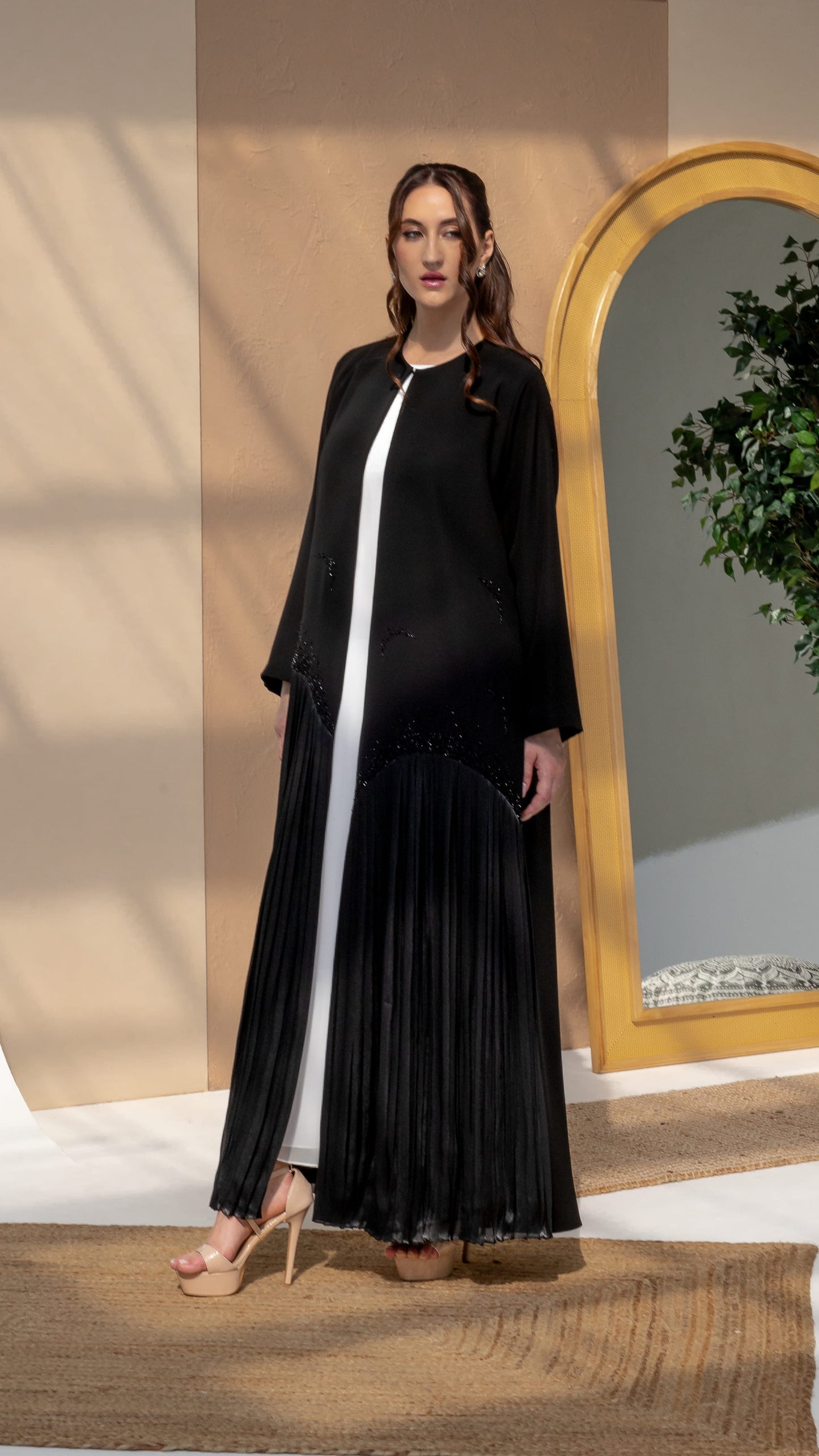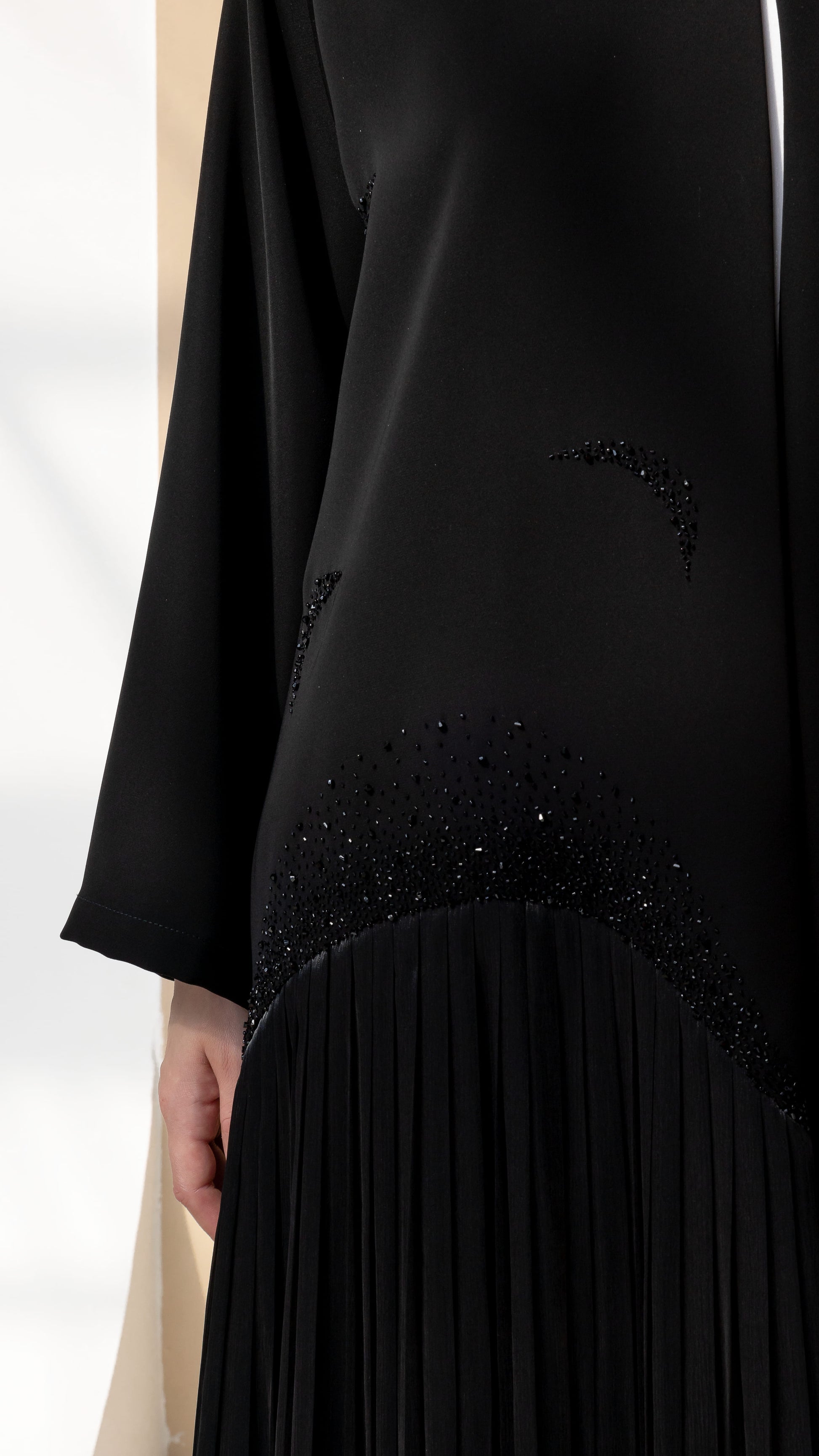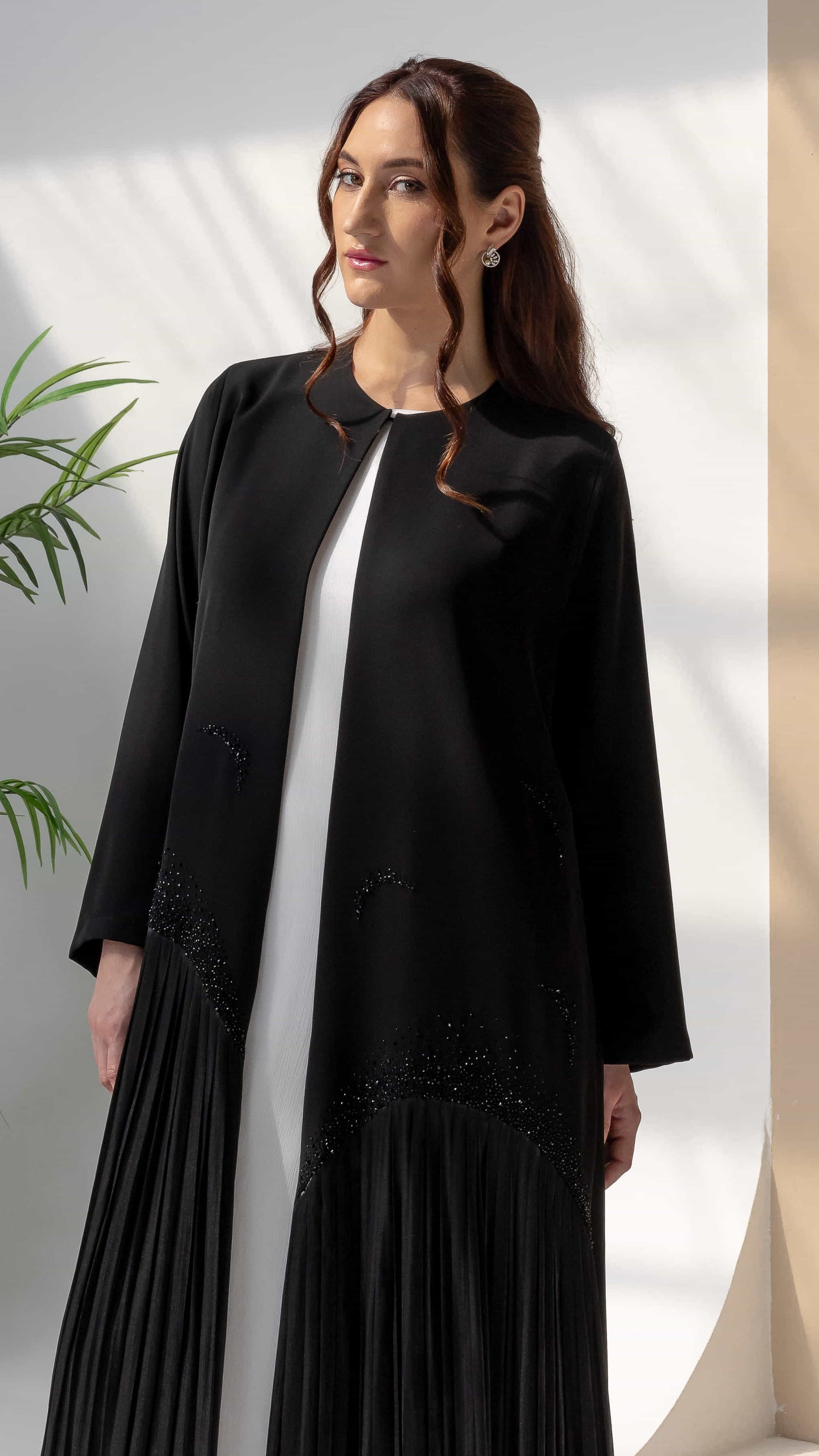 تجسد عباية ميرا جوهر الرقي الساحر، حيث تقدم مزيجًا مذهلاً من أناقة اللون الأسود الغني والسحر الأنثوي