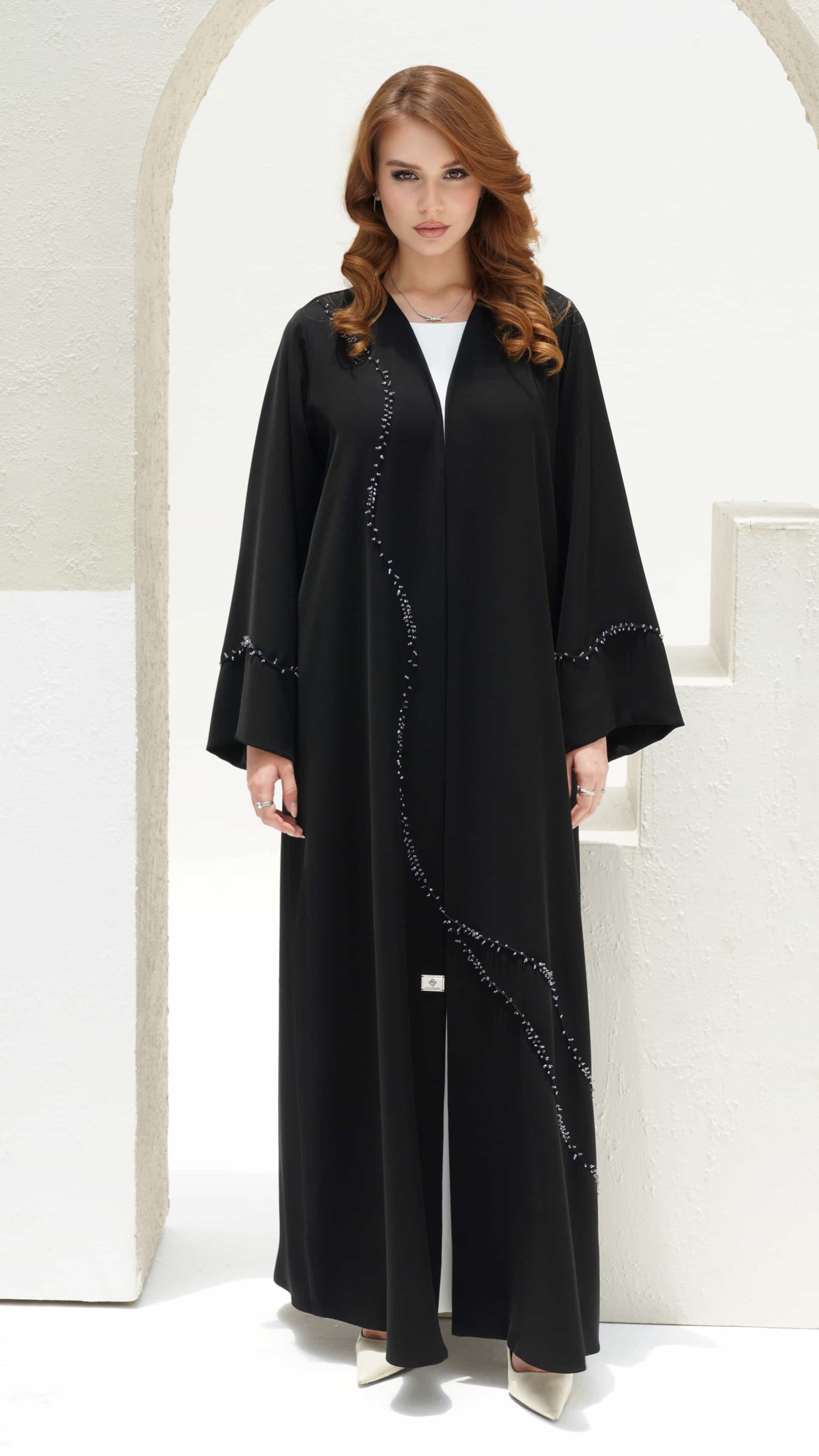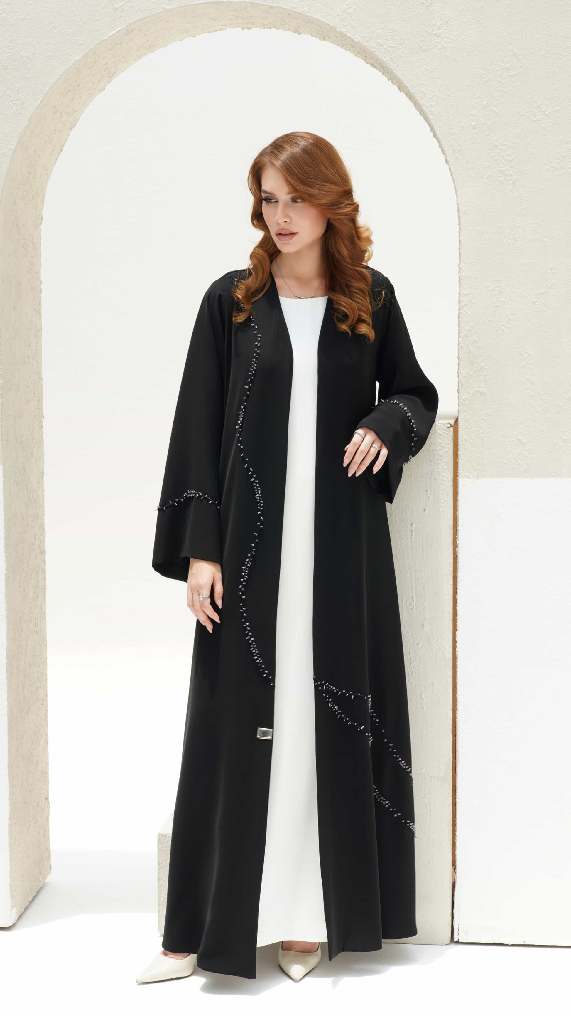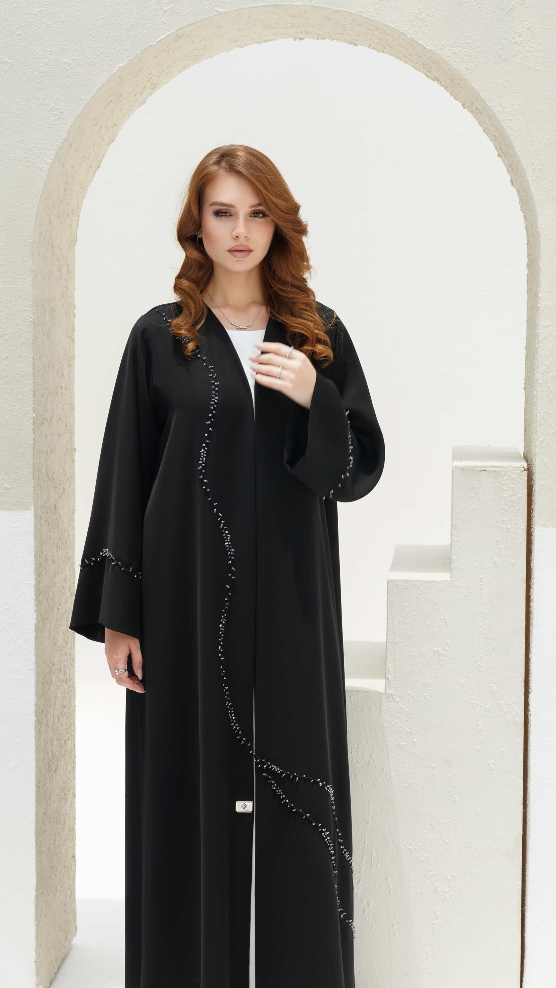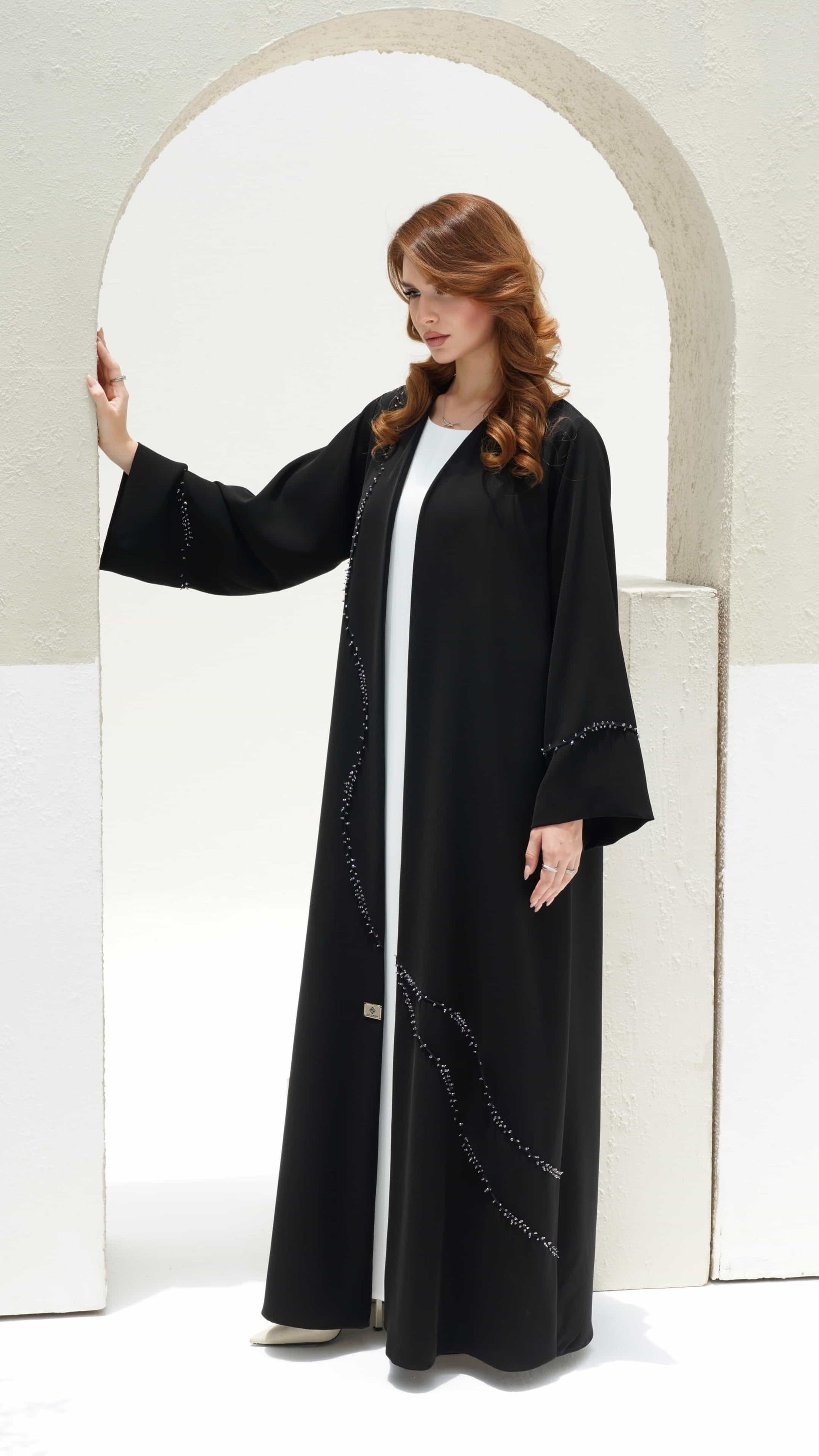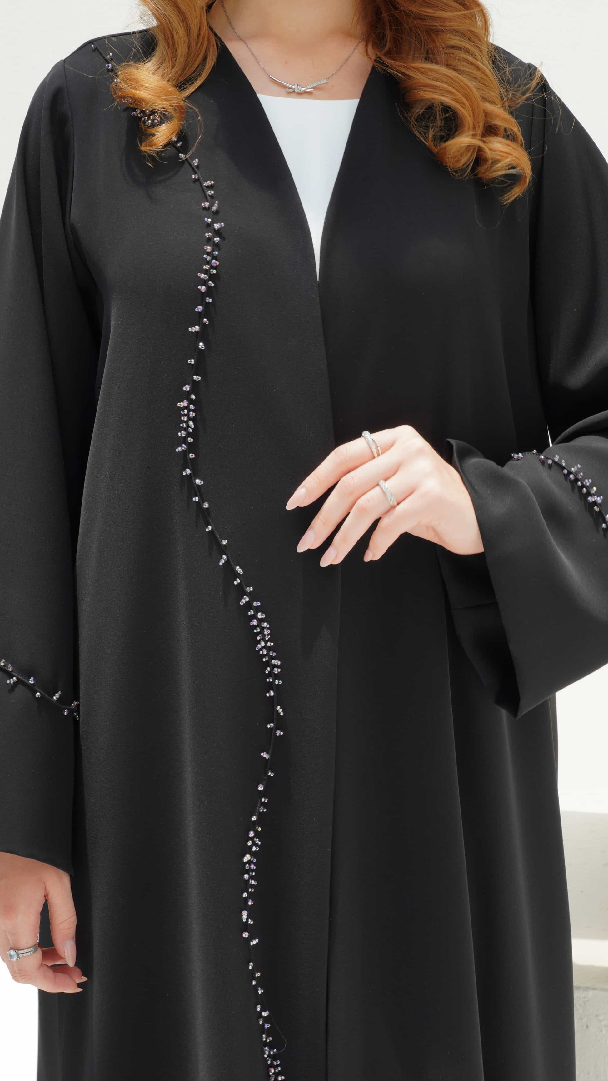 Nisreen is a stunning black luxury abaya 🖤 elevated by a shimmering trail of hand-sewn beads ⚫ creating a mesmerizing cascade effect