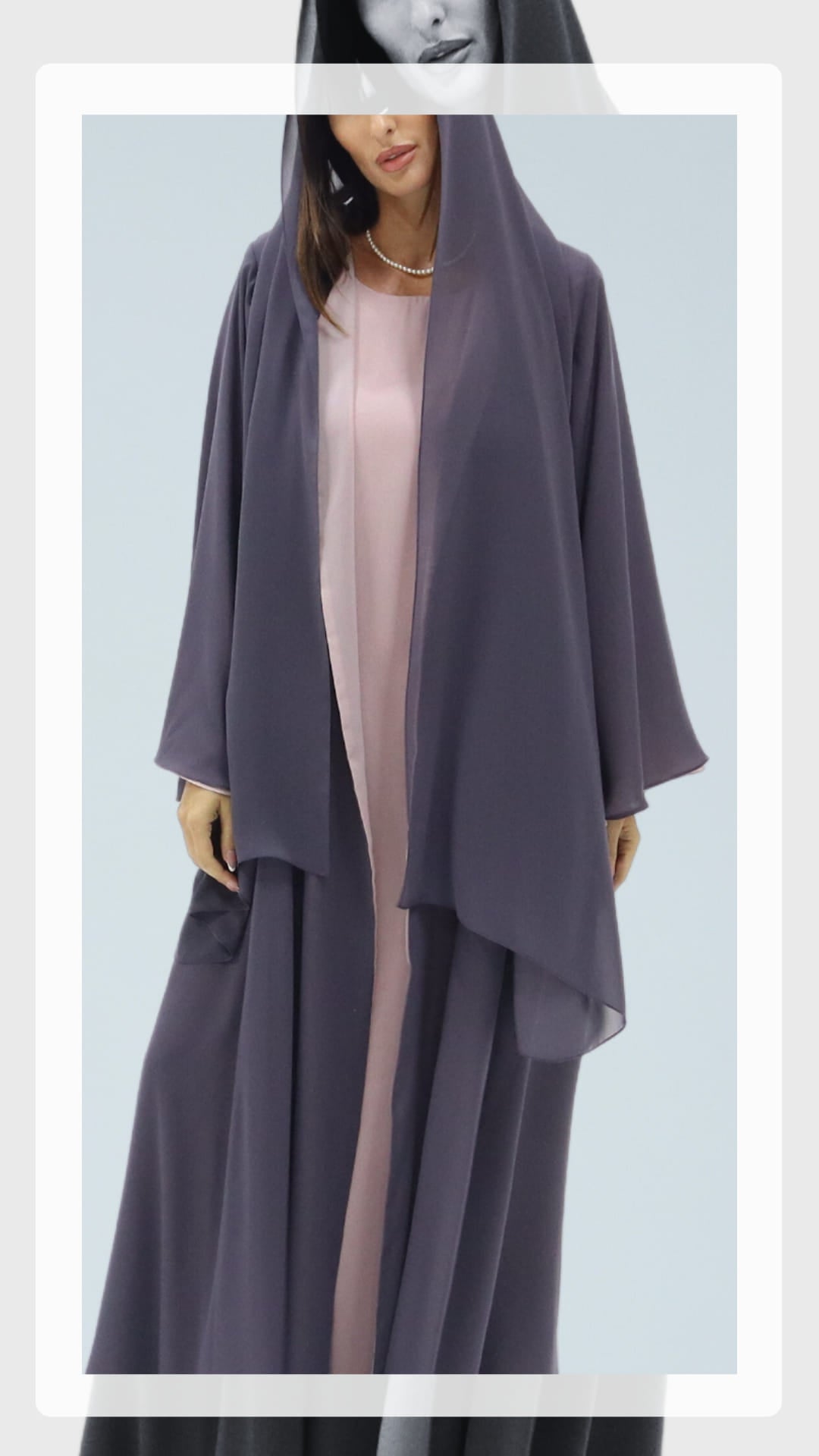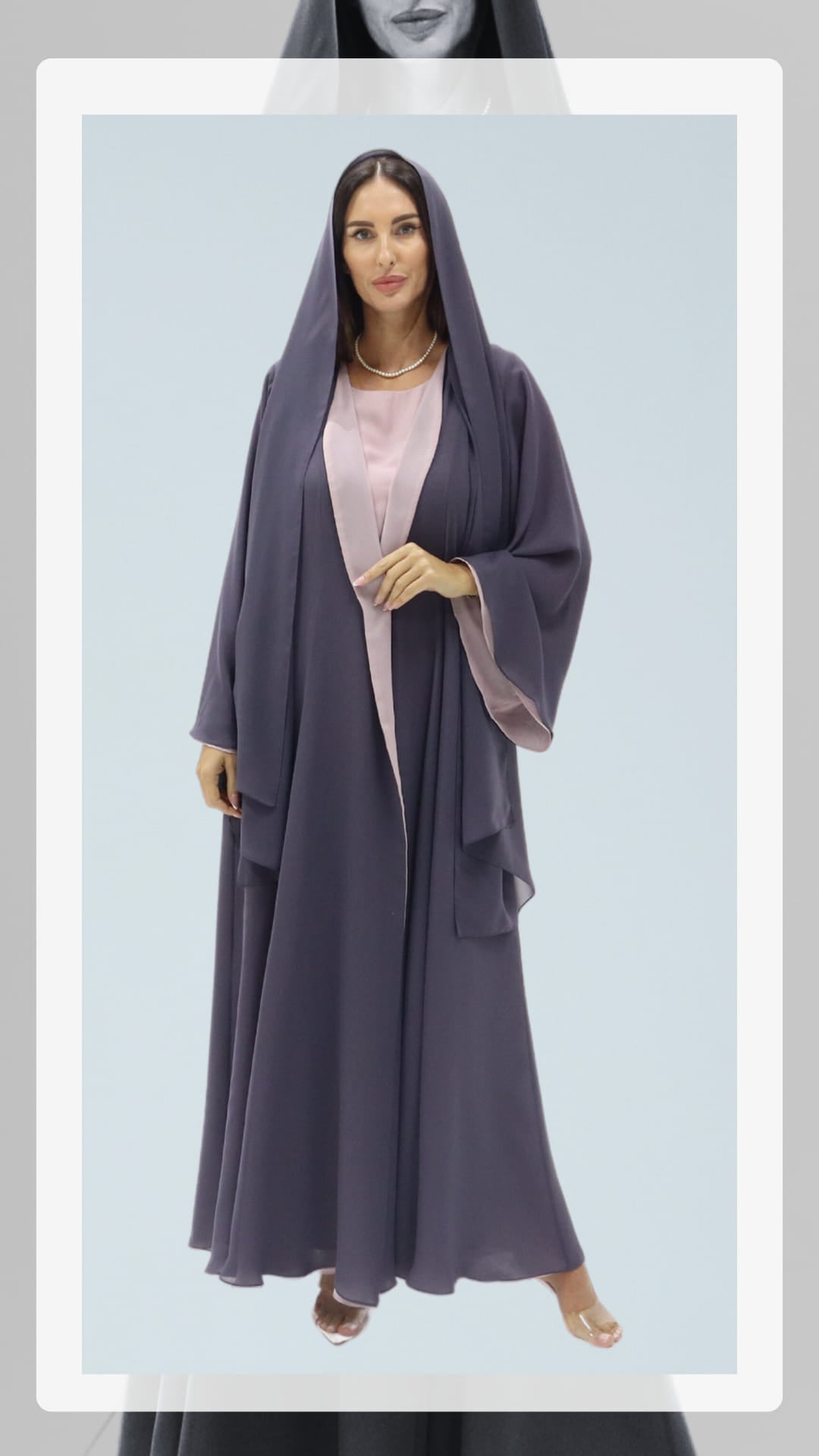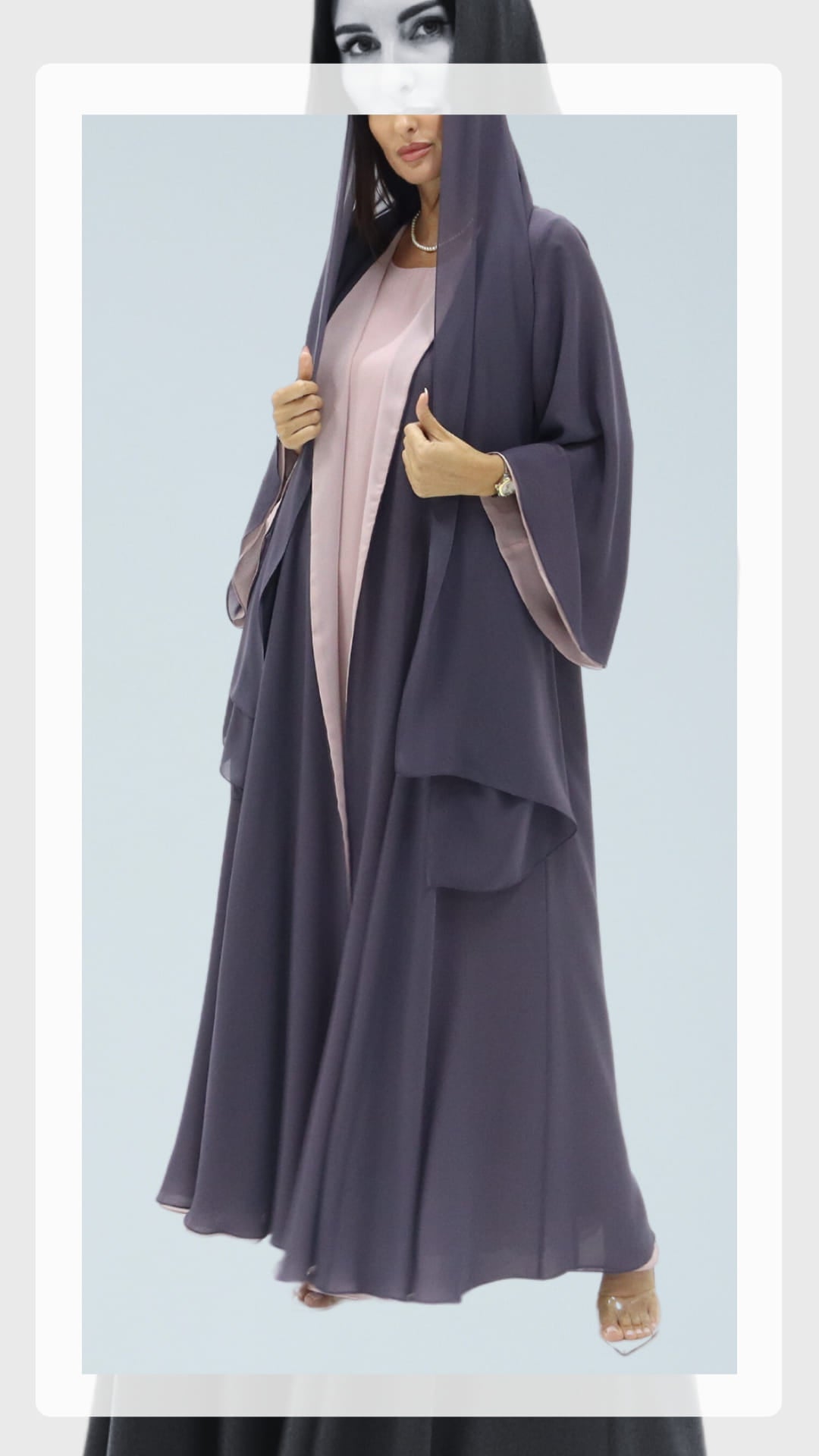 Elegant flowy drapes in a reversible abaya with a rich regal purple hue complemented in soft alluring mauve, with the softest fabric play of femininity and charm