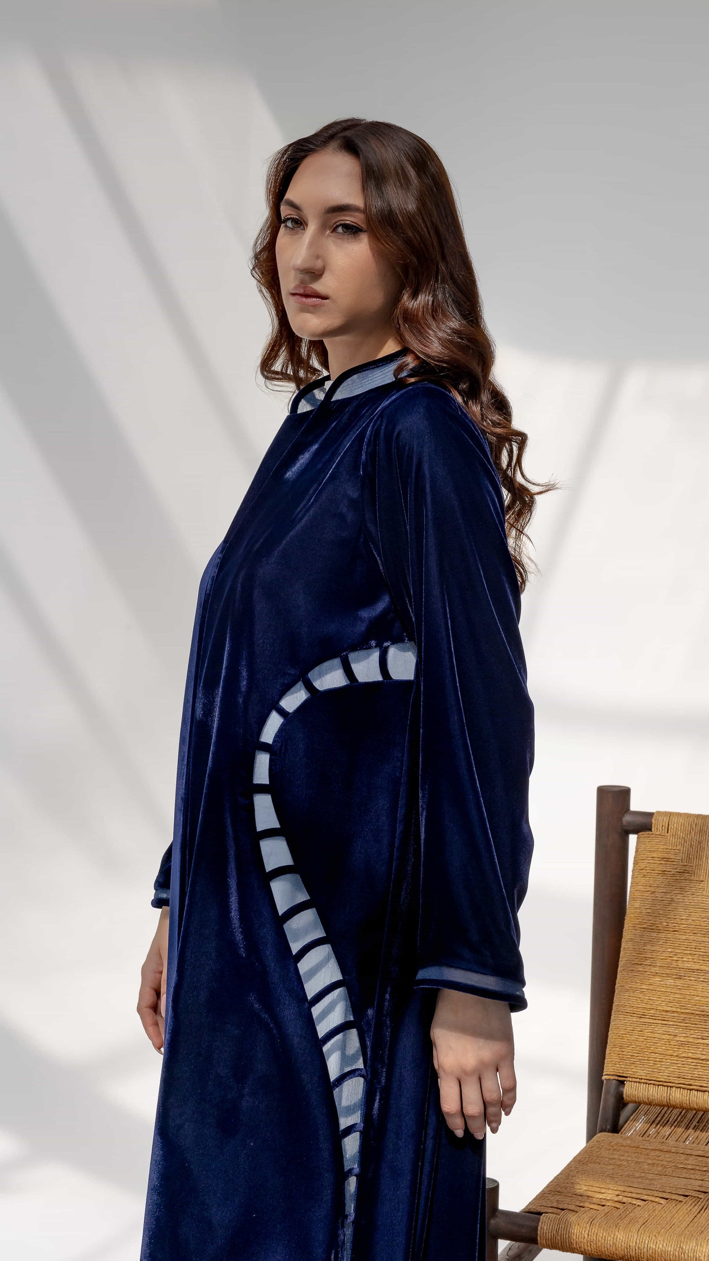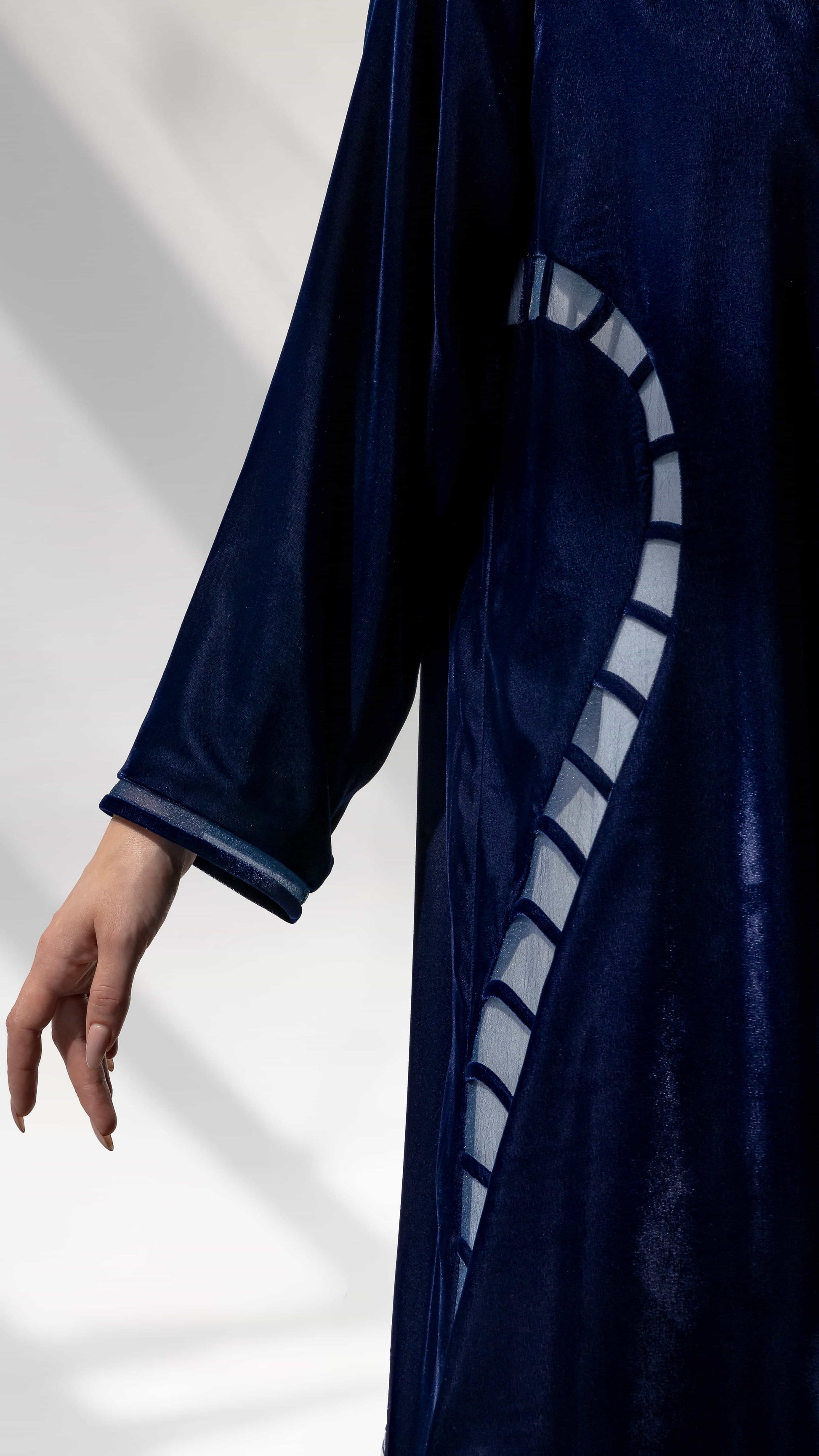 تتميز بلمسة أنيقة من القماش الشفاف المندمج في الياقة العالية الأنيقة وعلى طول الأكمام مصممة بشكل مثالي