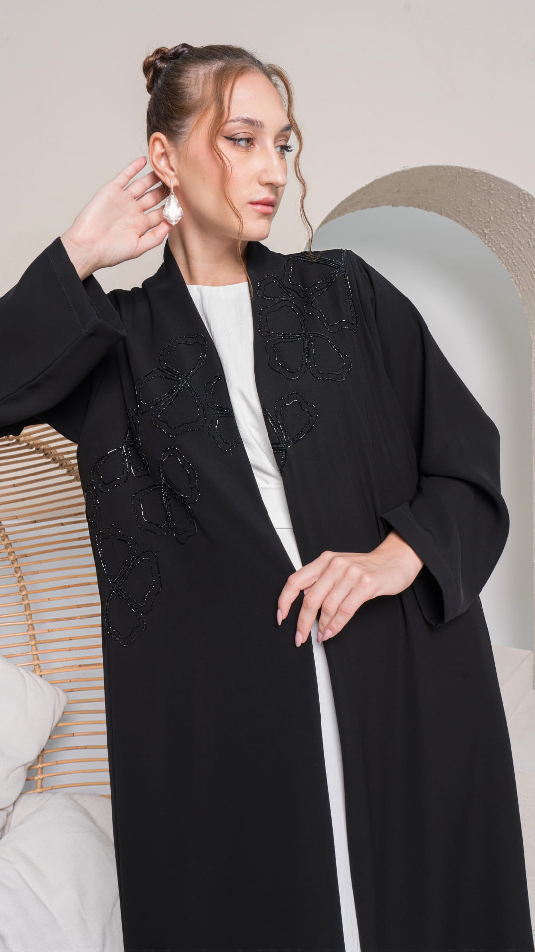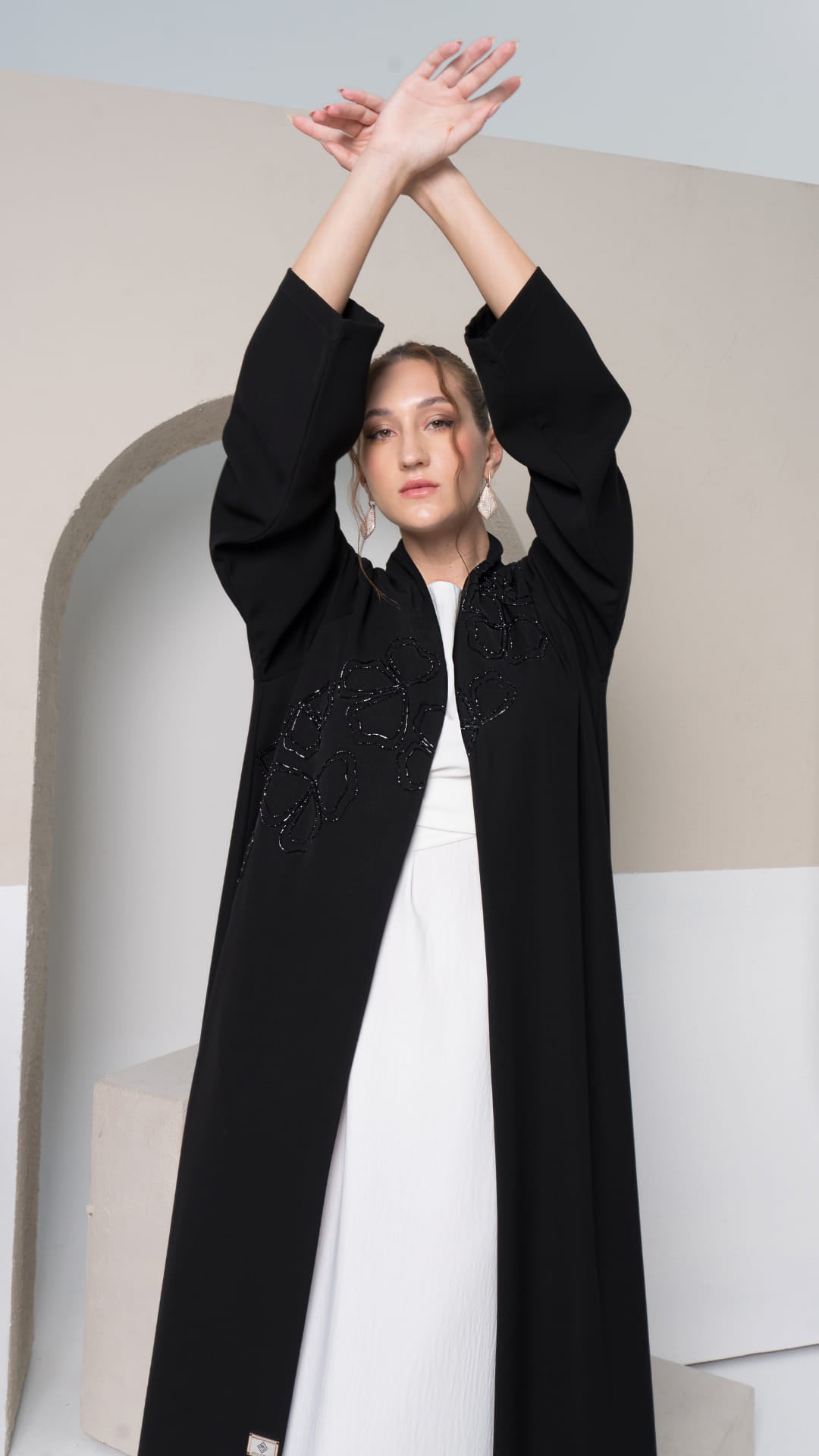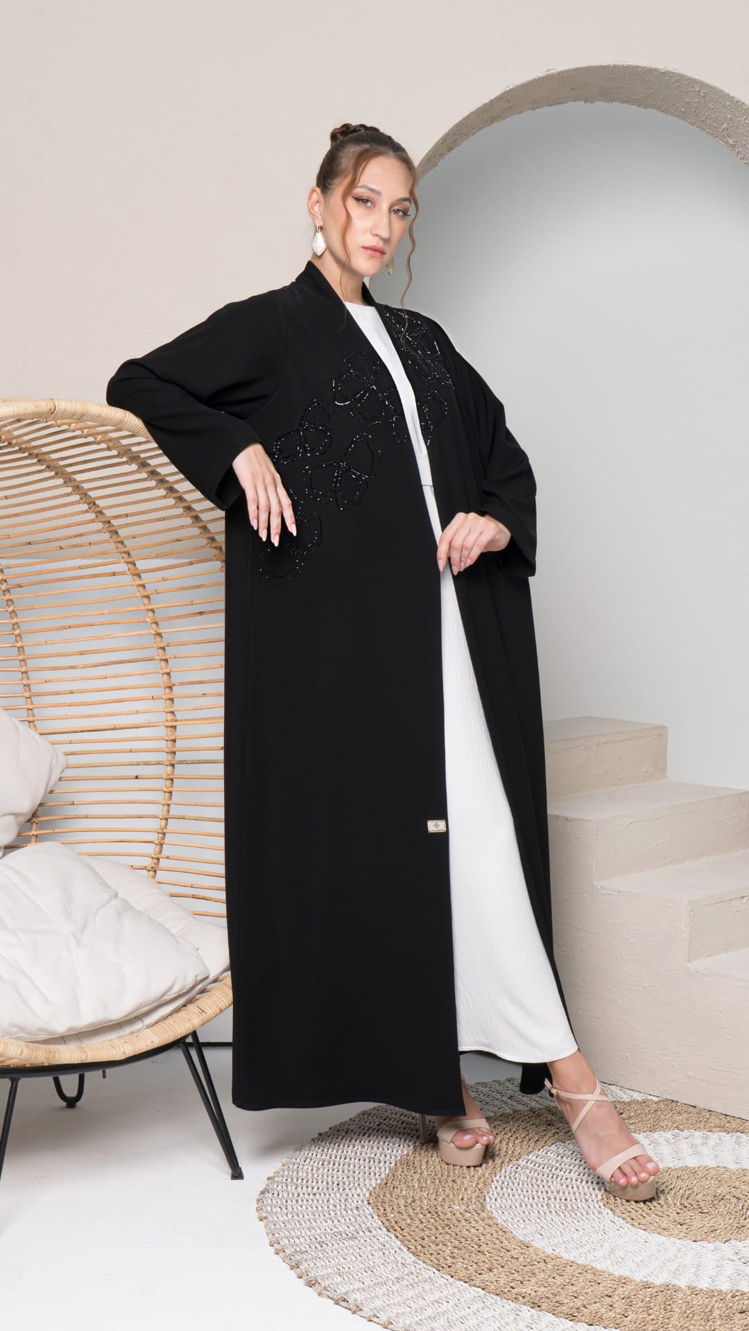 رزان هي تحفة فنية حقيقية من الأناقة البسيطة، تتميز بتطريز متقن من اللون الأسود على قماش أسود فاخر كلاسيكي، وهي قطعة أنيقة لا غنى عنها في خزانة ملابسك