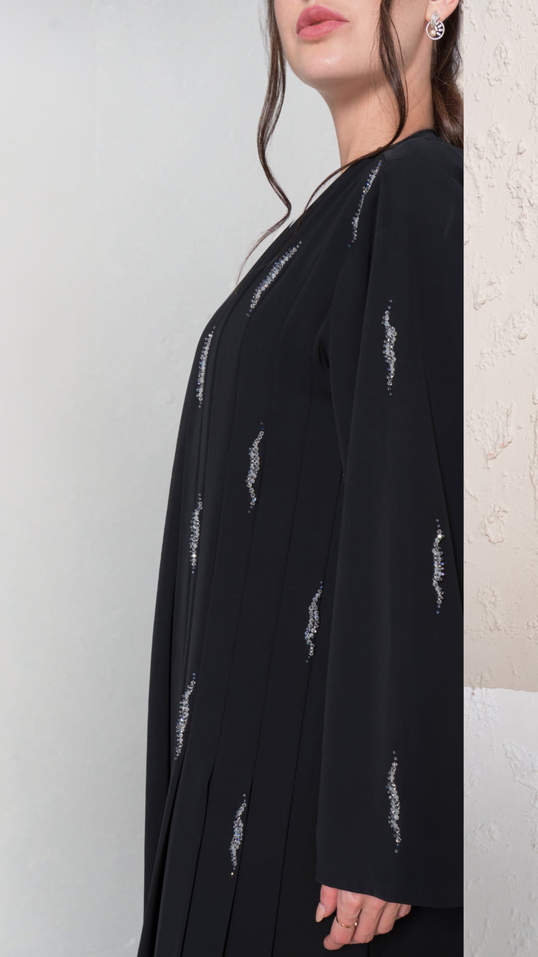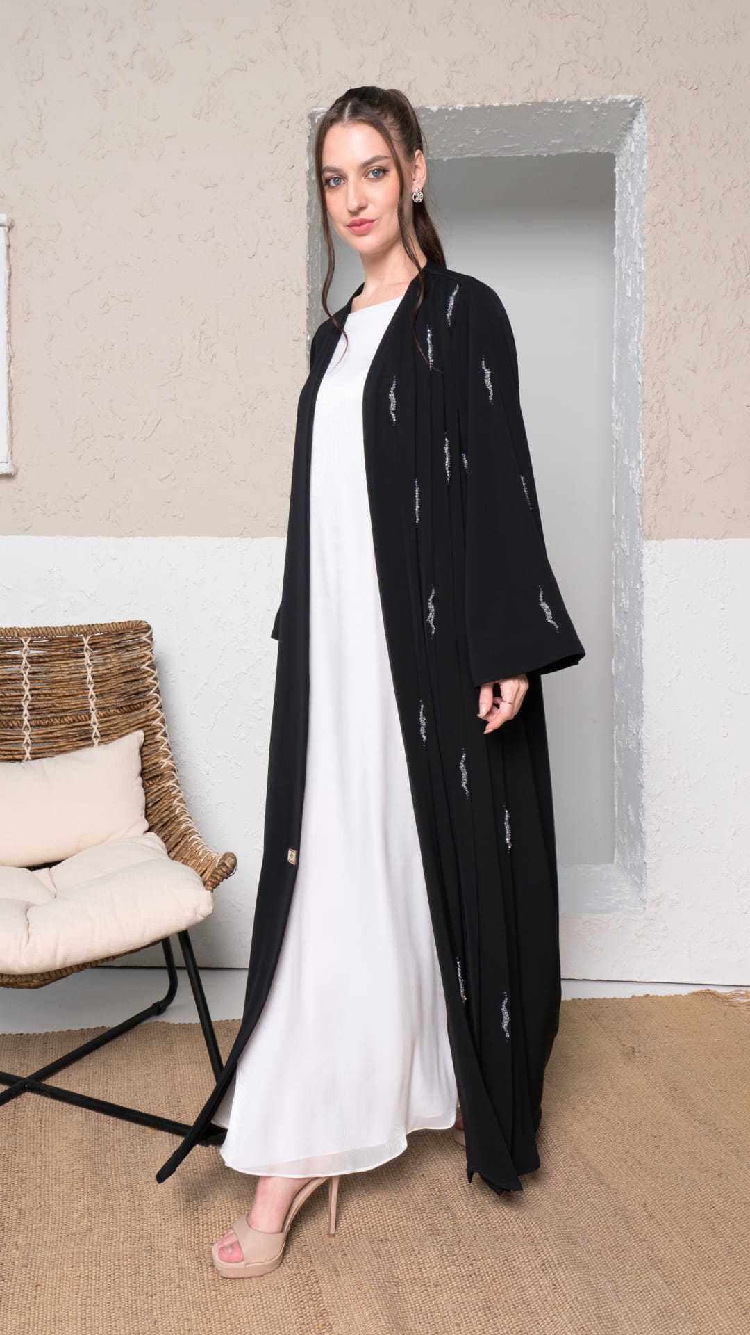 Wear this enchanting abaya with all-over delicate sequins and embellishments on the soulful white pleats