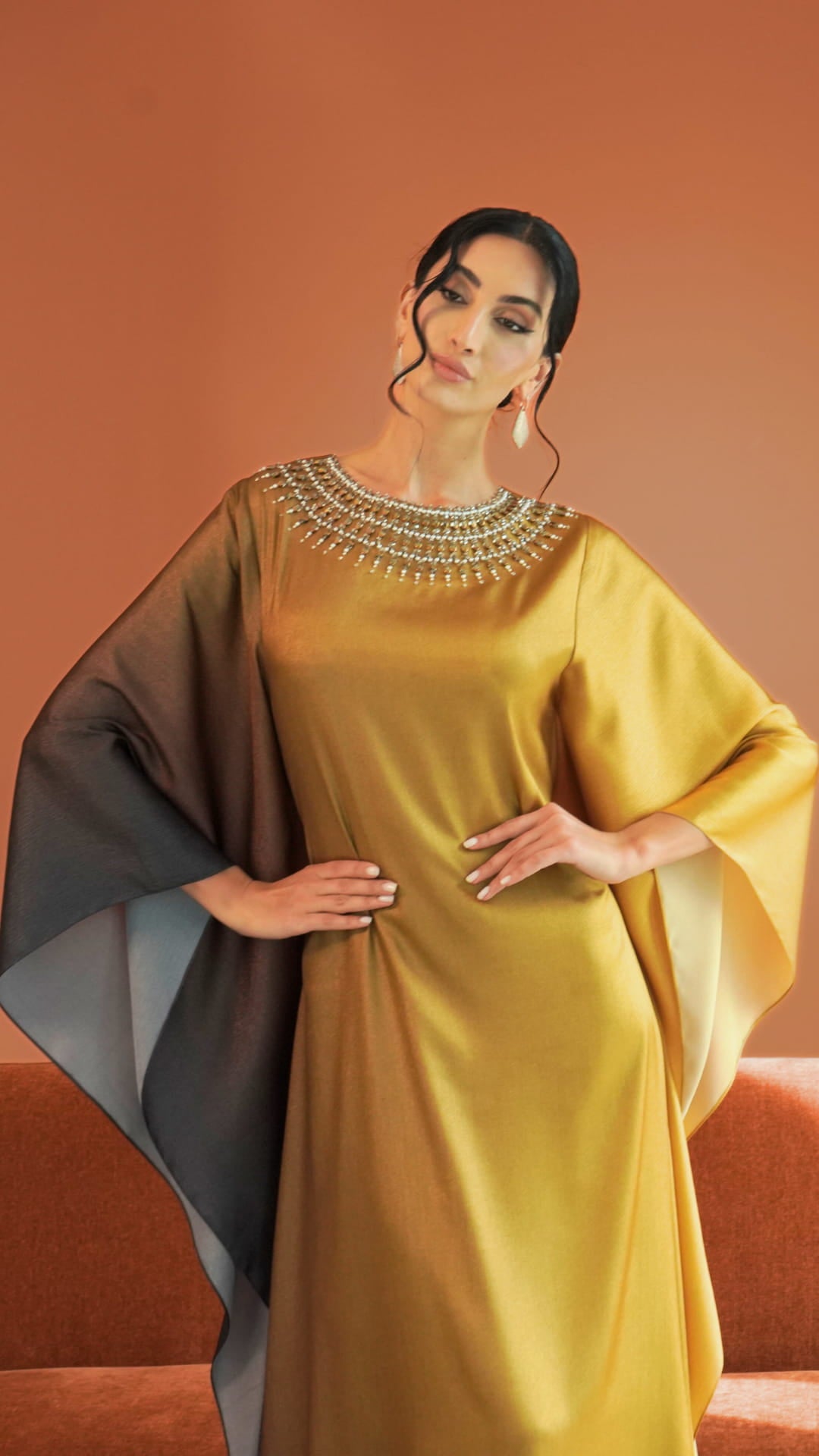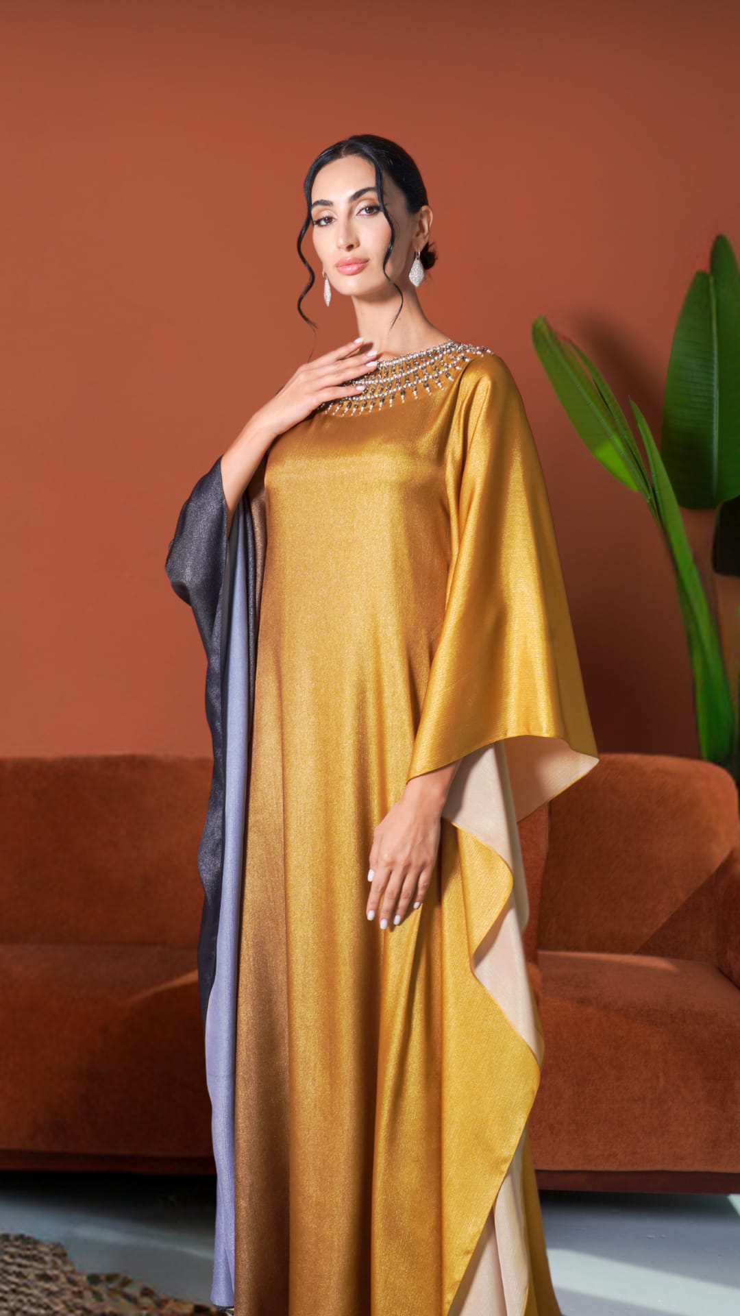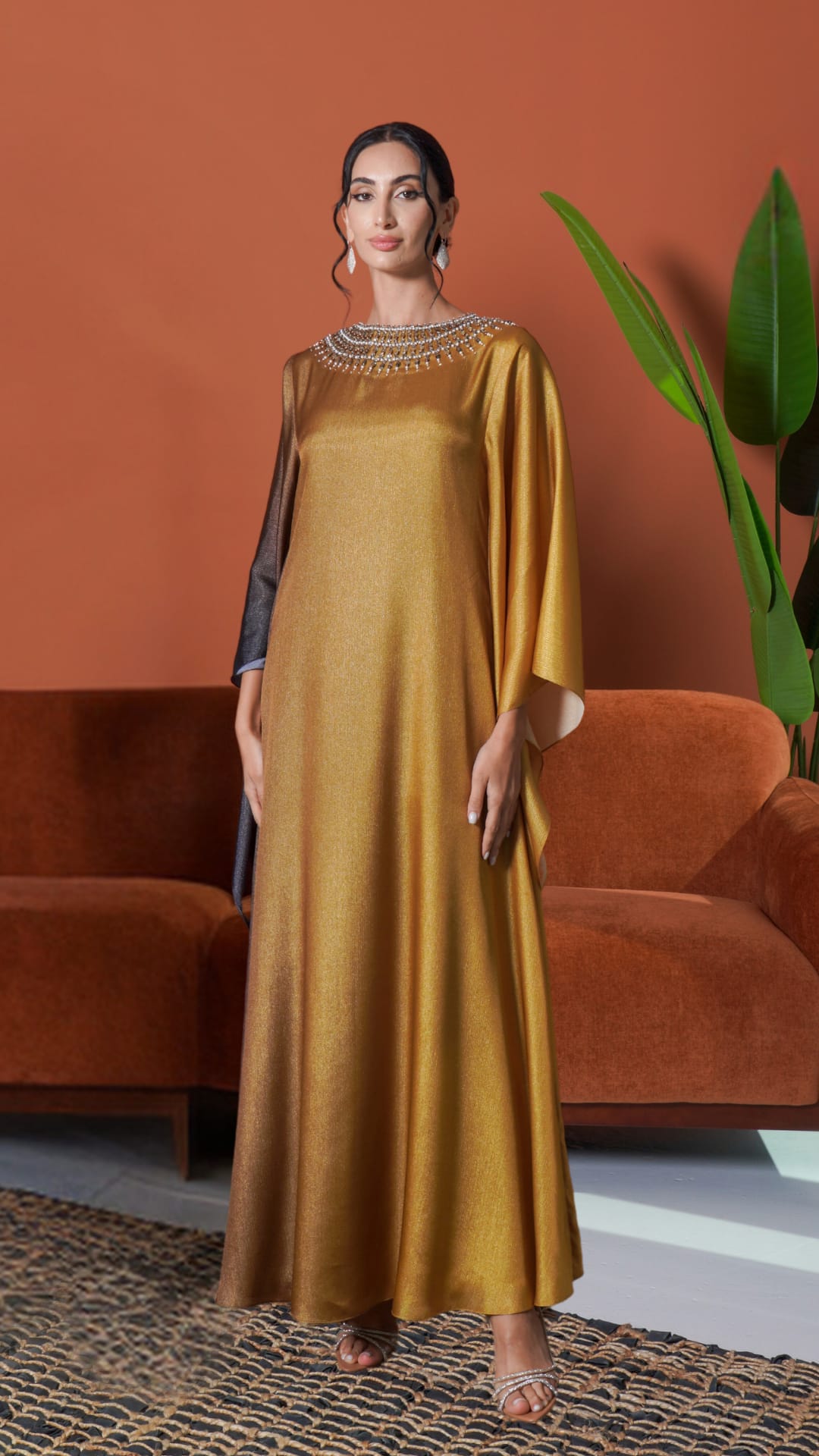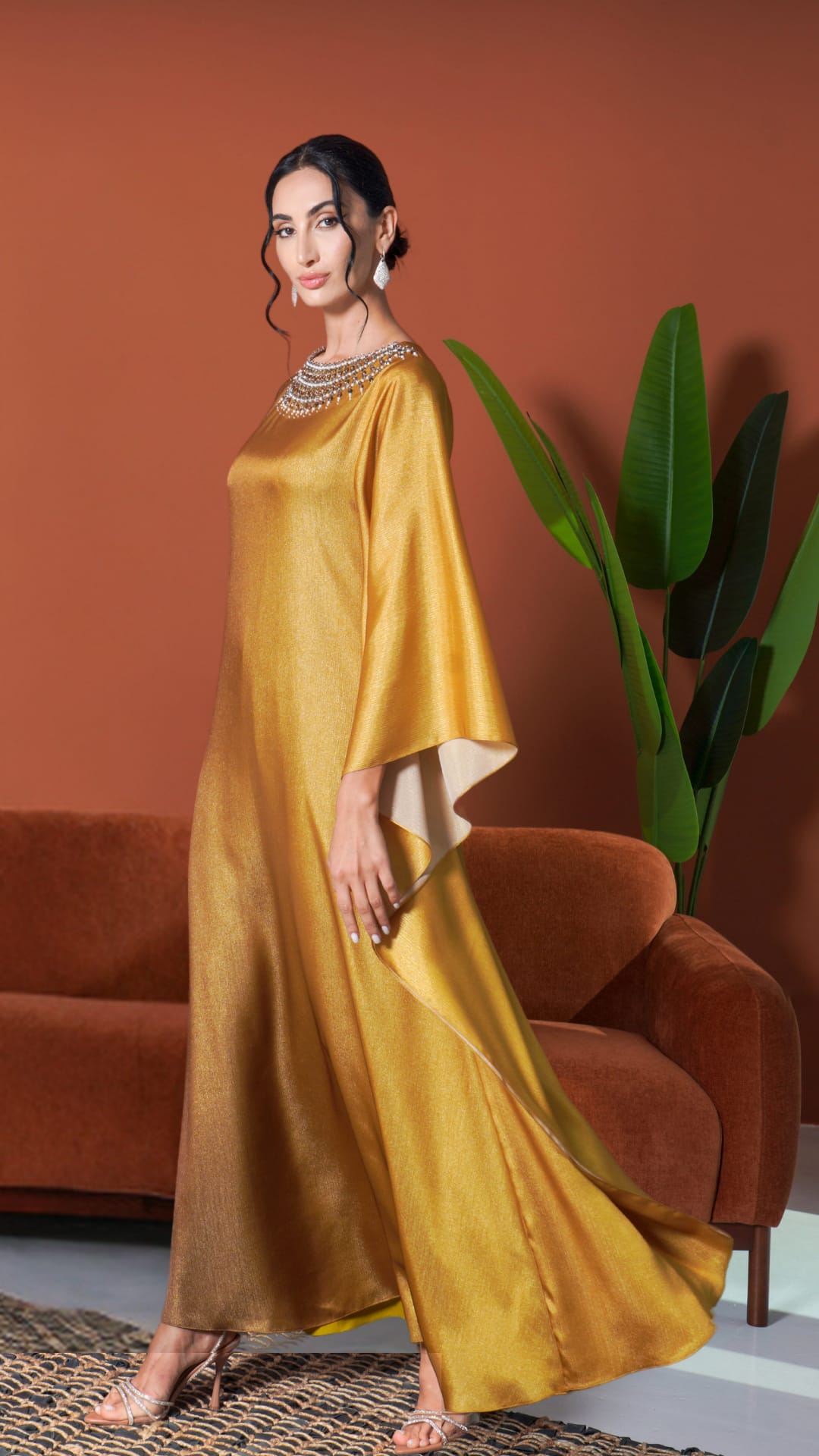 Shine in any special occasion with this elegant sunlit kaftan of sheer class with vintage gold appeal