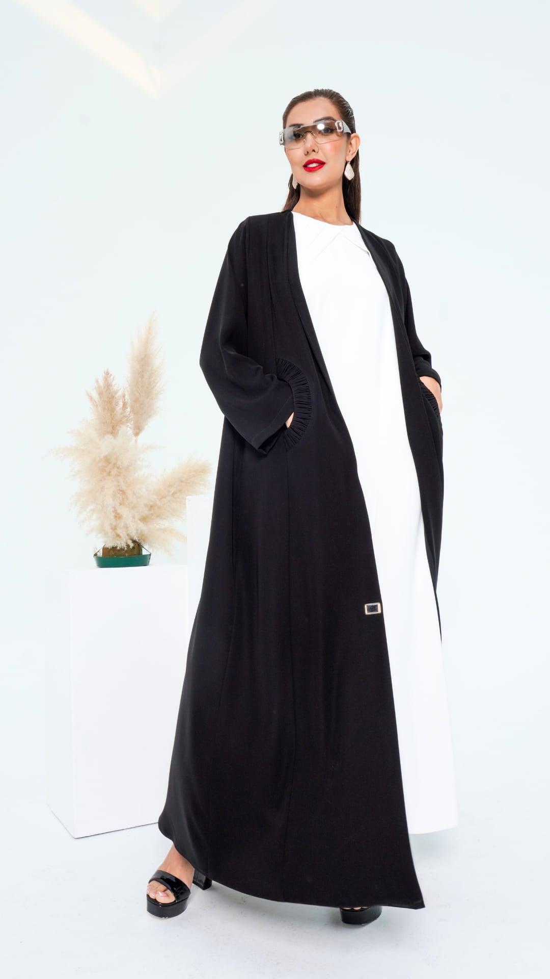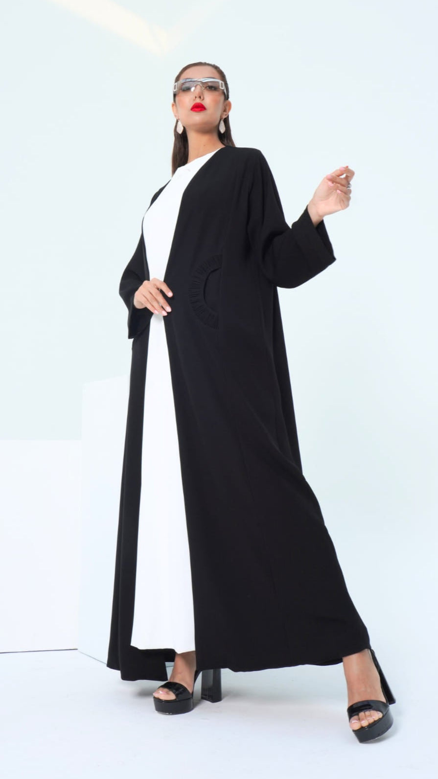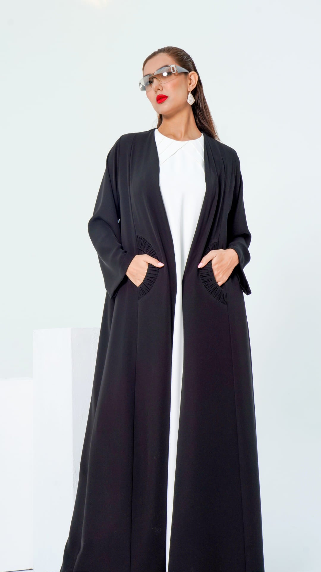 عباية سوداء أنيقة وعصرية تتميز بتفاصيل أنيقة على الجيوب، مما يضيف لمسة عصرية إلى الأناقة الكلاسيكية