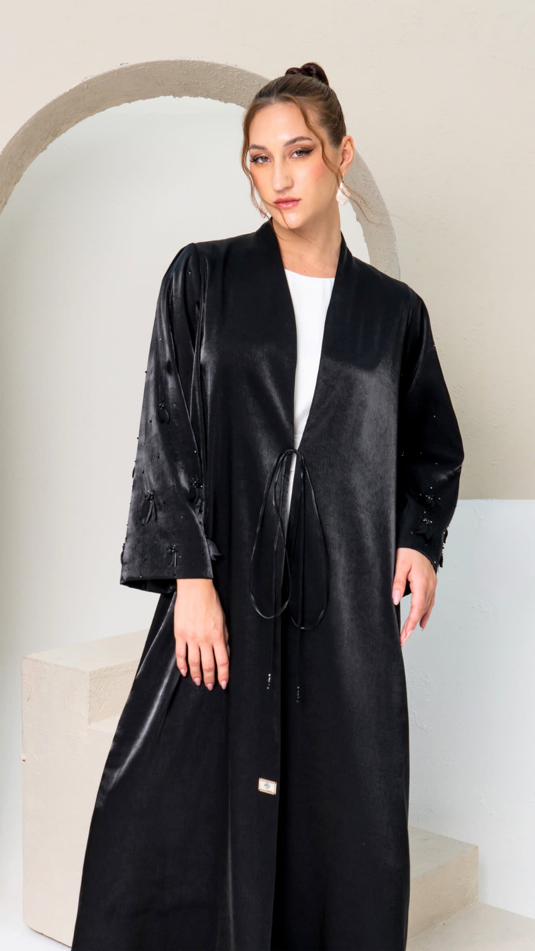 تتميز عباية سناء بزخارف نباتية ثلاثية الأبعاد لا تشوبها شائبة، مما يجسد هالة من الفخامة والأناقة. تتدفق الأزهار المعقدة برشاقة على طول العباءات بتفاصيل آسرة، مما يجعلها تحفة فنية فريدة تجسد الموضة الراقية بأسلوب غريب
