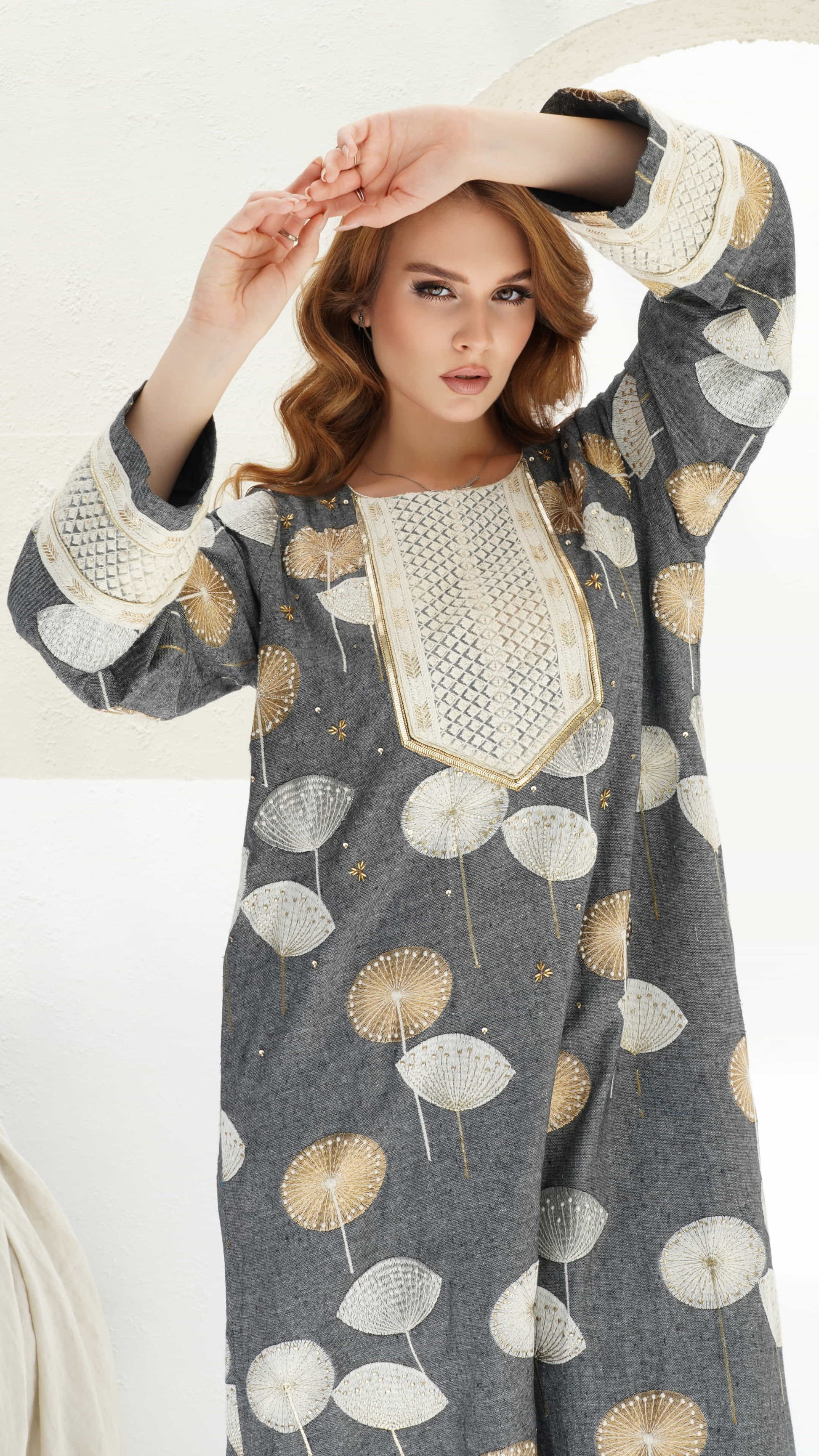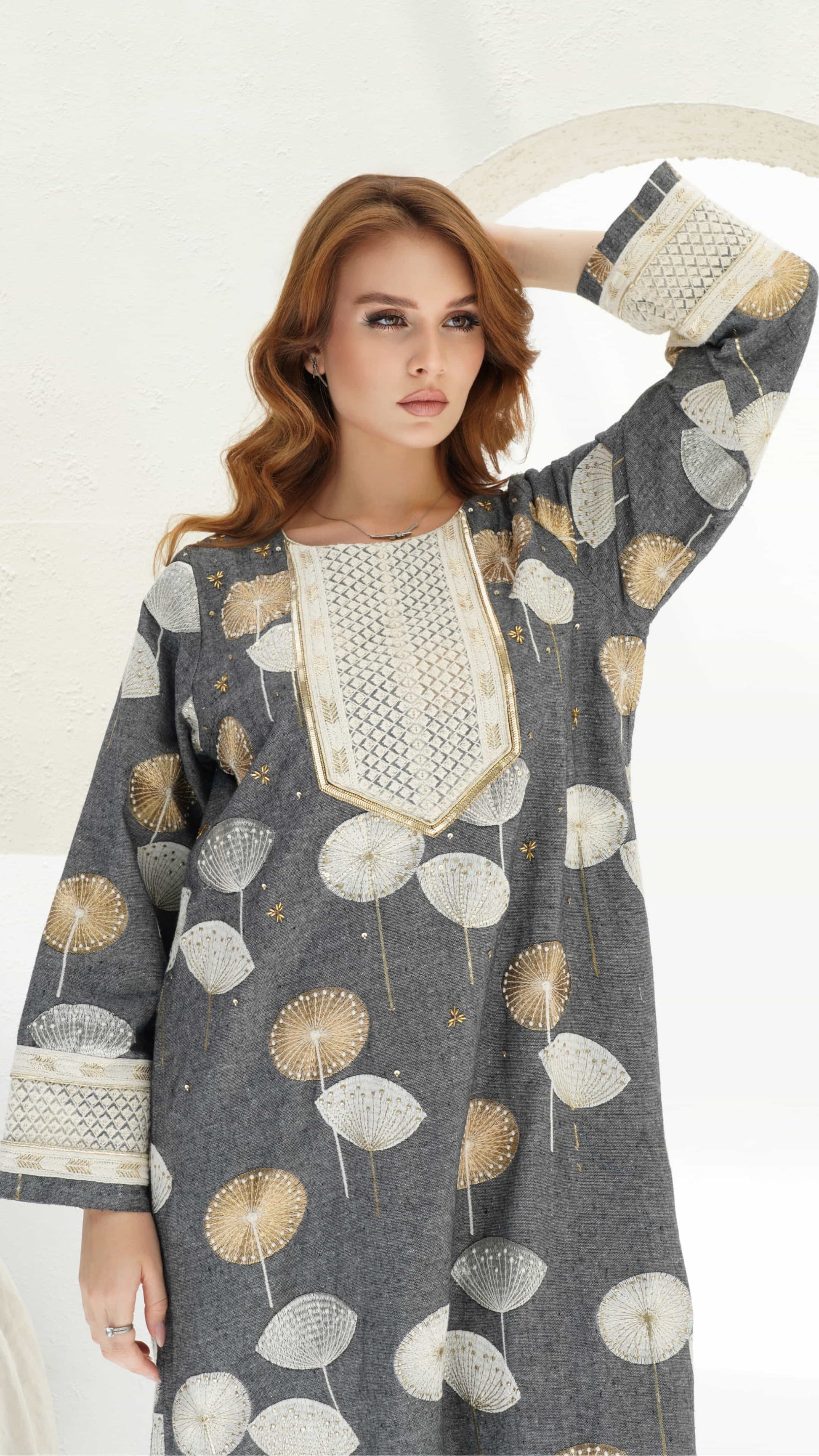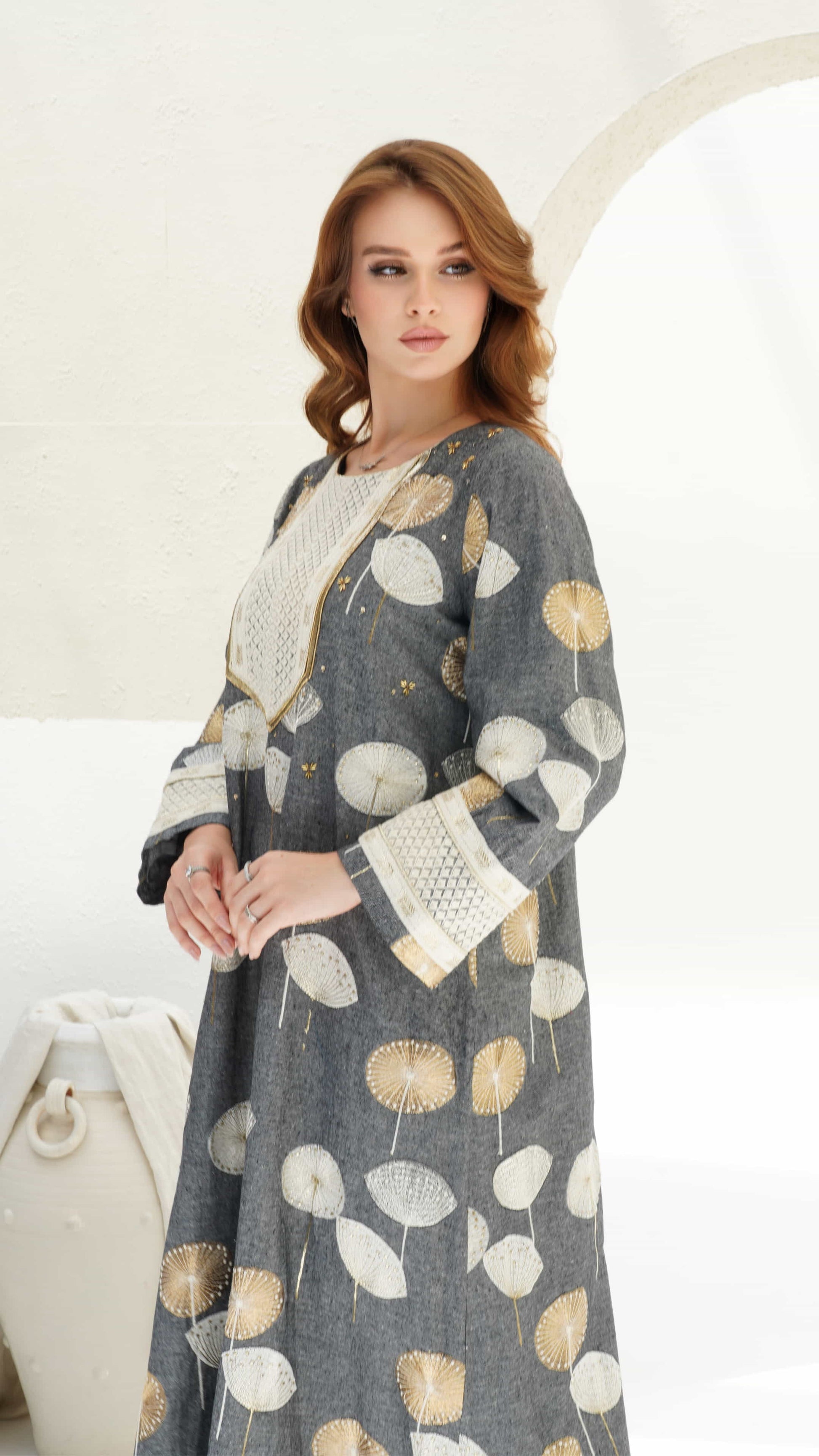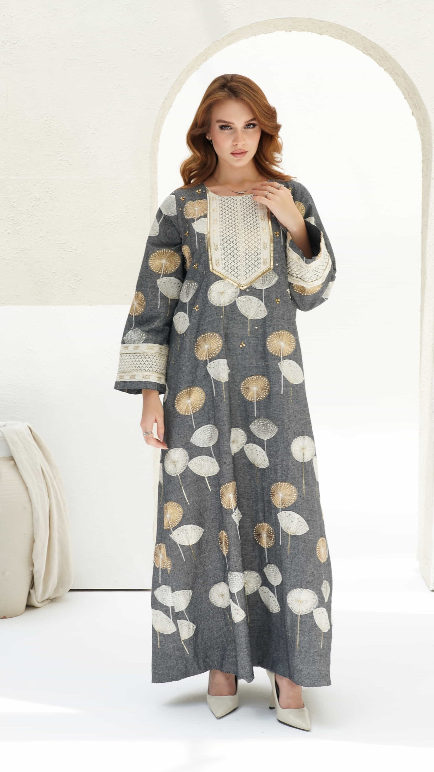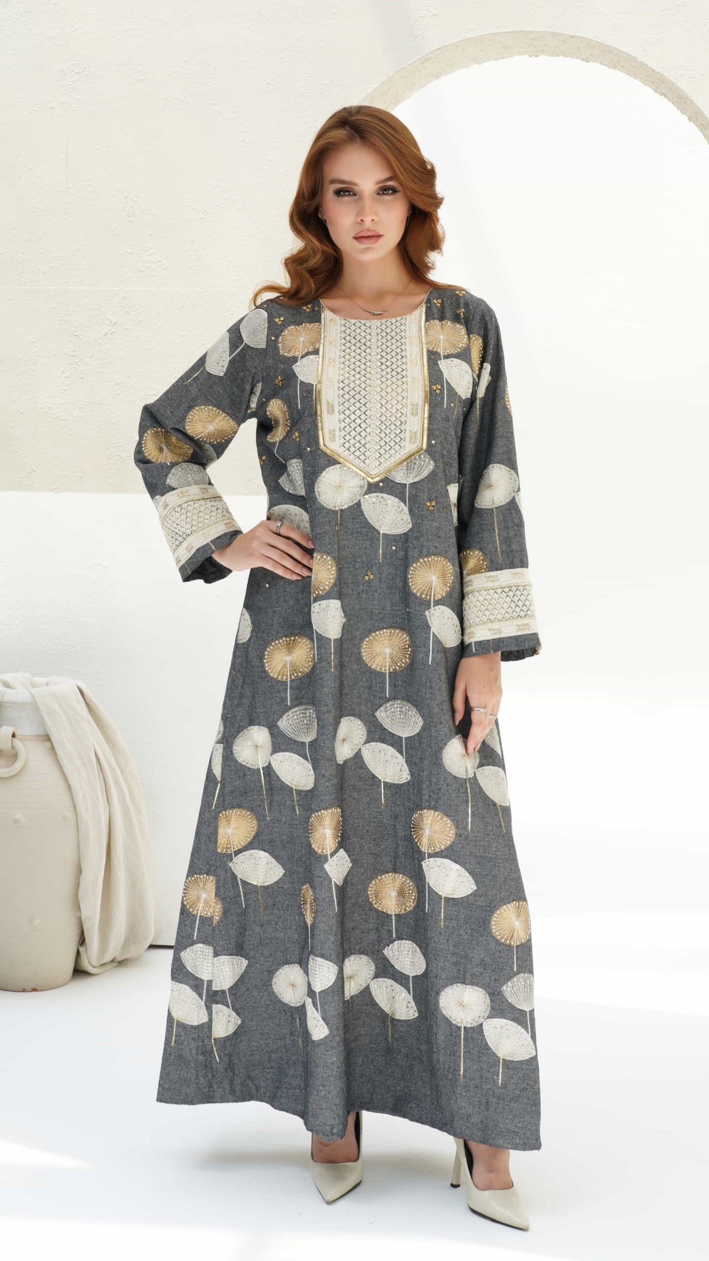 Sawsan is a poetic blend of a charming silhouette with a soft sparkle. The artistic charm of the premium gray 🩶 organic fabric features intricate embellishments in champagne gold ✨ and subtle metallic hues that exudes a contemporary flair effortlessly ⚜️