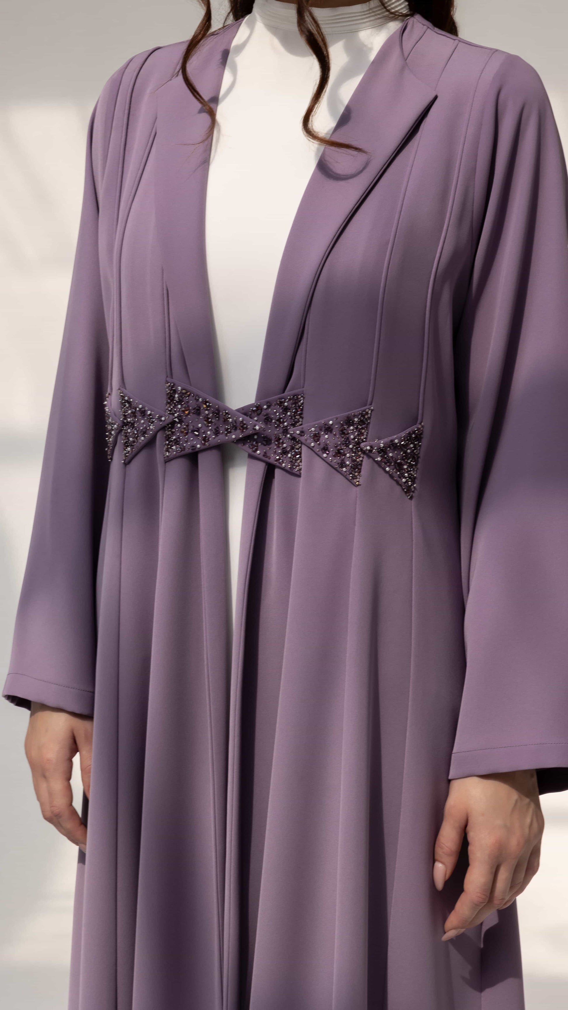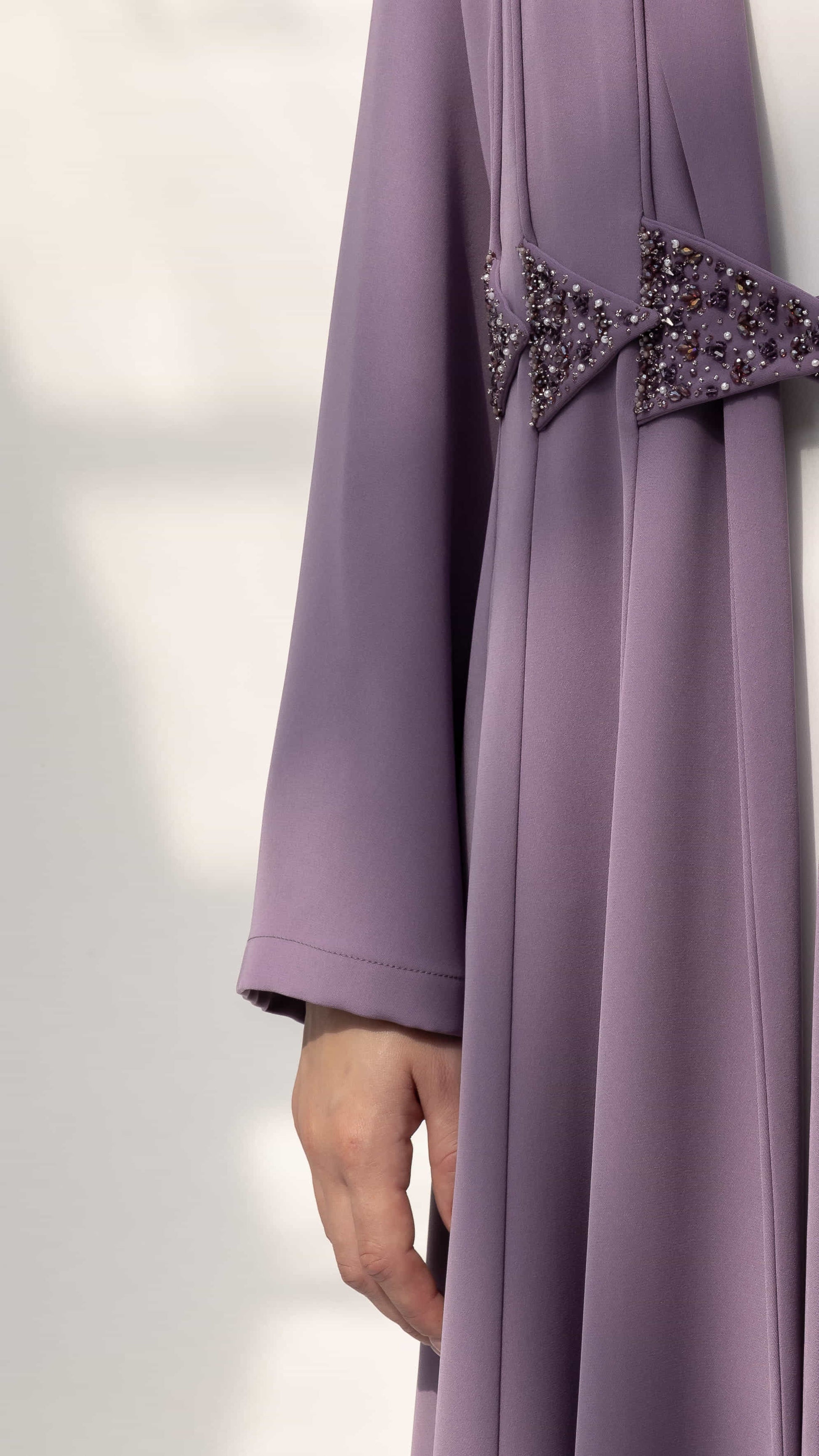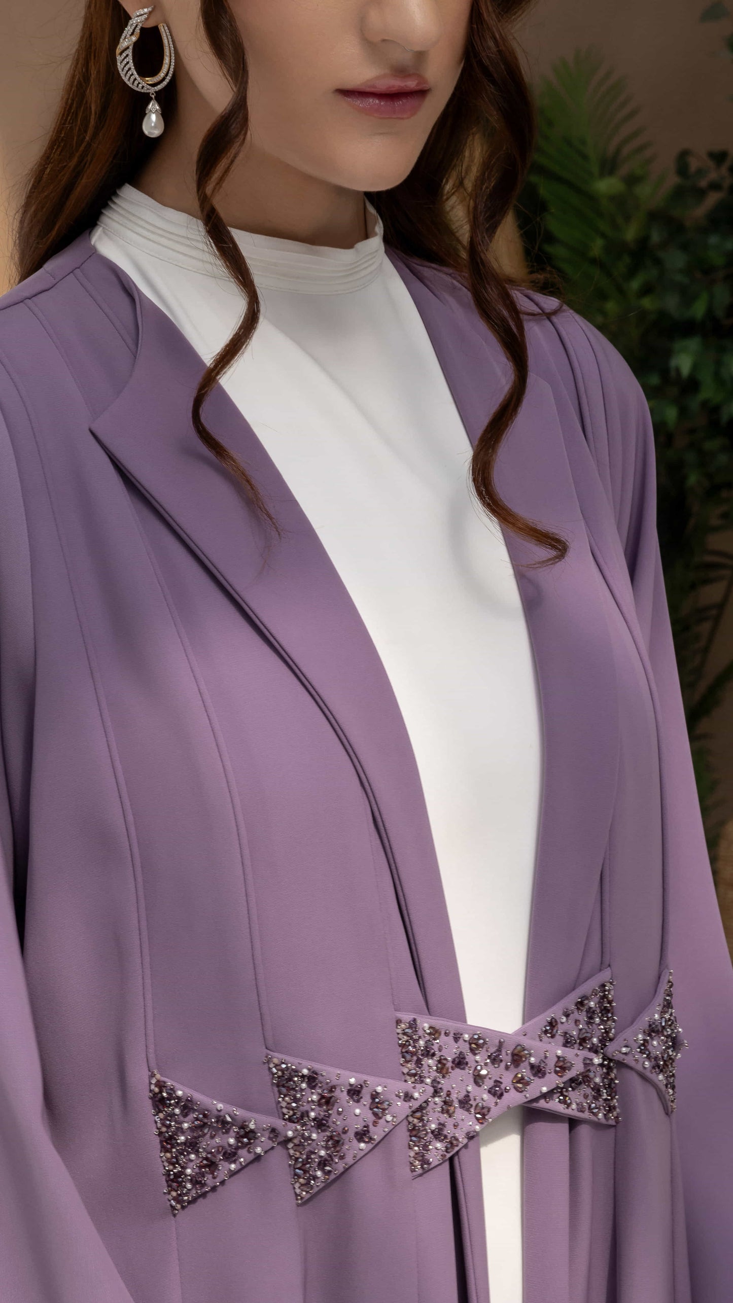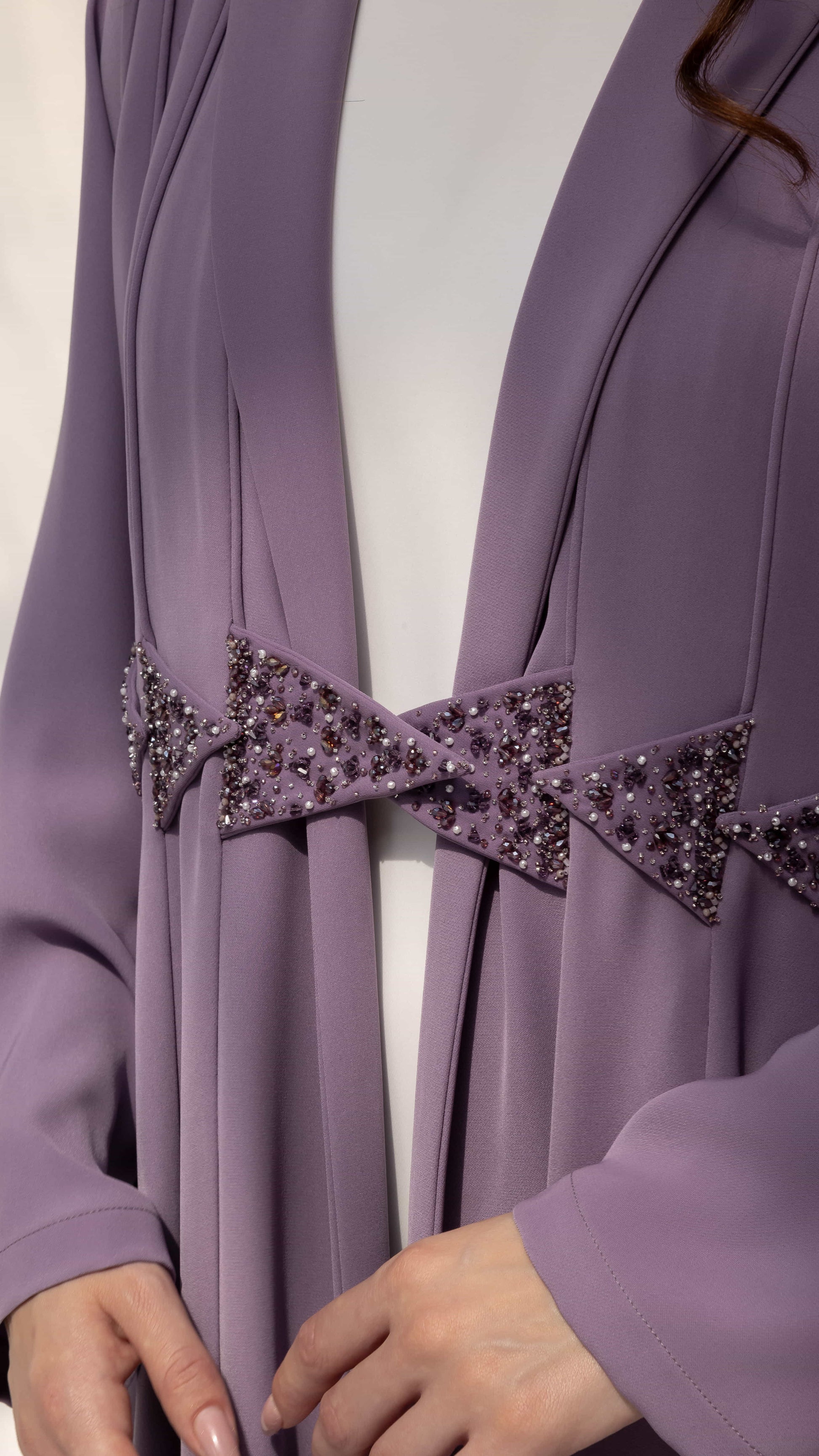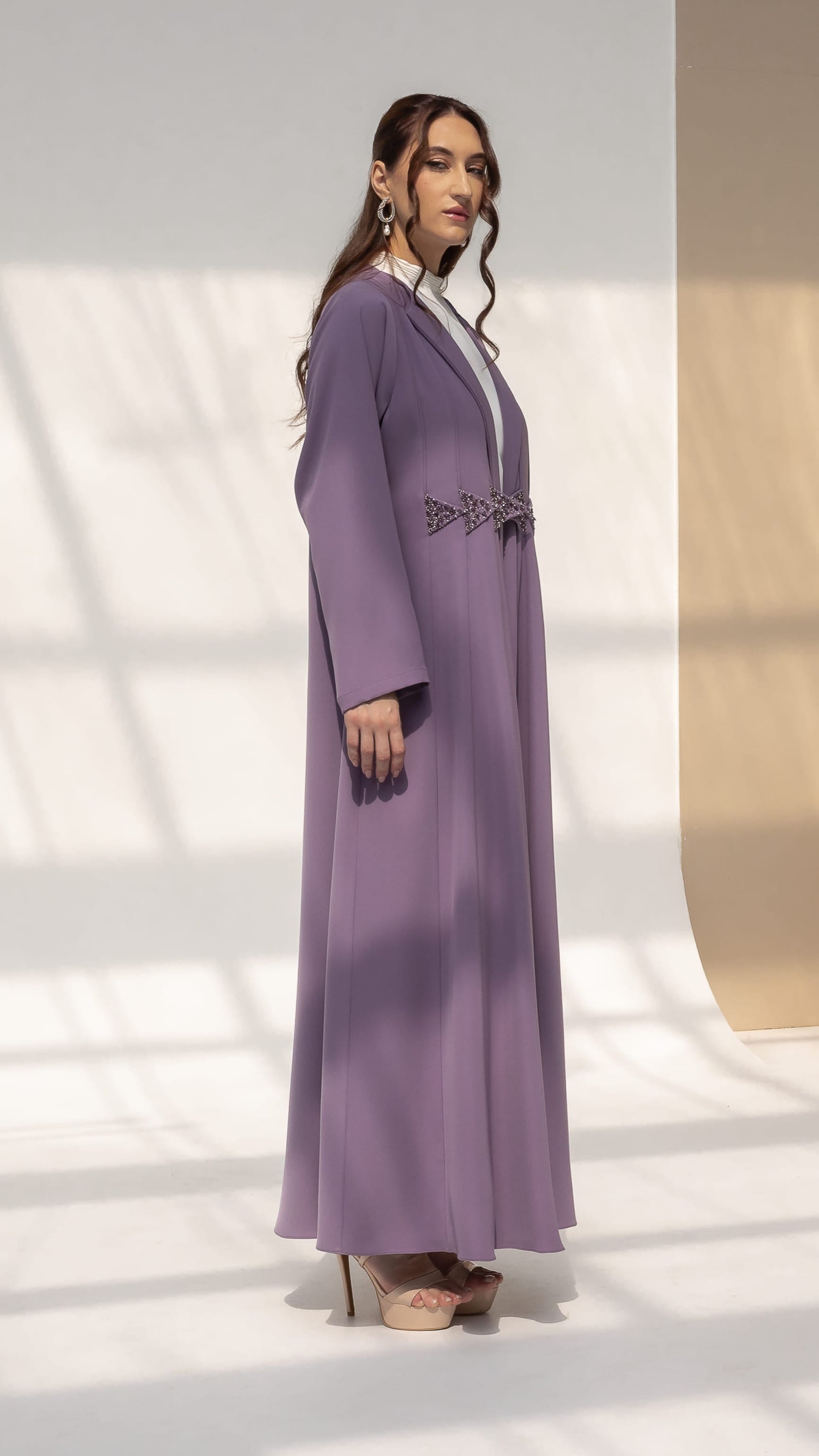 Draped in luxurious lilac hues, Suha is a soft, ethereal abaya that commands attention with its bold, stylish collar and exquisitely embellished waistline