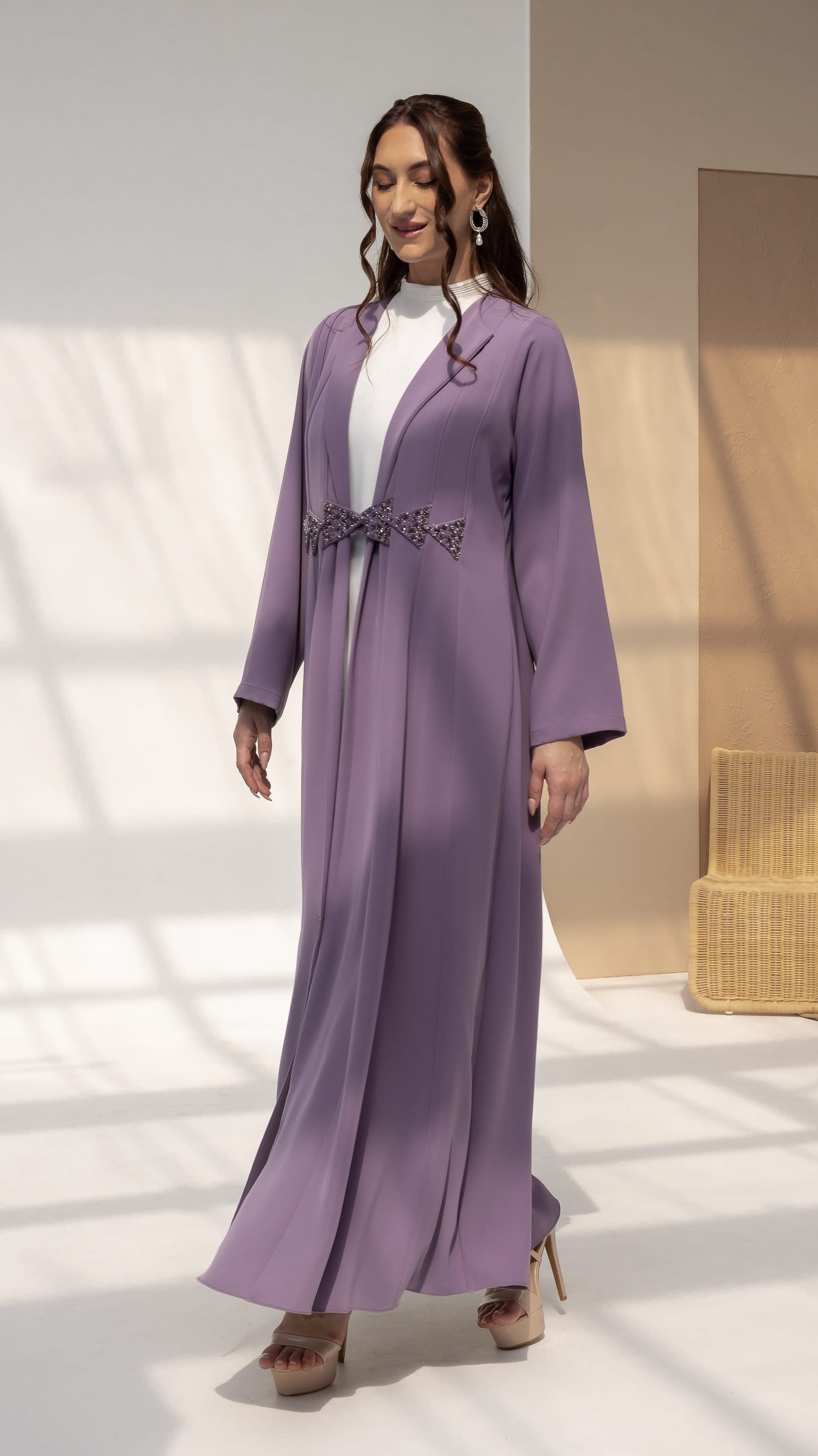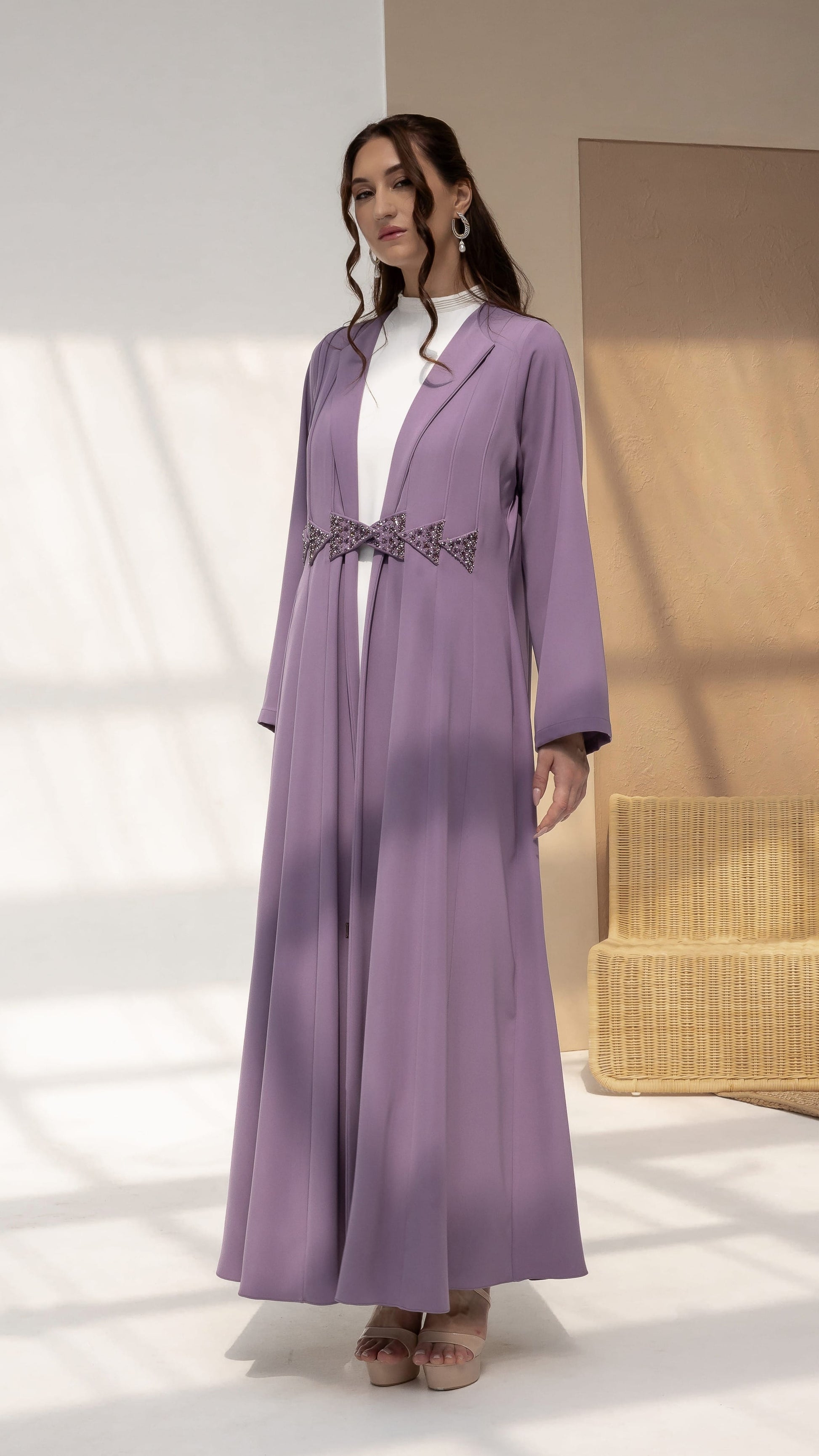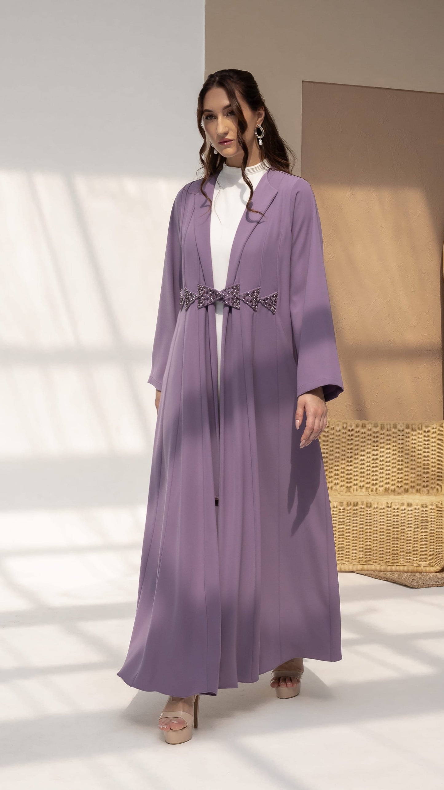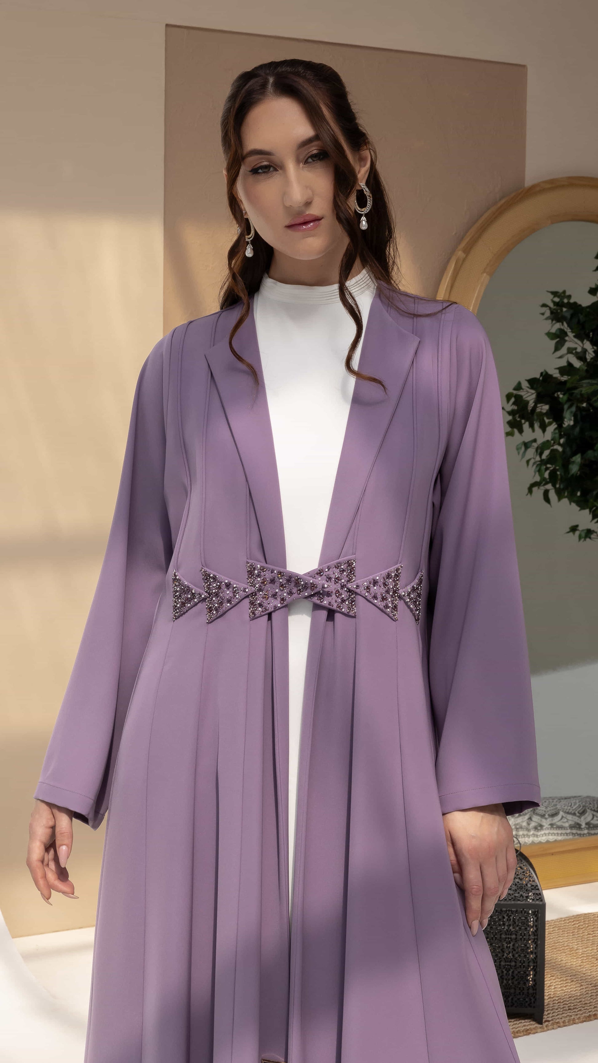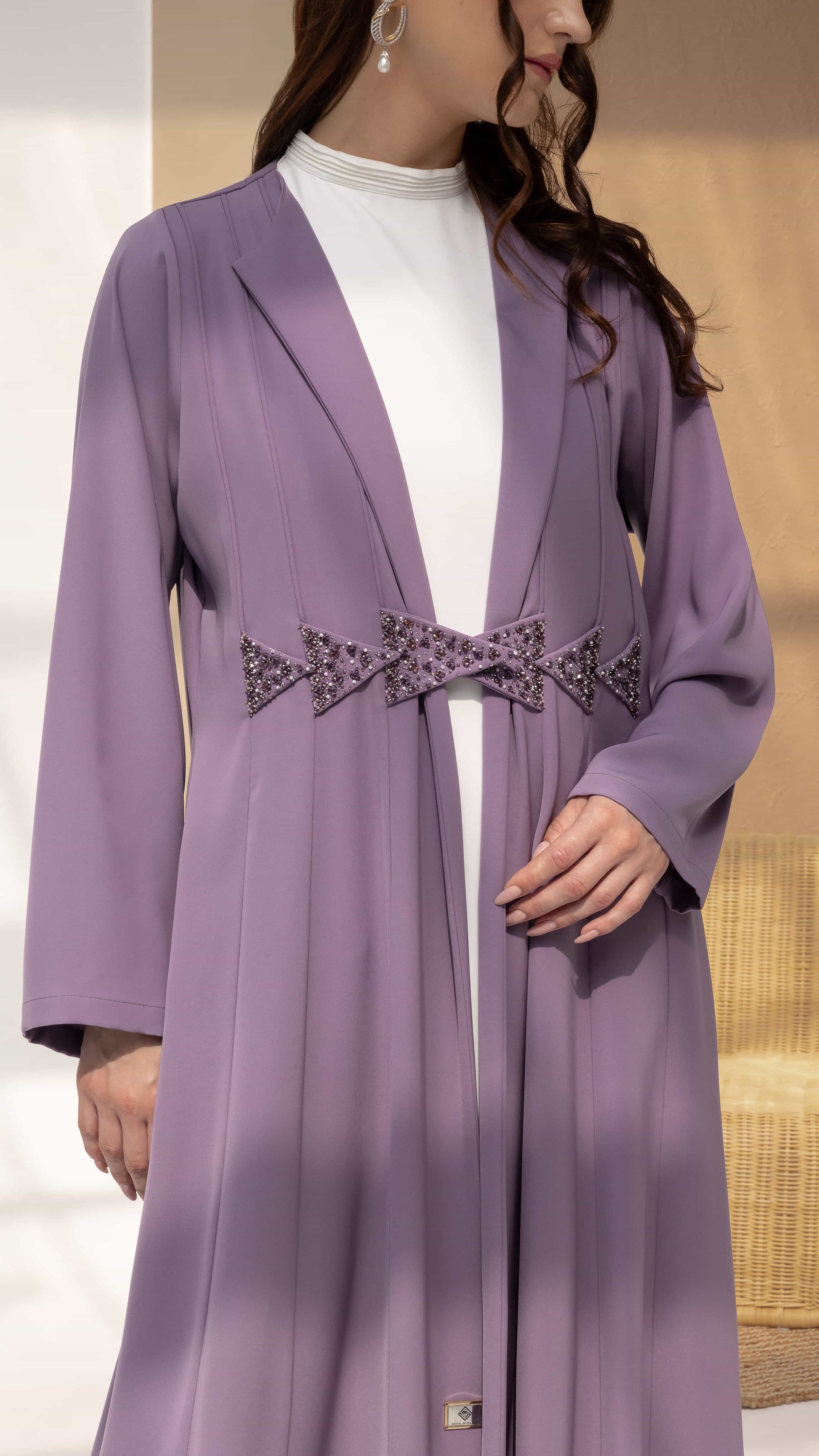 Draped in luxurious lilac hues, Suha is a soft, ethereal abaya that commands attention with its bold, stylish collar and exquisitely embellished waistline