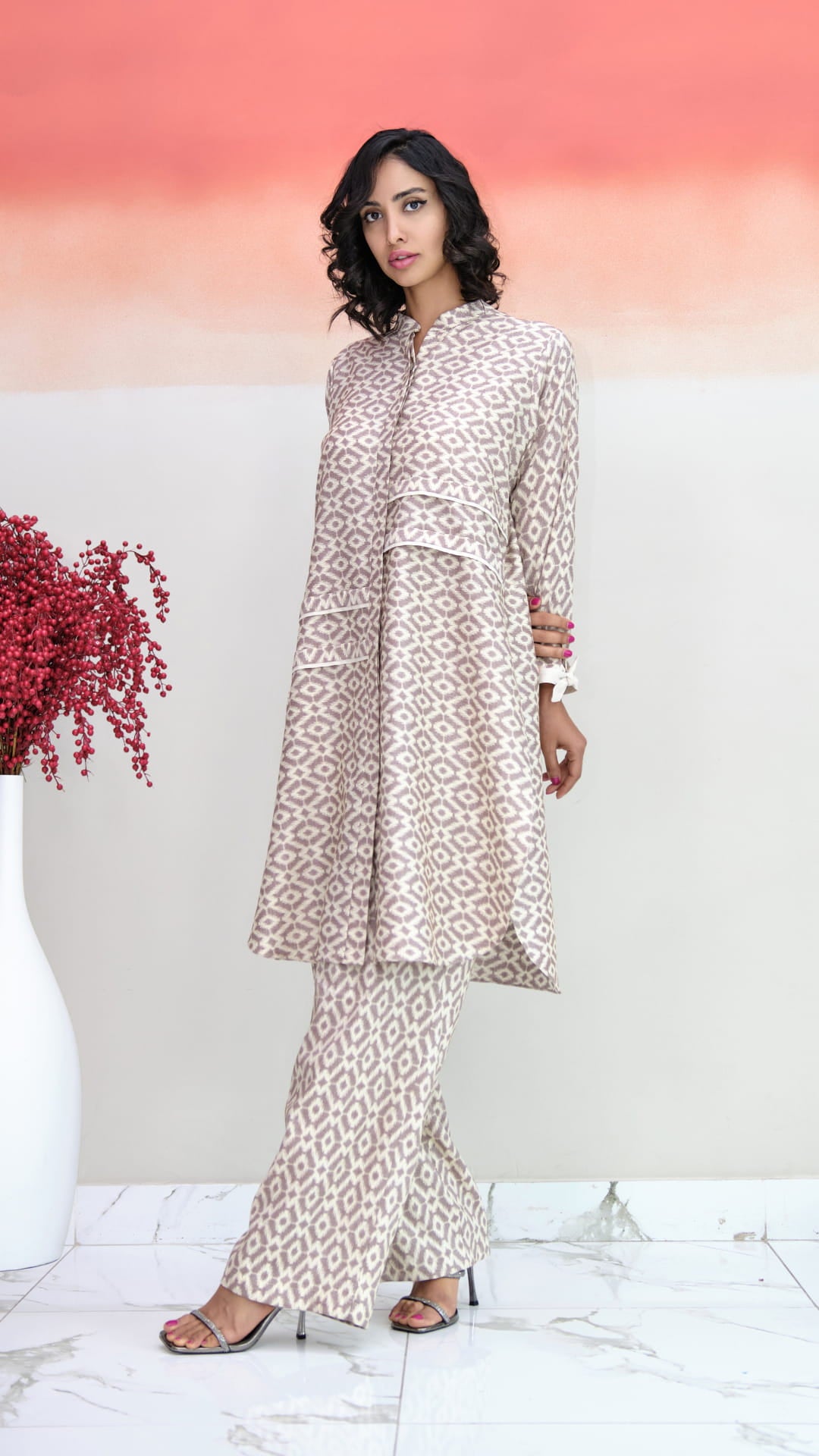 Tala is inspired by the casual summer charm in natural earthy tone featuring a fashionable set of modern, all-over printed design that captures the essence of gentle, swirling sand dunes with subtle gradients of beige and ivory, top is a stylish relaxed-fit blouse with a slightly tailored silhouette, featuring a modest neckline with a tie-up cuffs, with high-waisted pants tailored to comfort and a touch of sophisticated refinement.