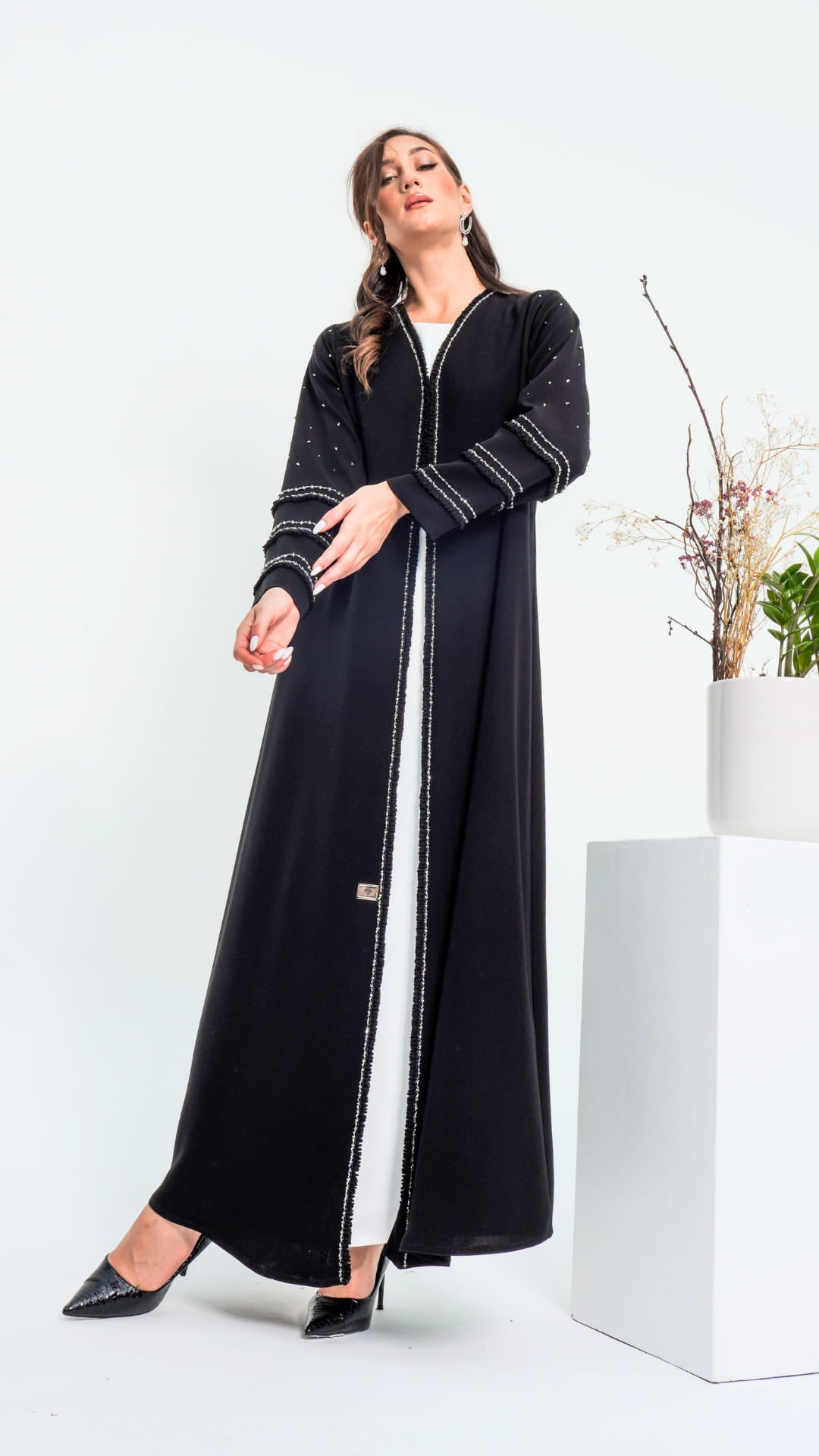 انغمس في جاذبية الرقي مع هذه العباءة الرمادية، التي تبرزها الكريستالات المتلألئة.