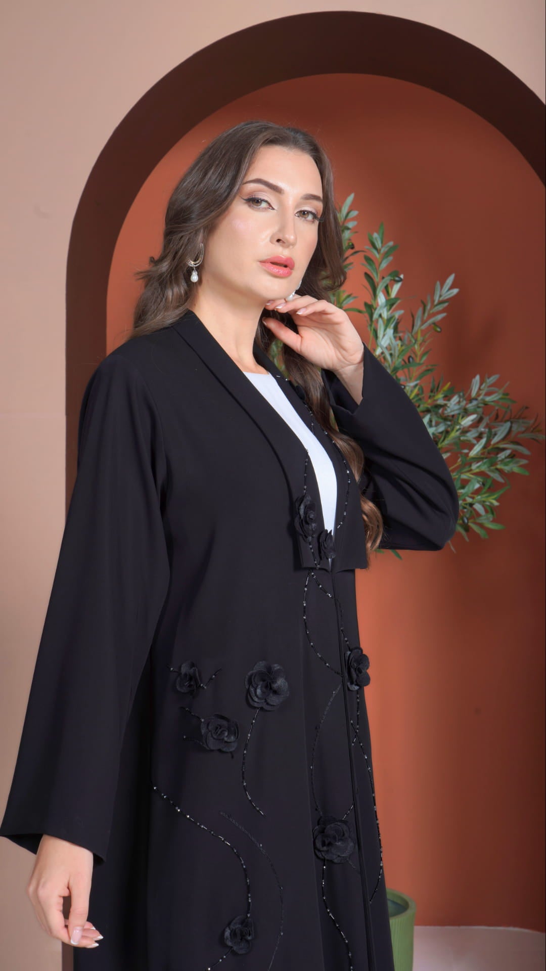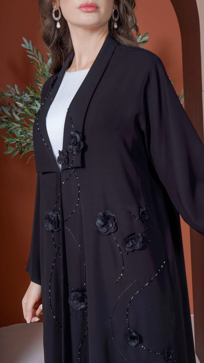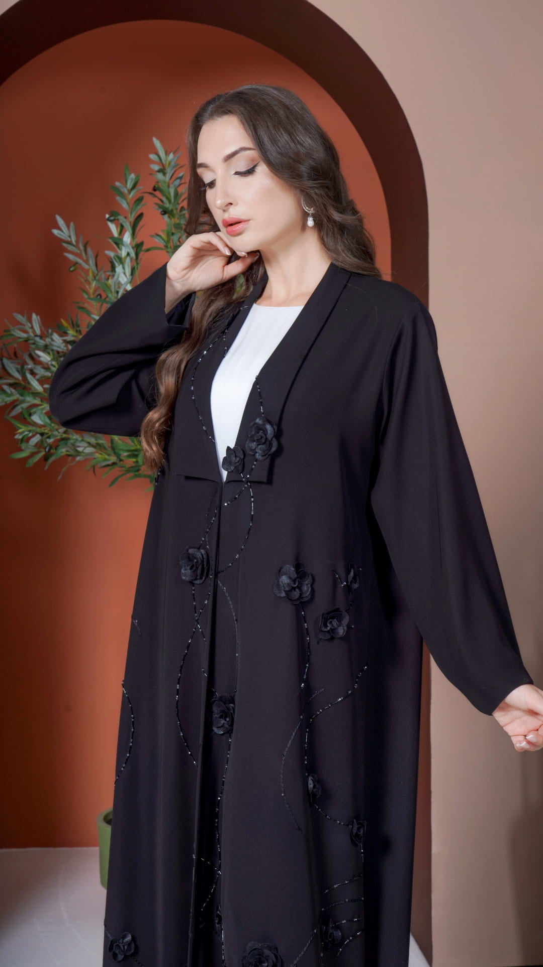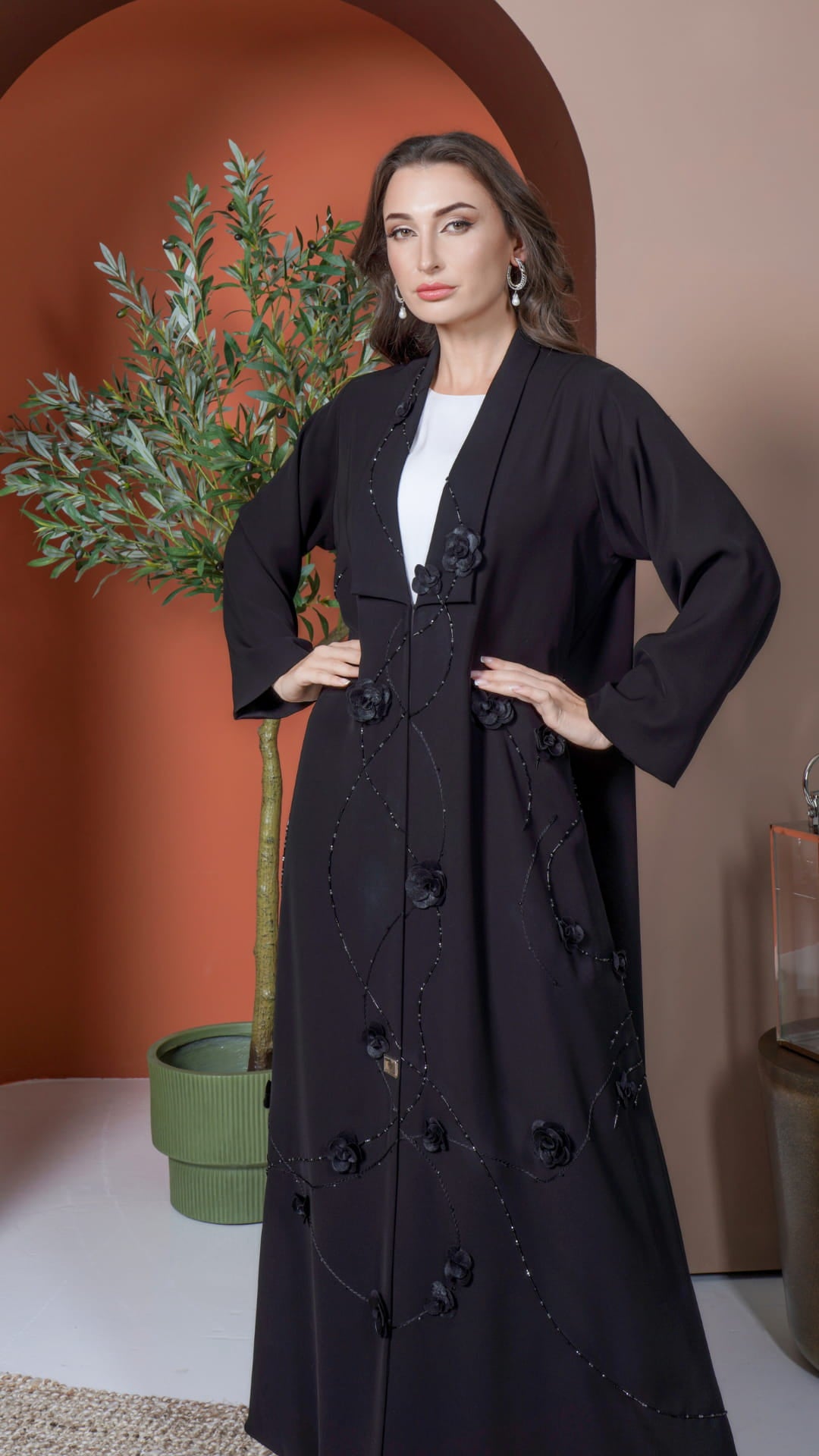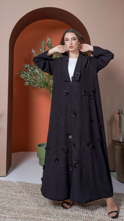 Introducing Yusra, a luxurious black abaya that seamlessly blends tradition with contemporary elegance. Crafted from the finest material, this exotic abaya features intricate 3D motifs meticulously designed to stand out with an air of sophistication.