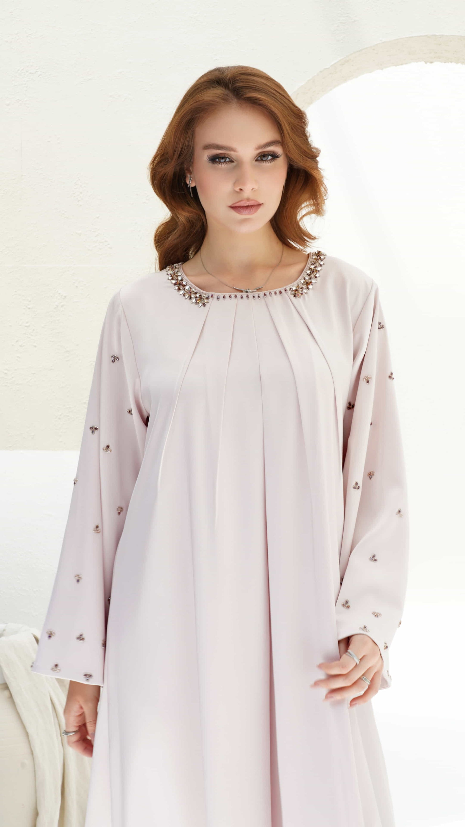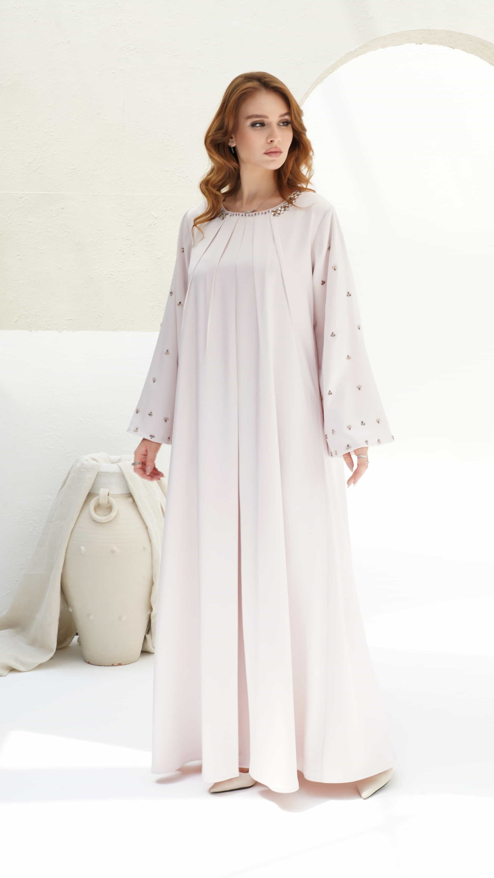 Zahira is pure ethereal elegance 💕 wrapped in a blush-toned masterpiece featuring delicately pleated front panels, wide embellished sleeves 💫 and a neckline adorned with hand-sewn crystal and bead embellishments, like a perfect dream ⚜️