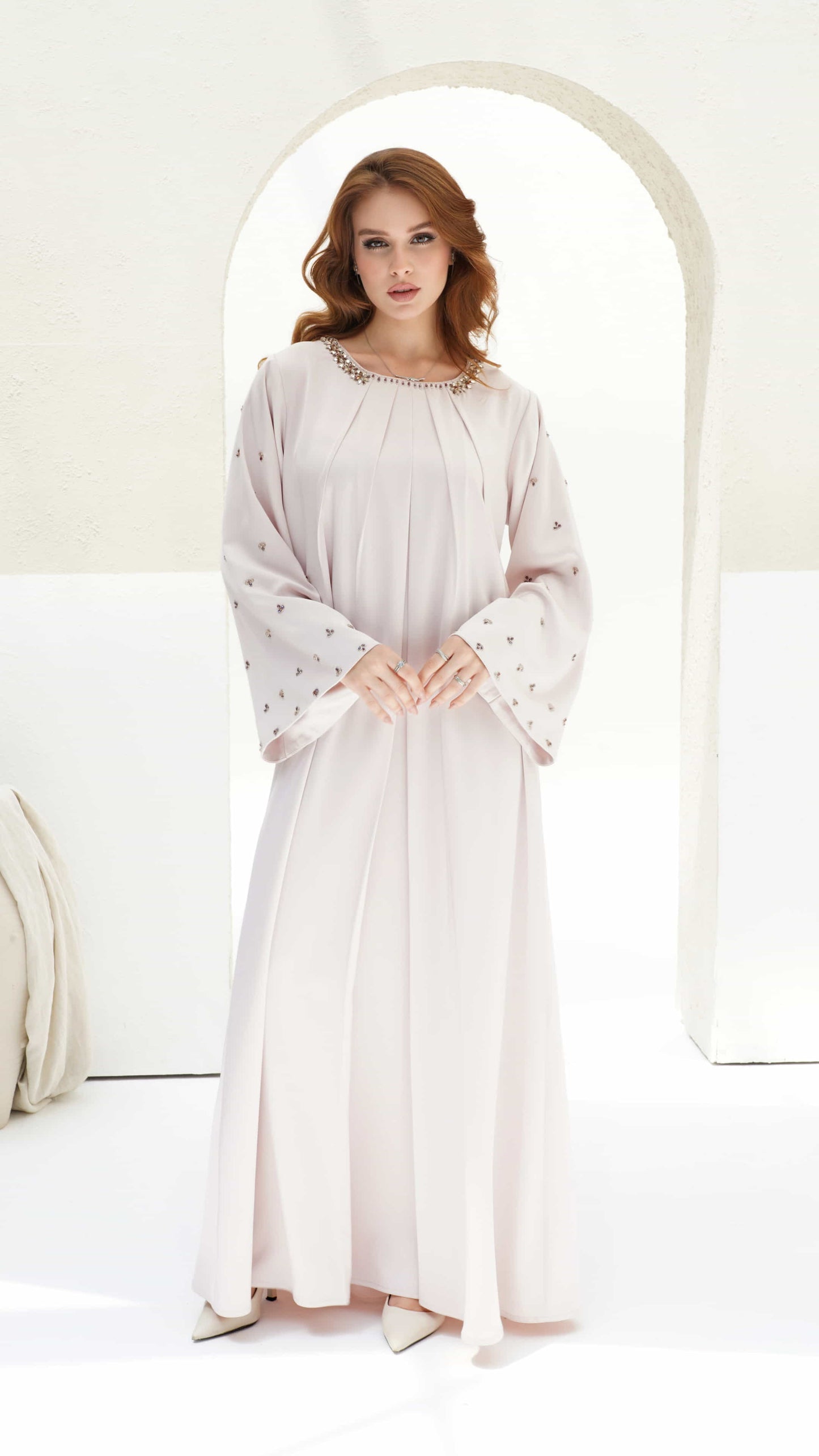 زهيرة، أناقة ساحرة 💕 ملفوفة في تحفة فنية بلون وردي وردي، تتميز بألواح أمامية مطوية بدقة، وأكمام واسعة مزينة 💫، وياقة مزينة بكريستال وخرز مخيط يدويًا، كحلم مثالي ⚜️
